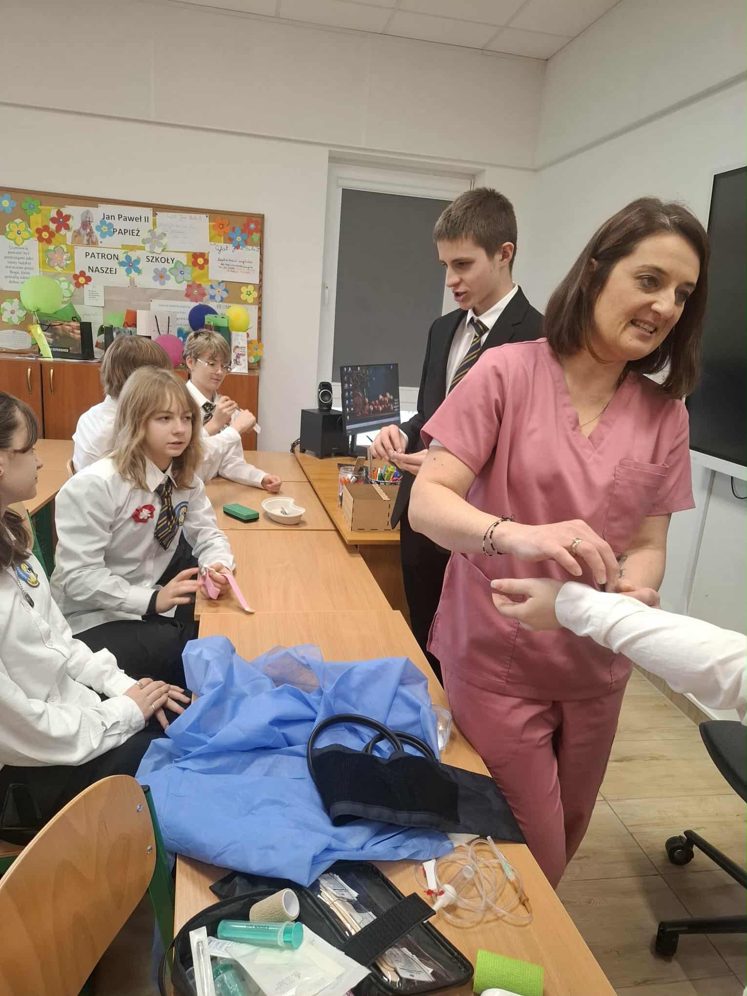 Zajęcia nie obejmowały tylko teorii — młodzi uczestnicy mieli okazję zobaczyć pokaz podłączania kroplówki oraz zapoznać się z różnymi rodzajami strzykawek, które mają różne przeznaczenie. Dzięki temu mogli lepiej zrozumieć, jak wygląda codzienna praca pielęgniarki i pielęgniarza.