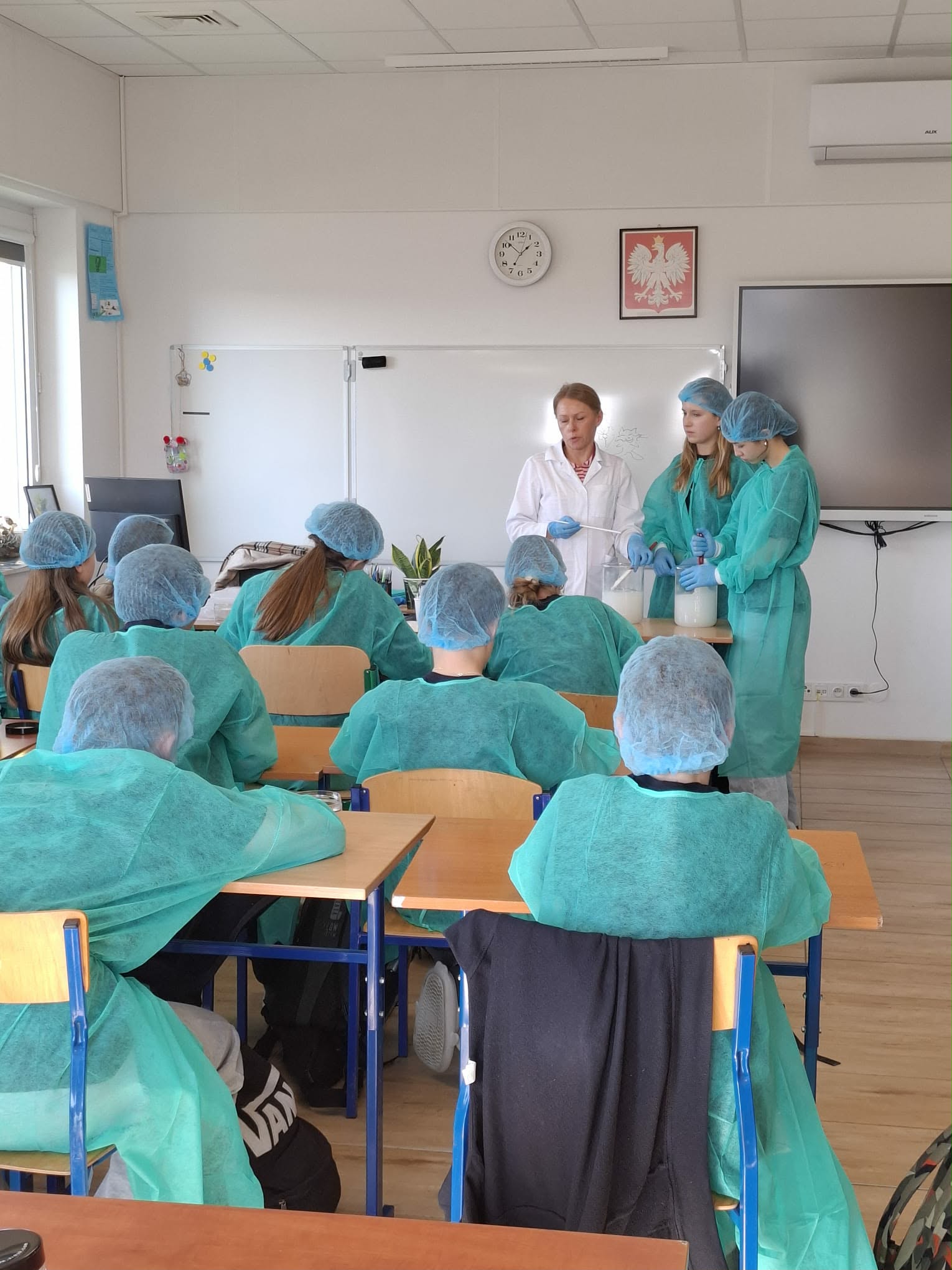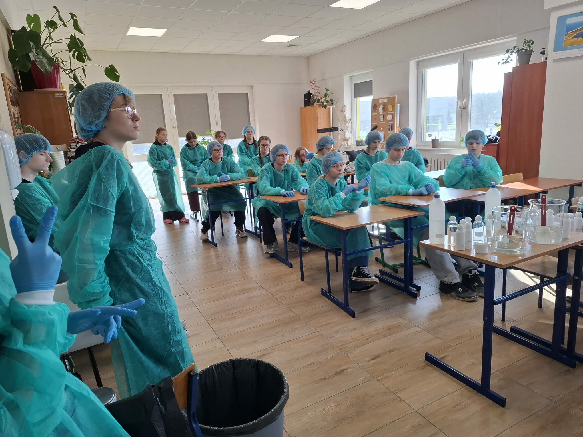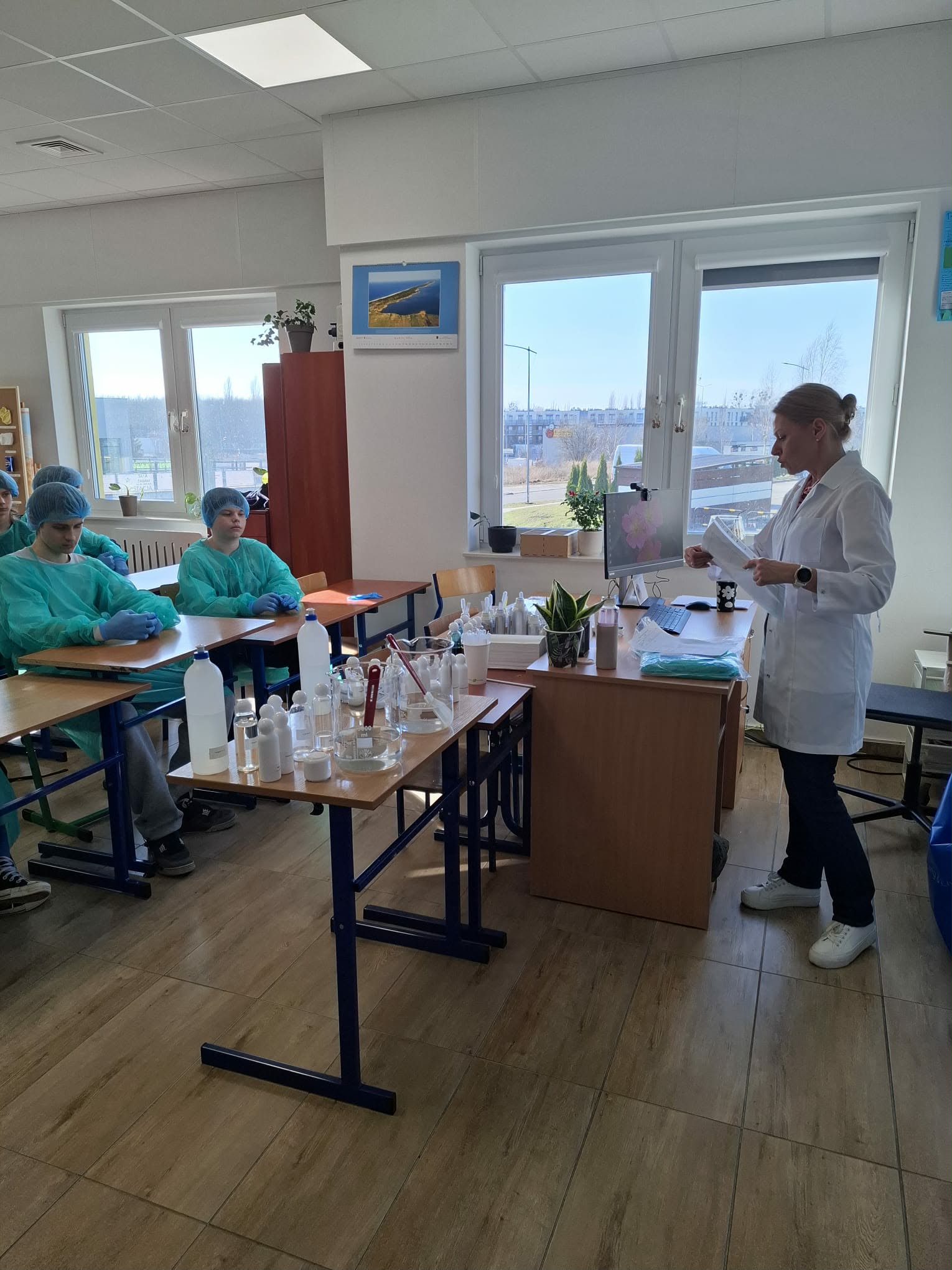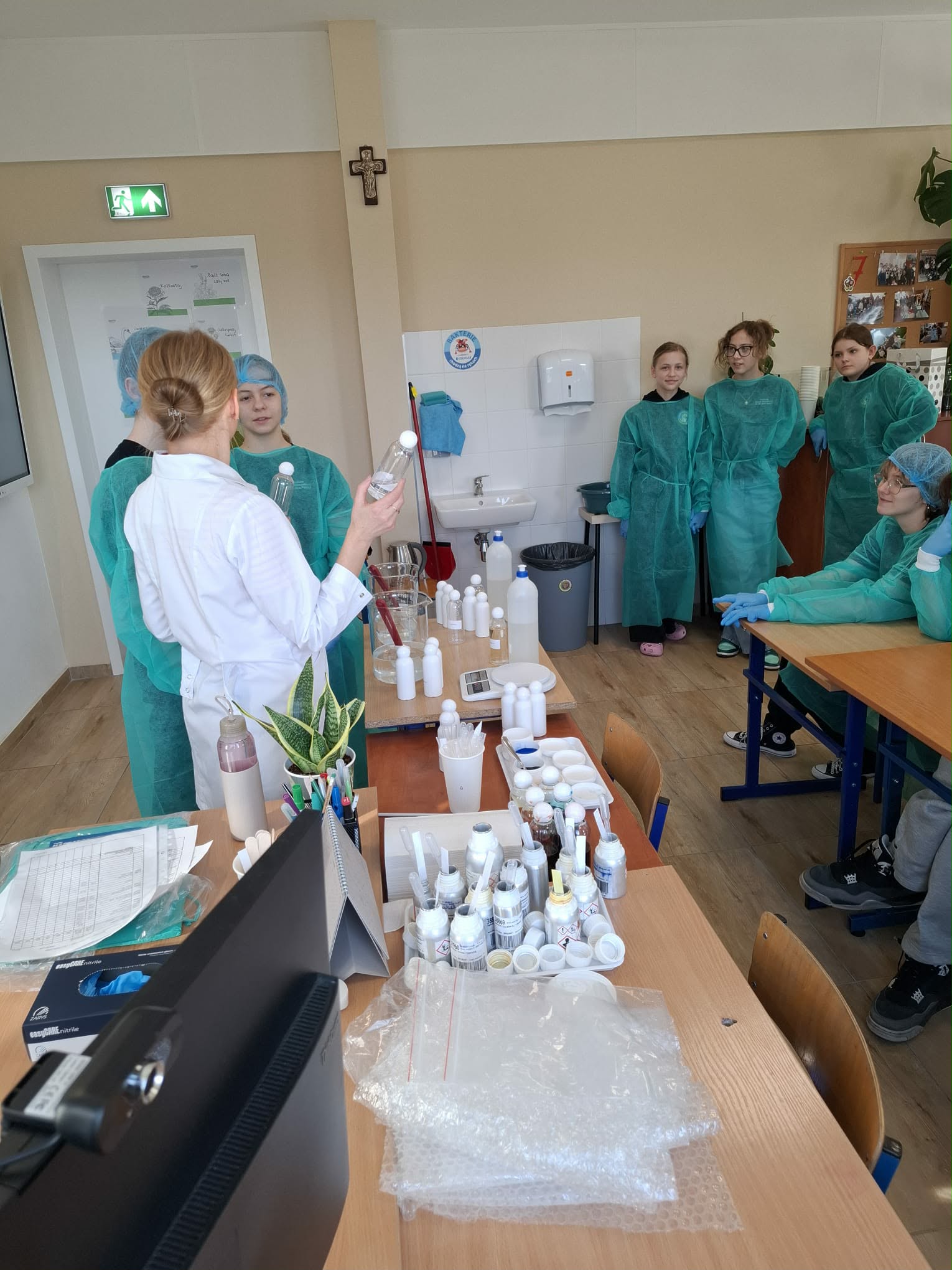 Uczniowie klasy 7 i 8 mieli okazję uczestniczyć w niezwykłych zajęciach, które pozwoliły im zajrzeć do świata prawdziwej pracy laboratoryjnej. Spotkanie było możliwe dzięki mamie Michaliny, która na co dzień pracuje w laboratorium firmy Ziaja. Dzięki niej uczniowie mogli poznać, jak wygląda proces powstawania kosmetyków – od pomysłu aż po gotowy produkt.