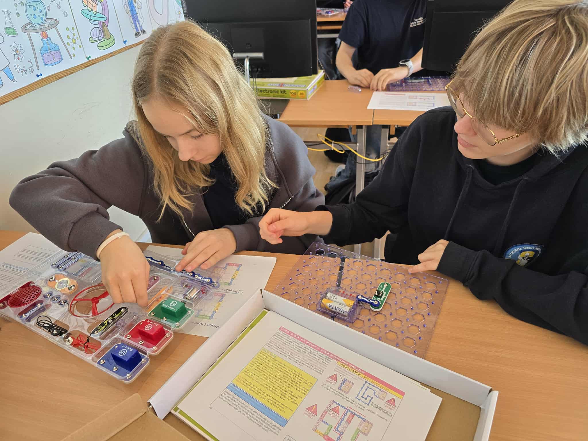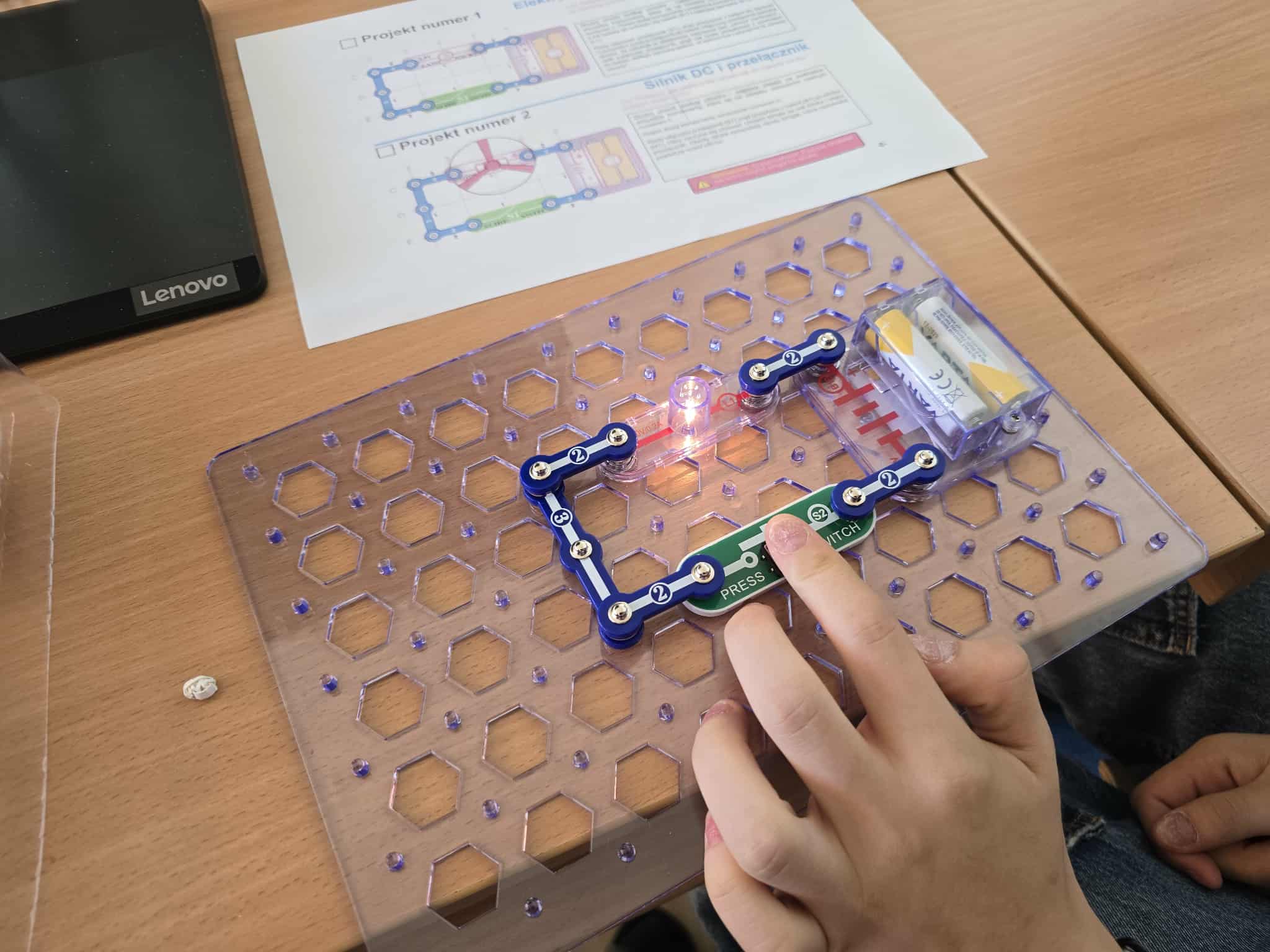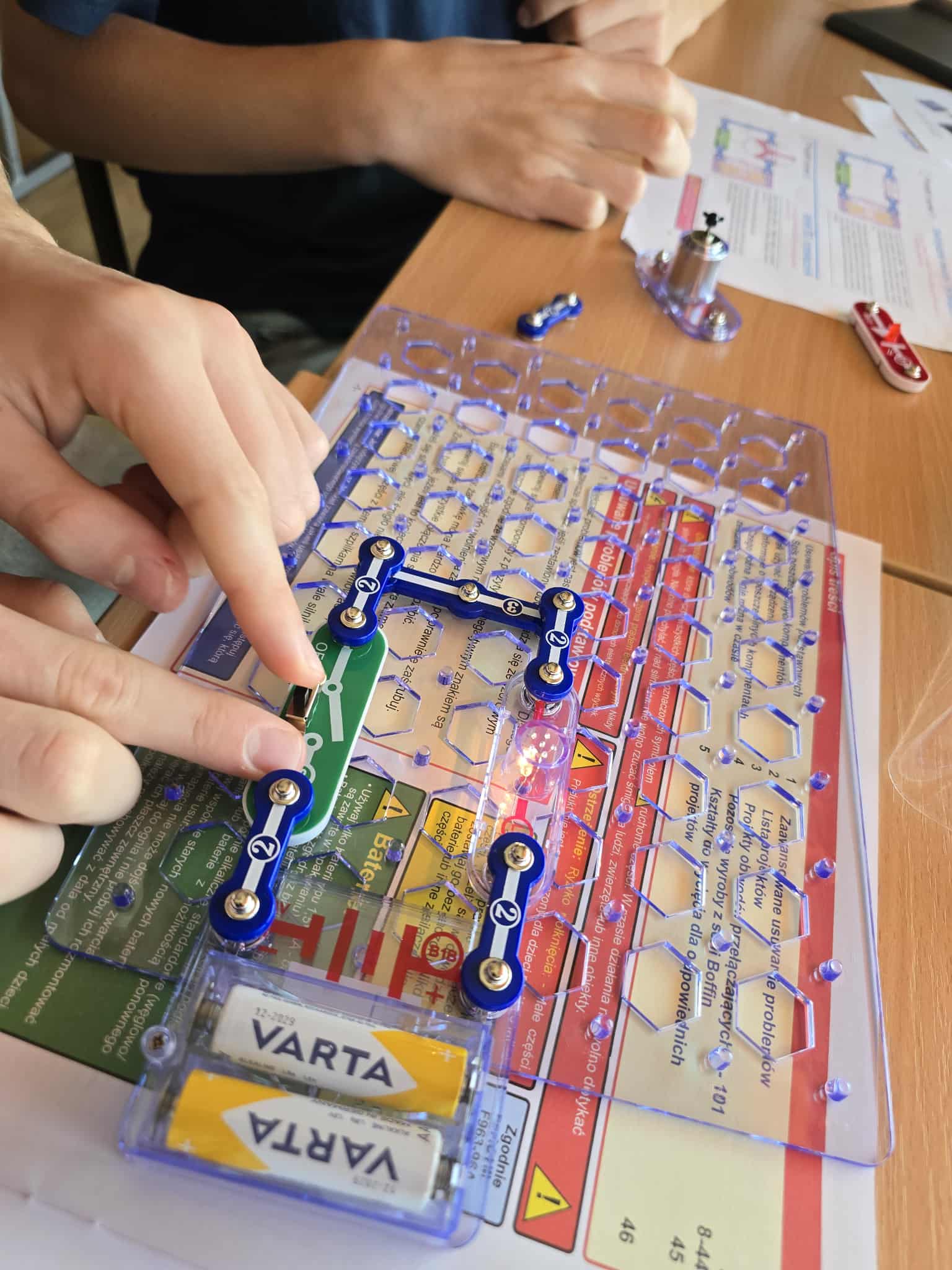 Najważniejszą częścią lekcji była jednak praktyka. Uczniowie podzieleni na grupy, przystąpili do budowy rozmaitych układów elektrycznych. Wykorzystując elementy z zestawów "Małego Elektronika" - baterie, żarówki, diody LED, rezystory, przewody i przełączniki - konstruowali obwody szeregowe i równoległe. Dzięki temu, na własnej skórze mogli doświadczyć różnic w działaniu tych układów i zrozumieć, jak wpływają one na natężenie światła w żarówkach czy działanie urządzeń.