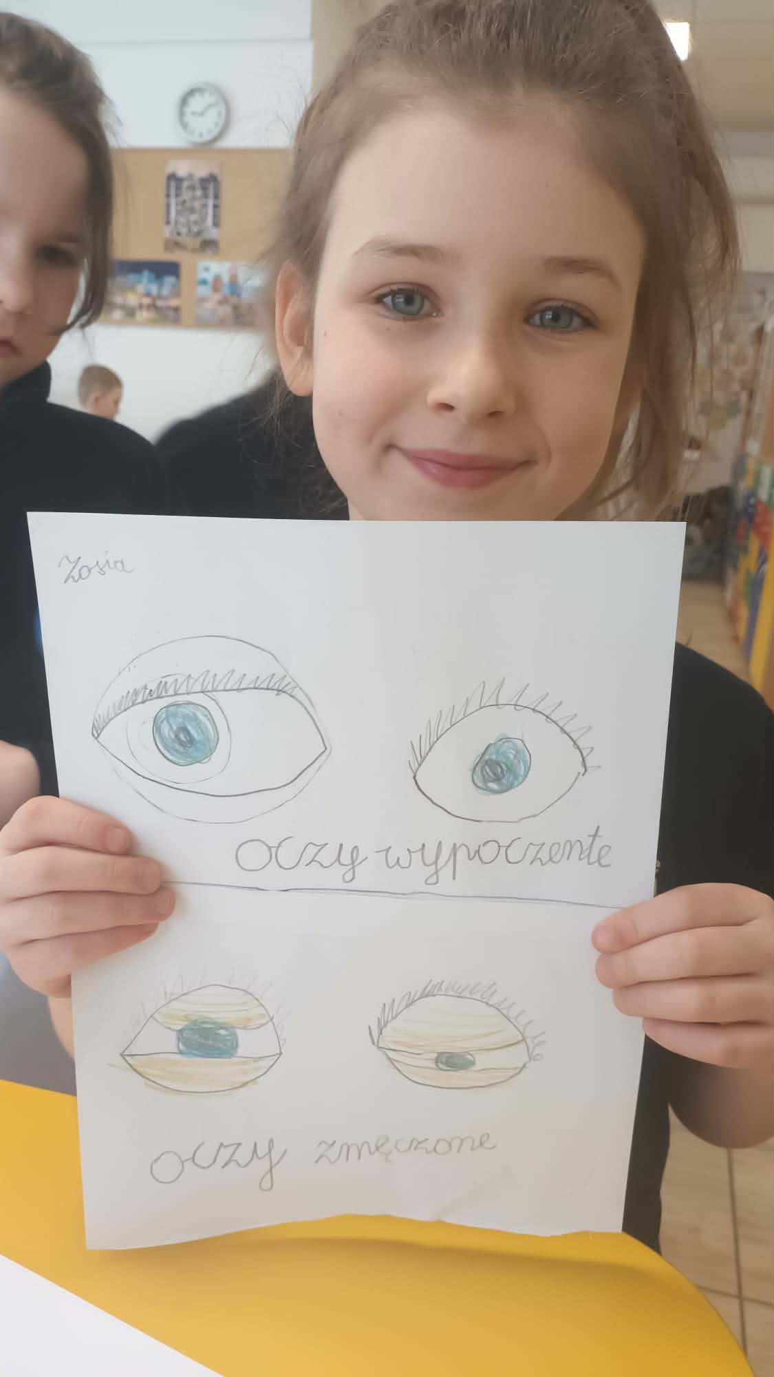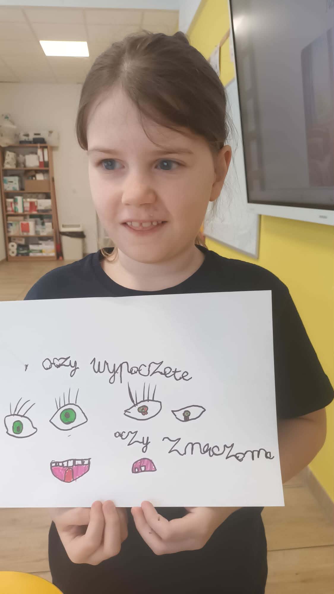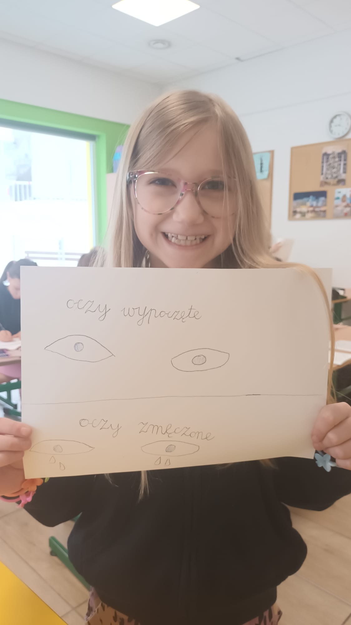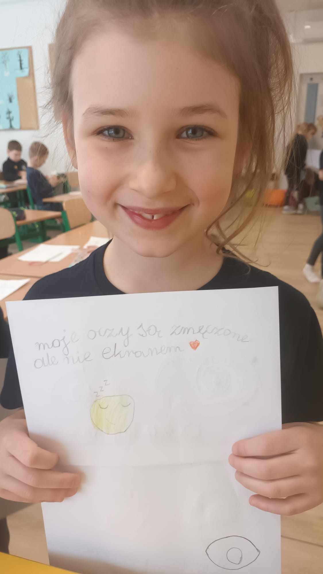 Kulminacją zajęć było wykonanie kreatywnej pracy plastycznej. Dzieci miały za zadanie narysować oczy – jedne zmęczone, a drugie wypoczęte. To zadanie miało na celu uświadomienie im, jak ważny jest odpoczynek dla oczu i ciała. Zmęczone oczy, narysowane w odcieniach szarości i fioletu, symbolizowały nadmierne korzystanie z urządzeń, podczas gdy wypoczęte oczy, pełne kolorów i blasku, odzwierciedlały radość i energię płynącą z aktywności poza ekranem.