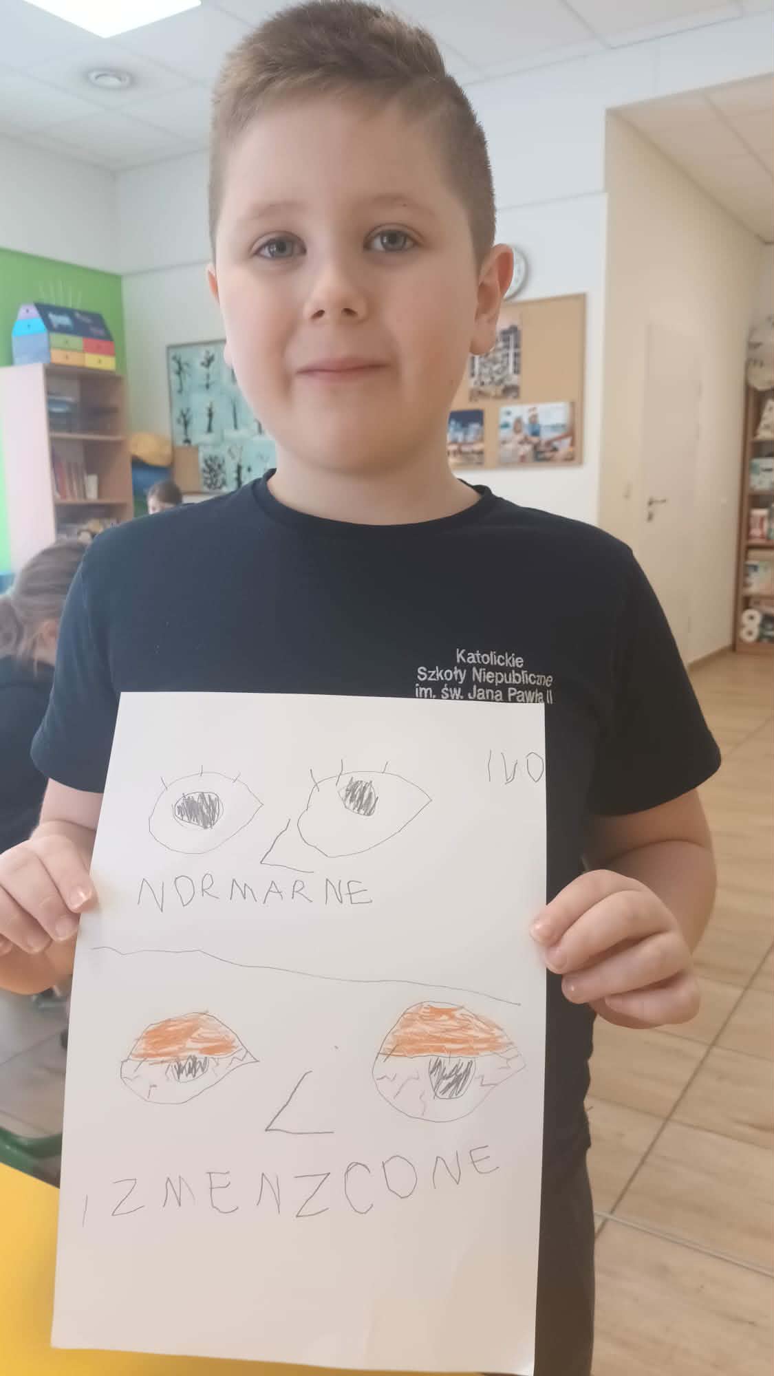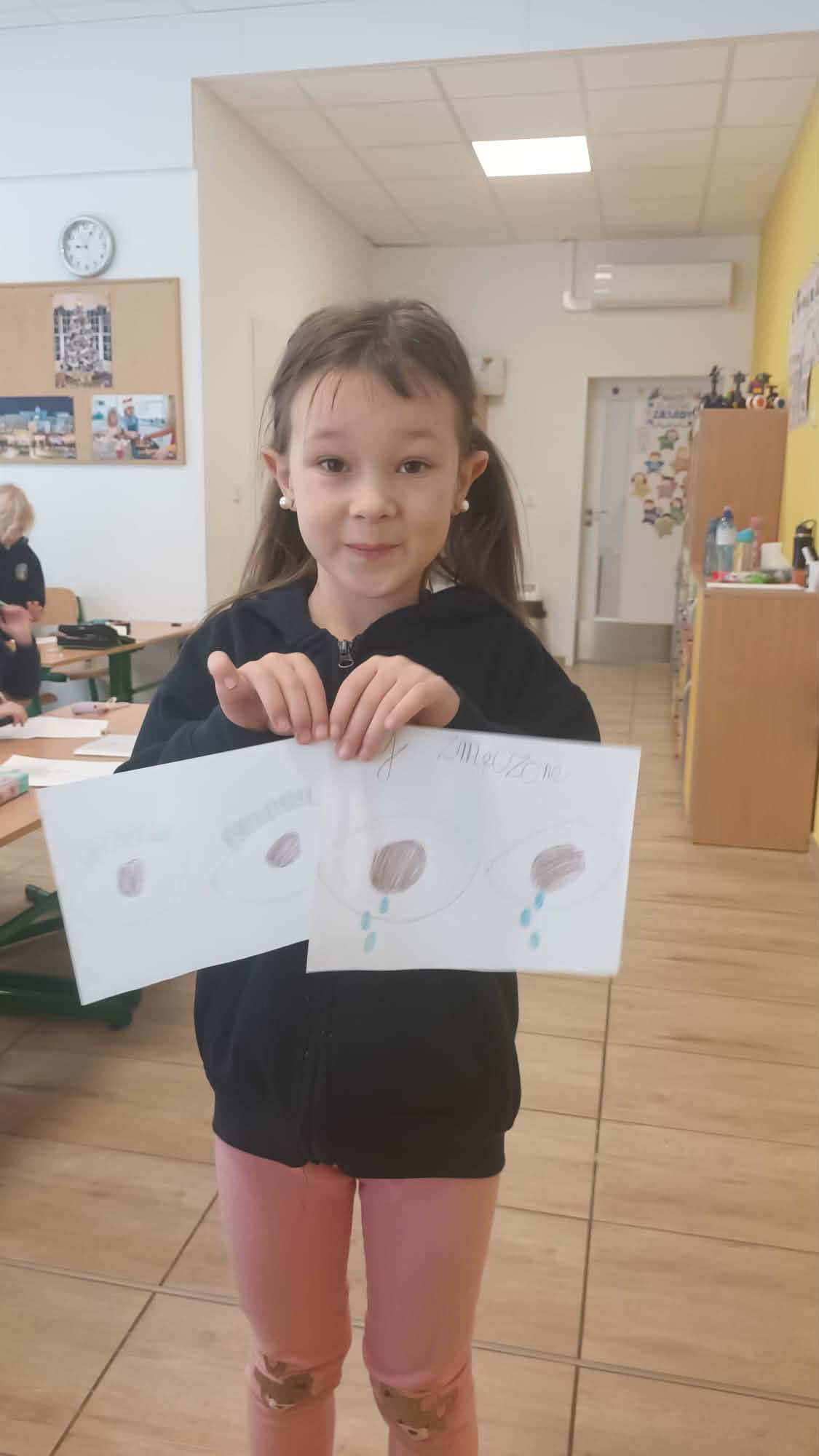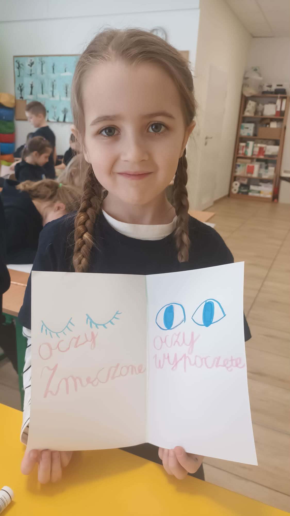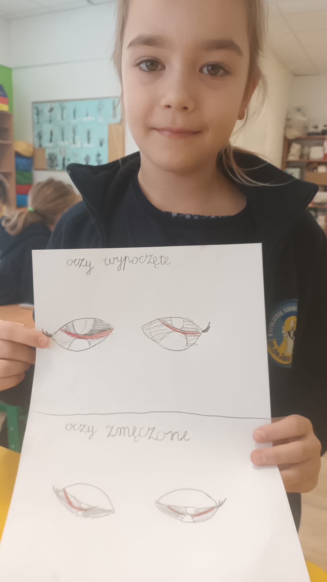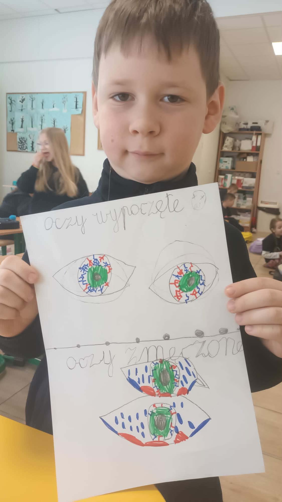 Kulminacją zajęć było wykonanie kreatywnej pracy plastycznej. Dzieci miały za zadanie narysować oczy – jedne zmęczone, a drugie wypoczęte. To zadanie miało na celu uświadomienie im, jak ważny jest odpoczynek dla oczu i ciała. Zmęczone oczy, narysowane w odcieniach szarości i fioletu, symbolizowały nadmierne korzystanie z urządzeń, podczas gdy wypoczęte oczy, pełne kolorów i blasku, odzwierciedlały radość i energię płynącą z aktywności poza ekranem.