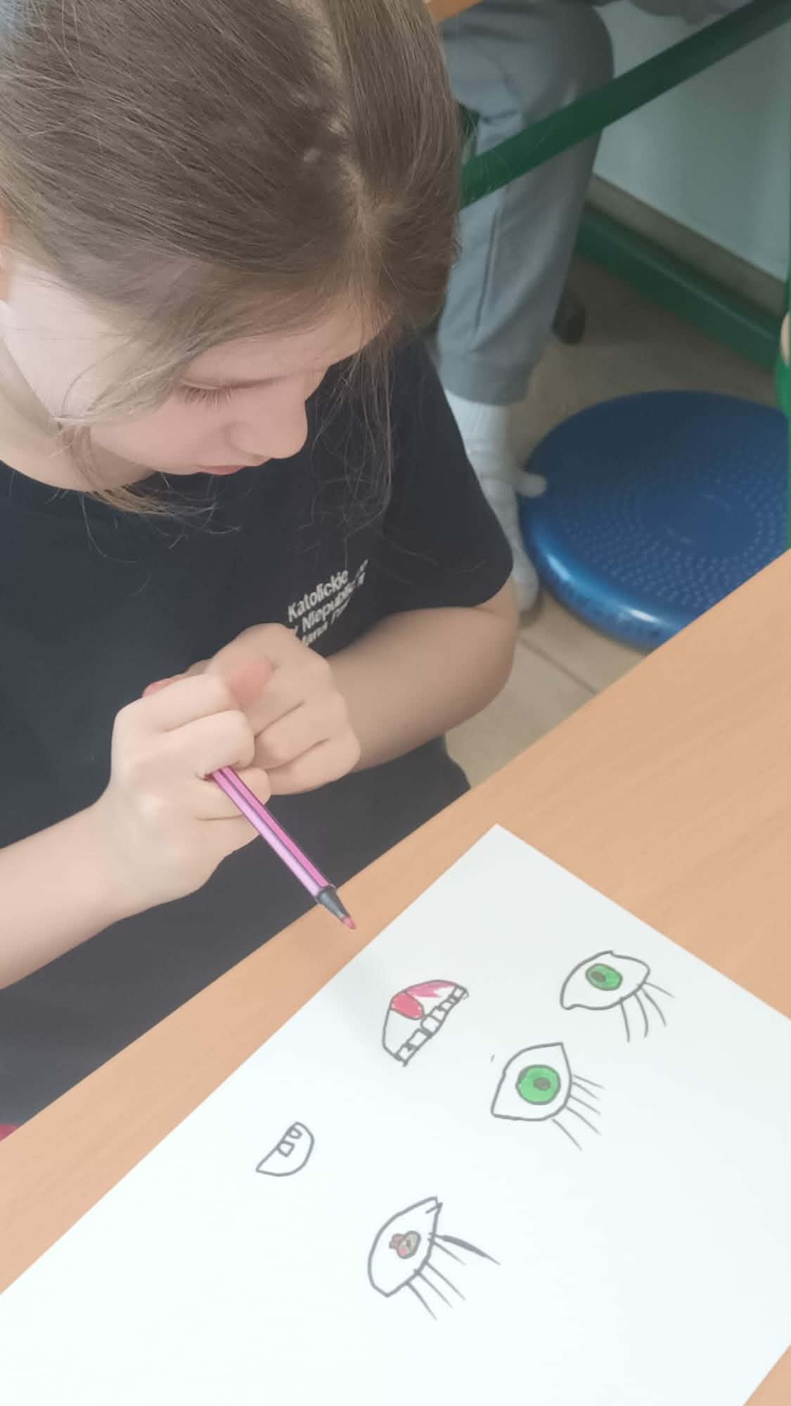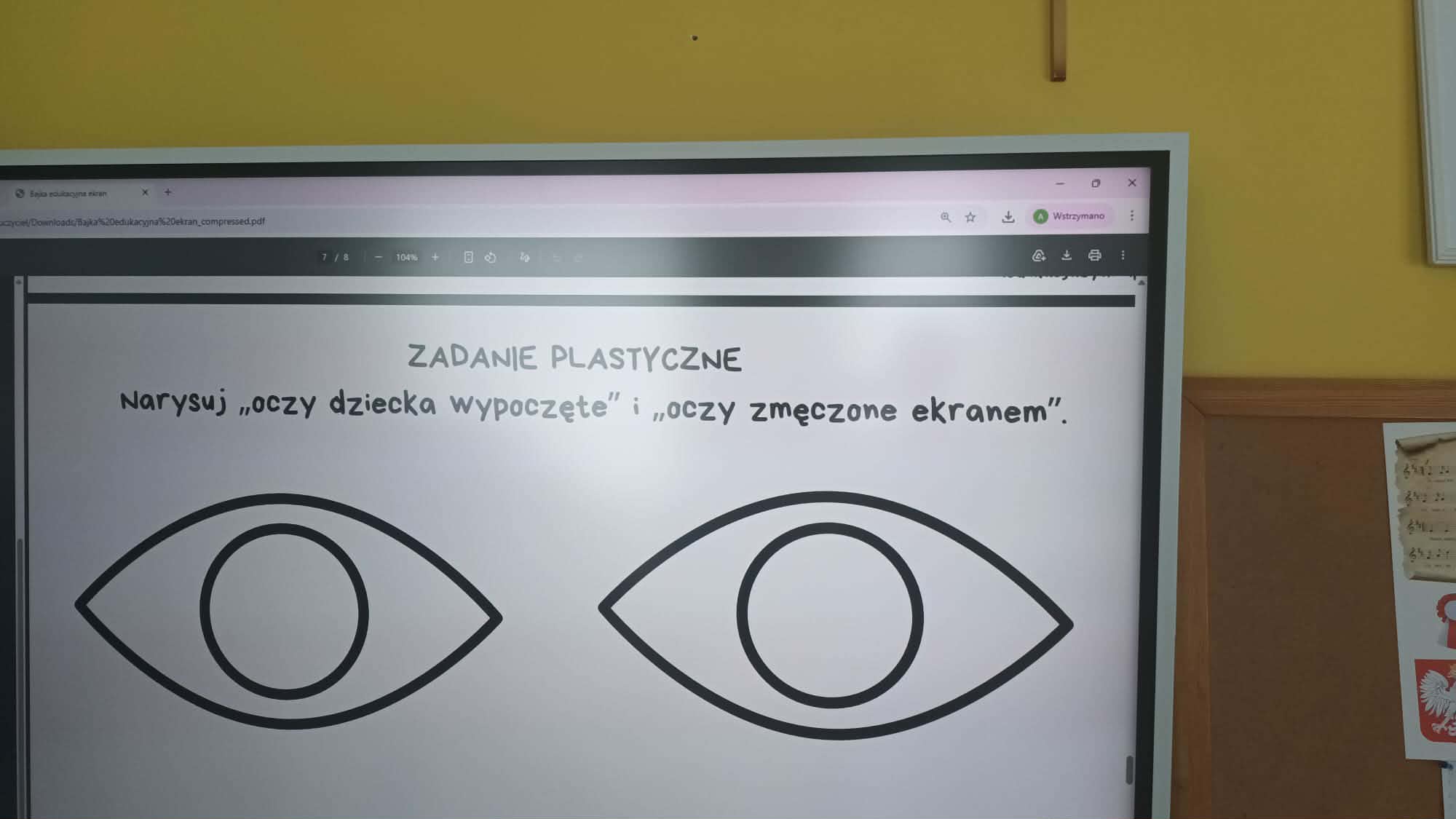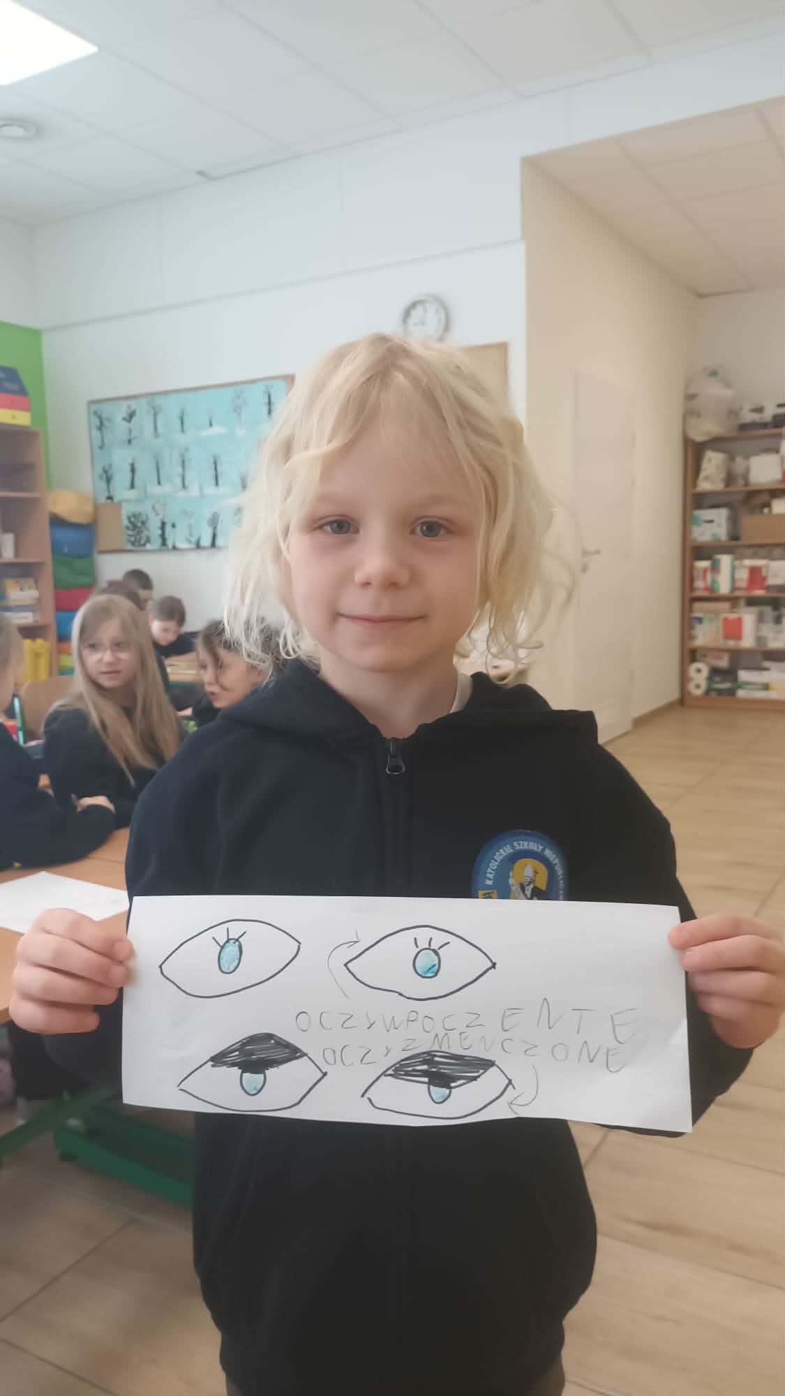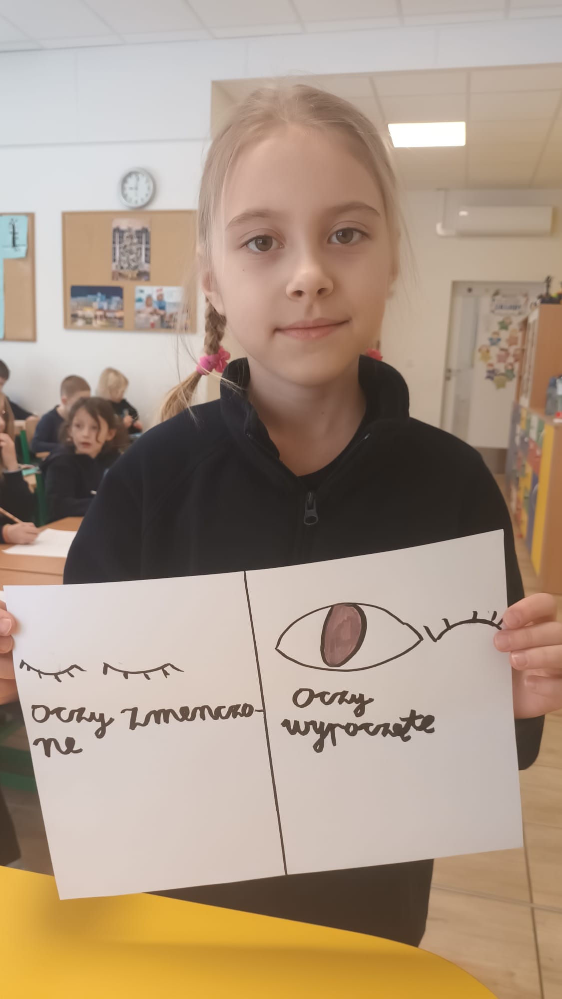 Kulminacją zajęć było wykonanie kreatywnej pracy plastycznej. Dzieci miały za zadanie narysować oczy – jedne zmęczone, a drugie wypoczęte. To zadanie miało na celu uświadomienie im, jak ważny jest odpoczynek dla oczu i ciała. Zmęczone oczy, narysowane w odcieniach szarości i fioletu, symbolizowały nadmierne korzystanie z urządzeń, podczas gdy wypoczęte oczy, pełne kolorów i blasku, odzwierciedlały radość i energię płynącą z aktywności poza ekranem.
