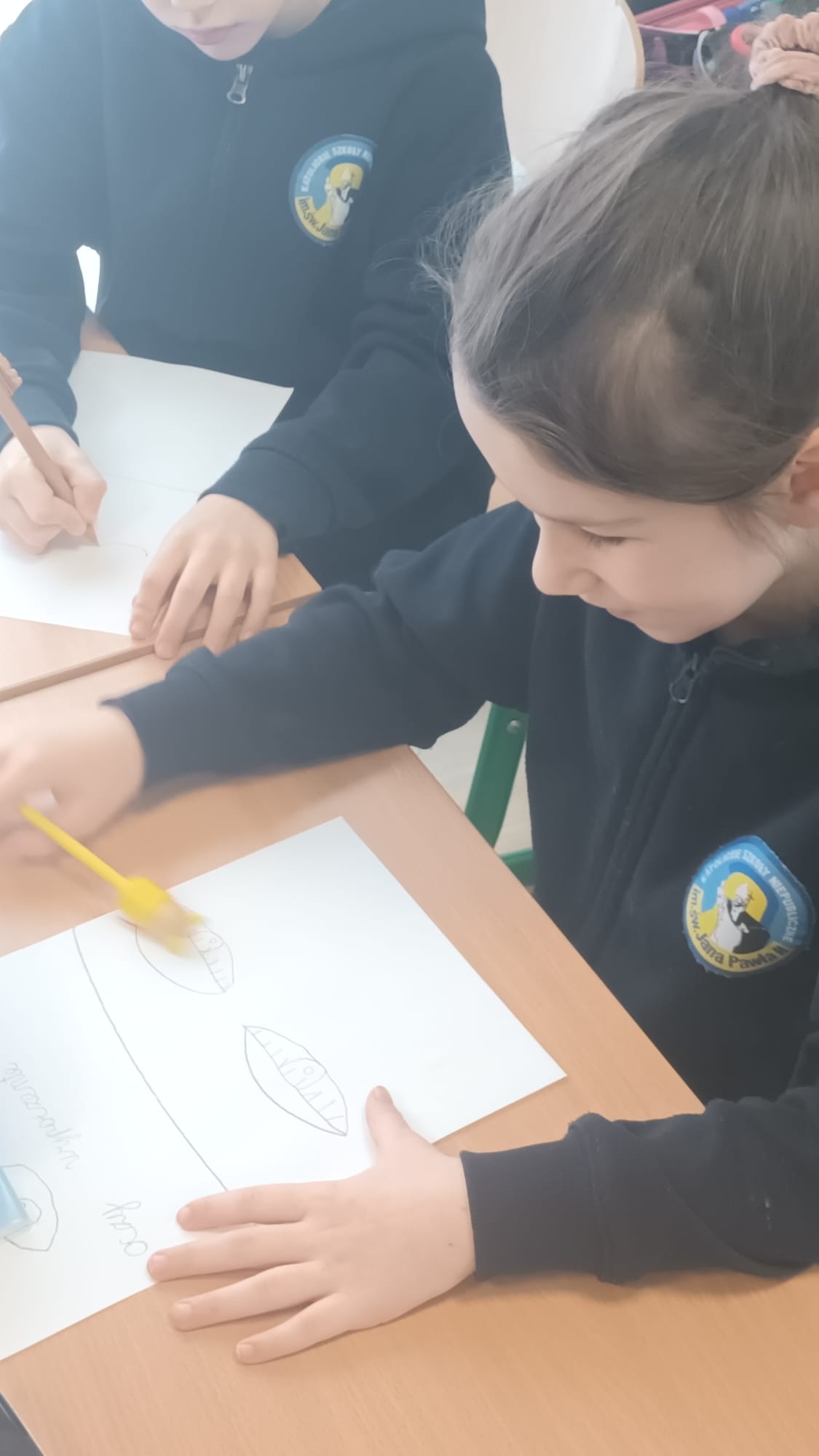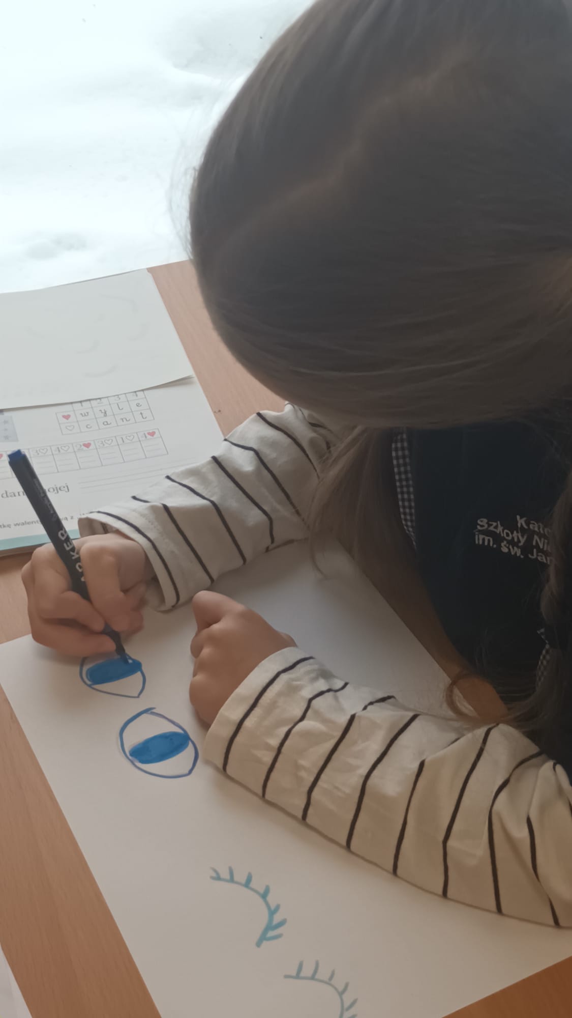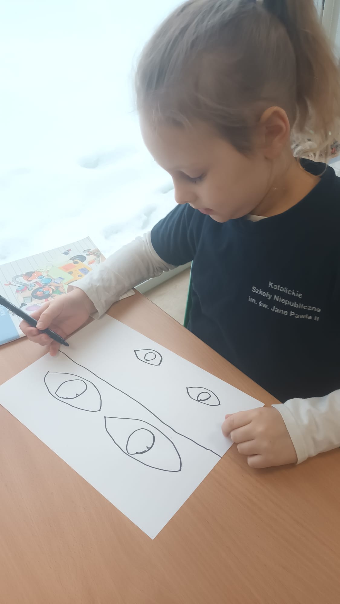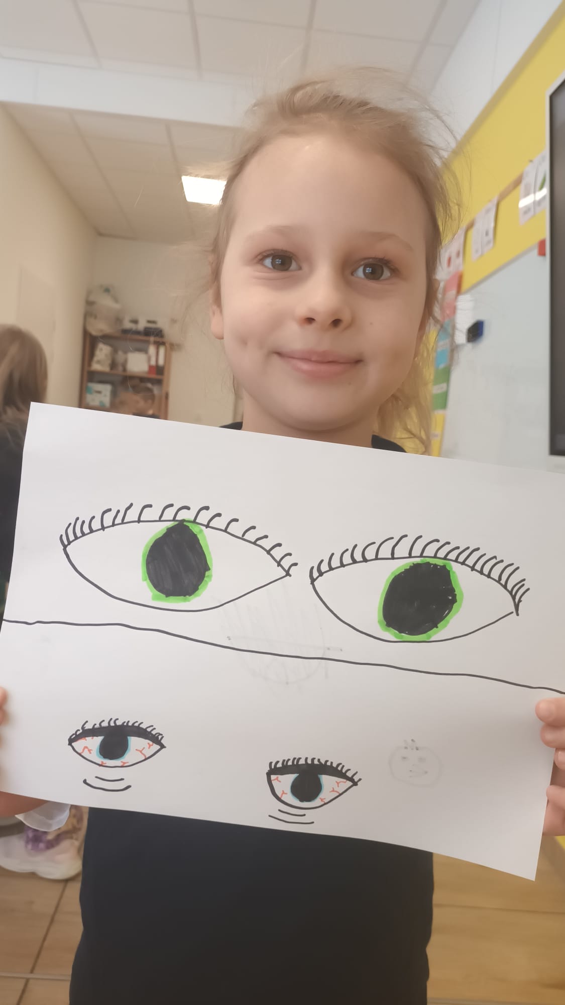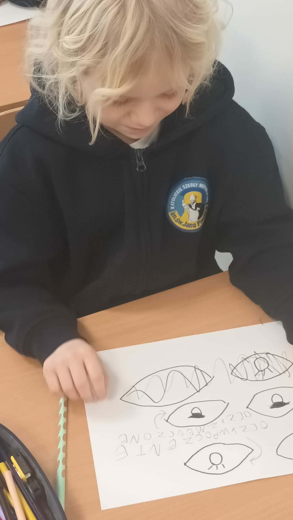 Kulminacją zajęć było wykonanie kreatywnej pracy plastycznej. Dzieci miały za zadanie narysować oczy – jedne zmęczone, a drugie wypoczęte. To zadanie miało na celu uświadomienie im, jak ważny jest odpoczynek dla oczu i ciała. Zmęczone oczy, narysowane w odcieniach szarości i fioletu, symbolizowały nadmierne korzystanie z urządzeń, podczas gdy wypoczęte oczy, pełne kolorów i blasku, odzwierciedlały radość i energię płynącą z aktywności poza ekranem.