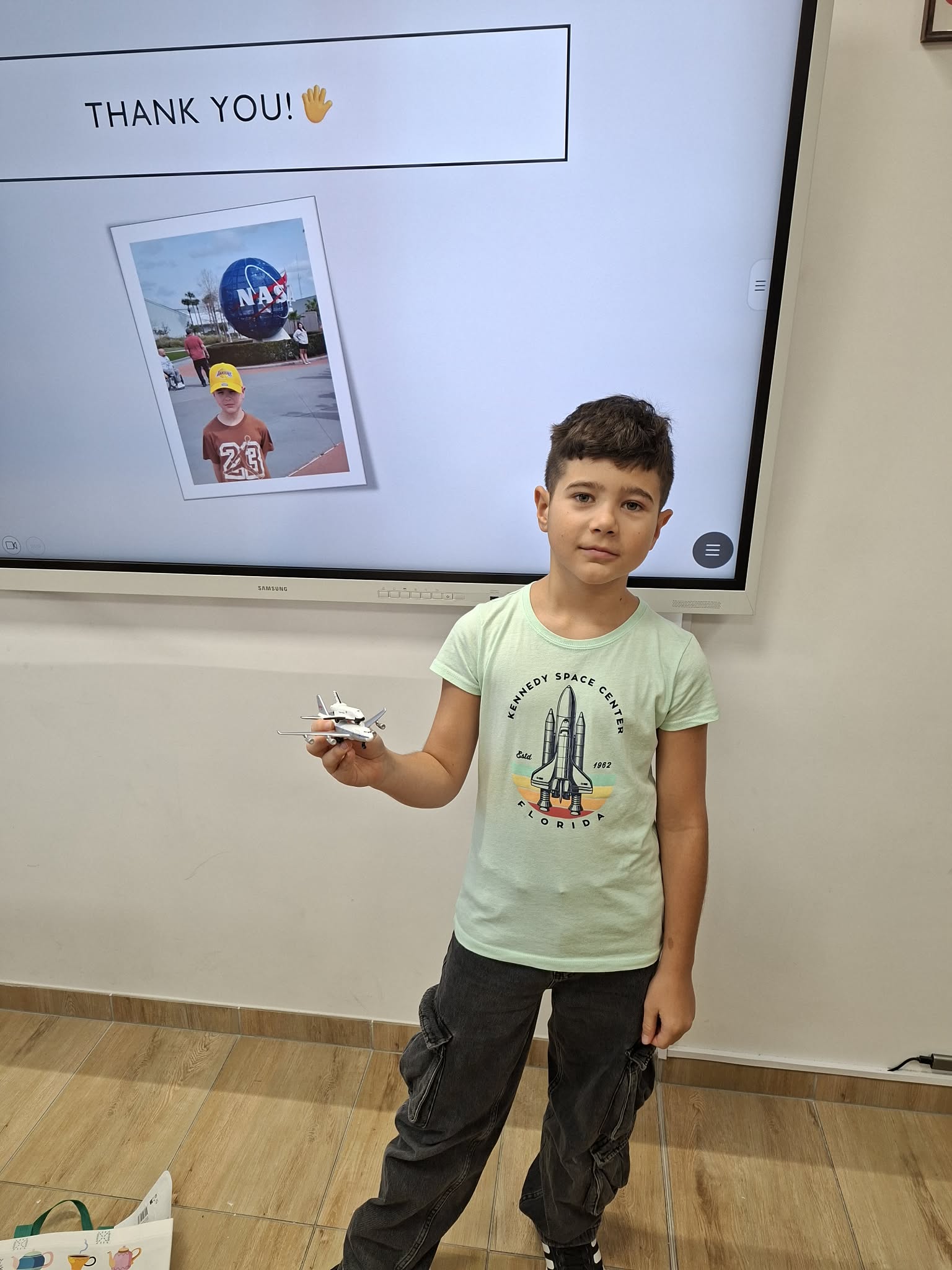 Olek, z pasją w oczach i uśmiechem na twarzy, wcielił się w rolę nauczyciela i zaprezentował swoim koleżankom i kolegom swoją niezwykłą przygodę – wizytę w Kennedy Space Center na Florydzie! Prezentacja, przygotowana przez Olka, była prawdziwą ucztą dla oczu i uszu. Oparta na prywatnych zdjęciach z podróży, ukazywała wszystko, co Olek zobaczył i przeżył w tym niezwykłym miejscu.