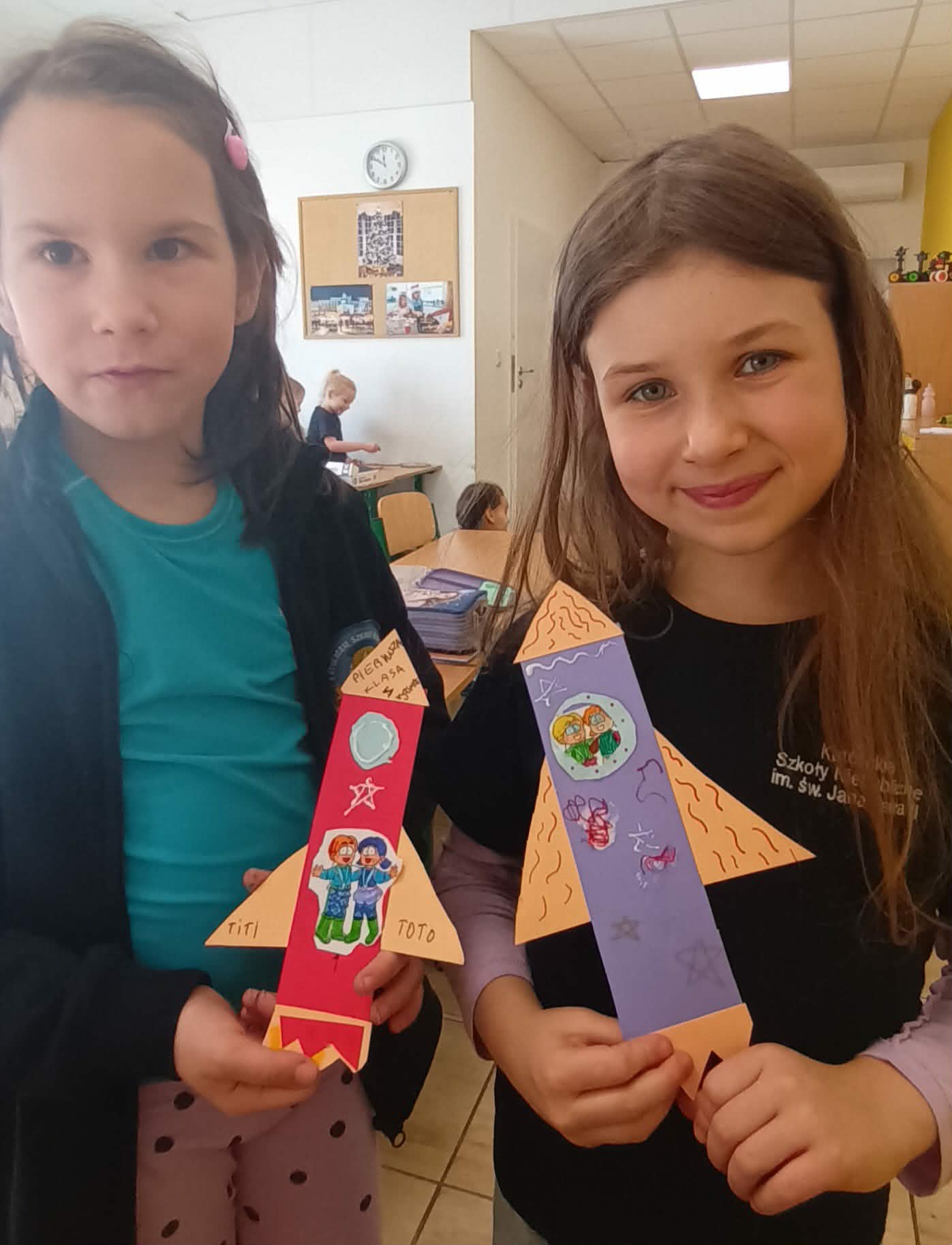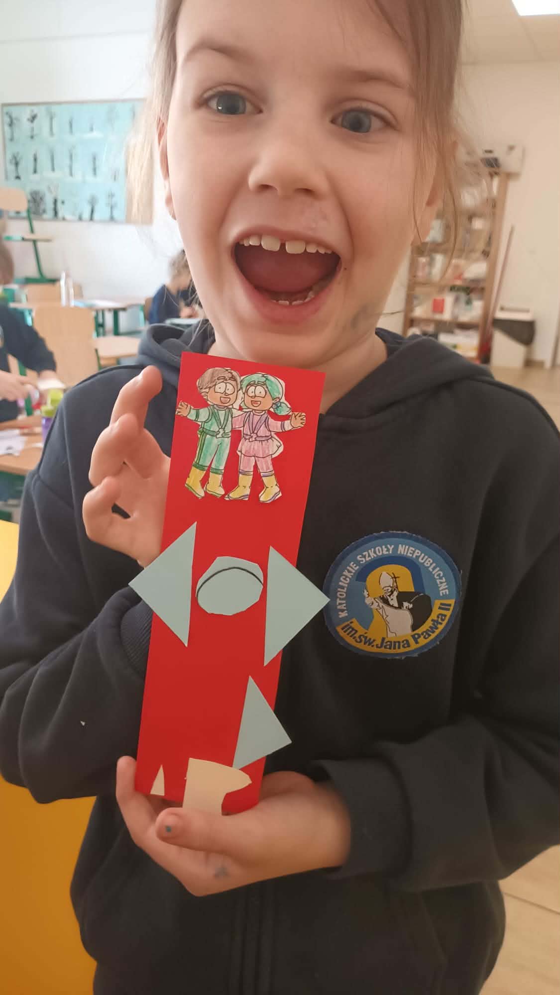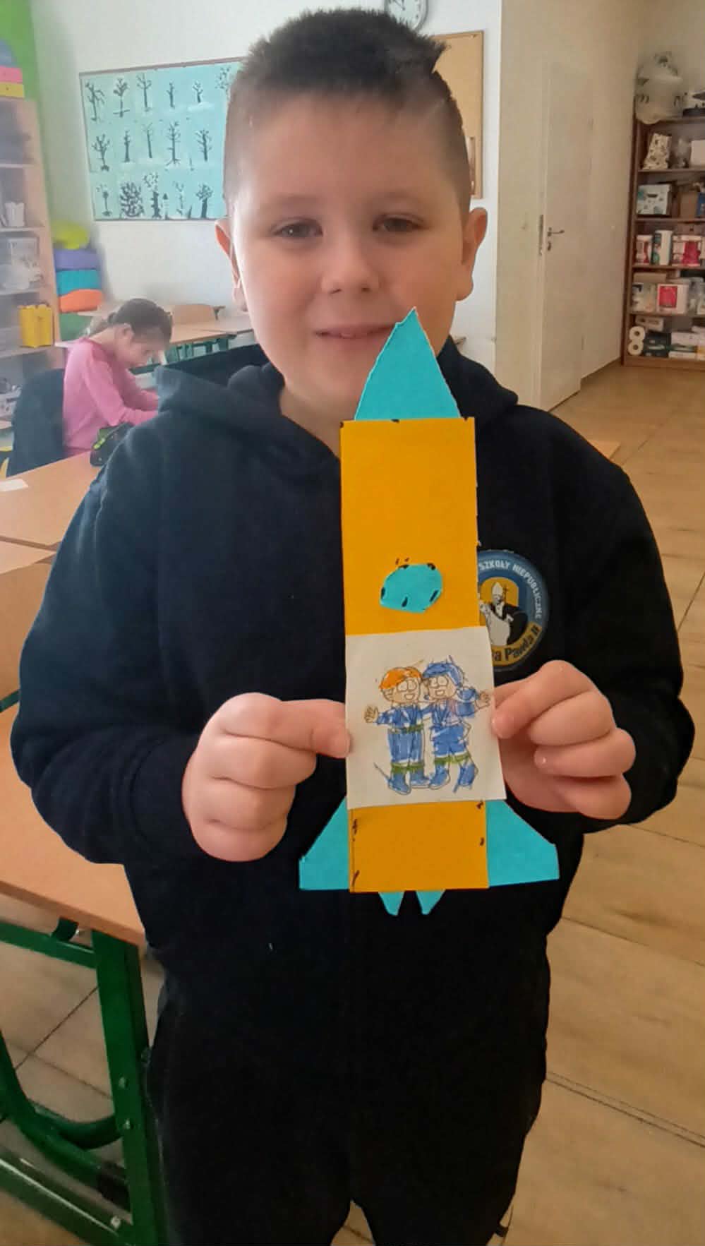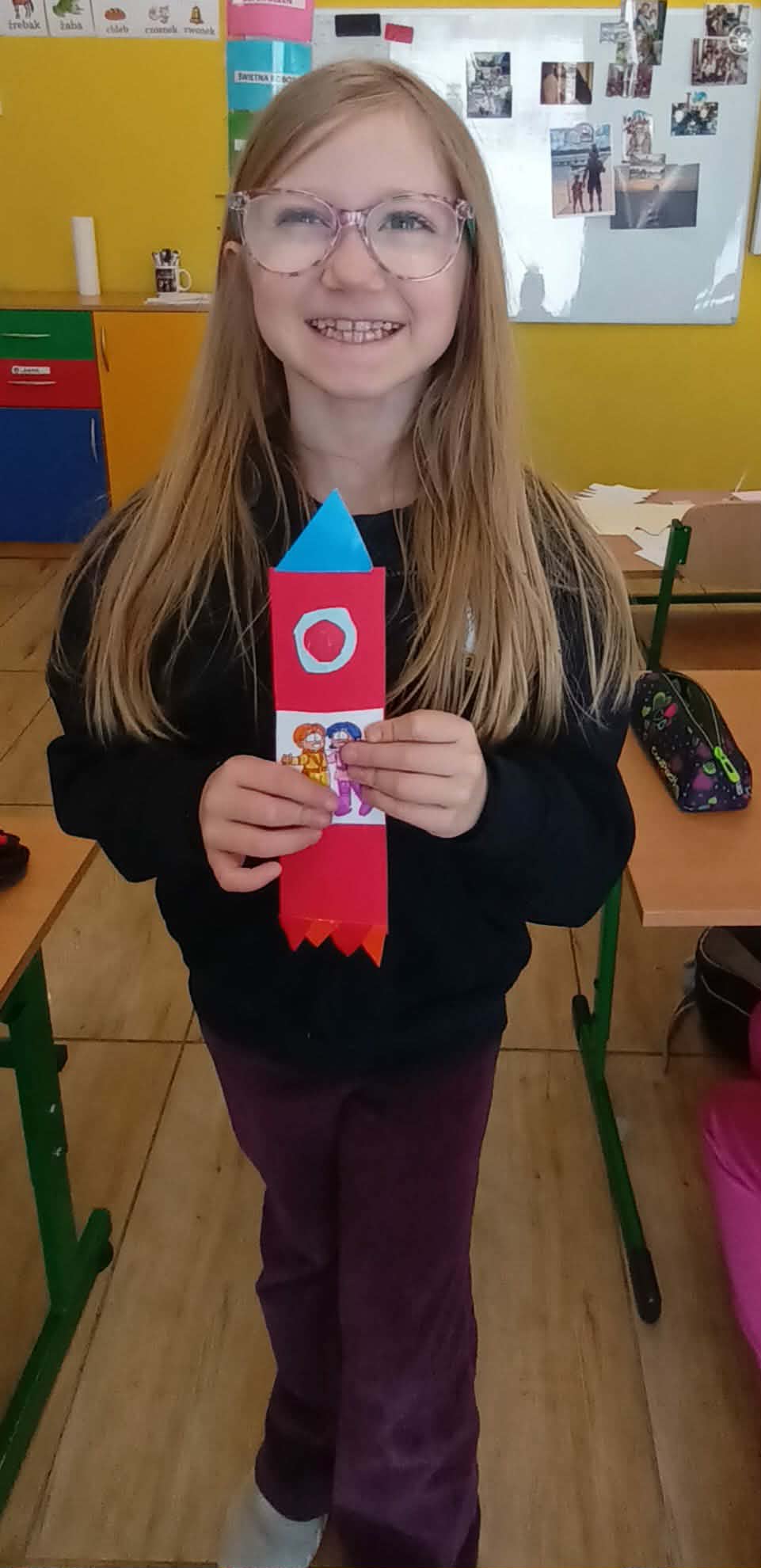 Klasa 1b na zajęciach technicznych stworzyła wyjątkową zakładkę do książki, której motywem przewodnim była rakieta kosmiczna. To nie była zwykła praca plastyczna – projekt miał głębsze przesłanie, nawiązujące do lektury pt. „Pierwszaki z kosmosu”. Ta zabawna i pouczająca książka opowiada o przygodach Poli, która właśnie rozpoczyna naukę w szkole, oraz dwójki kosmitów, którzy przypadkowo trafiają do jej klasy.