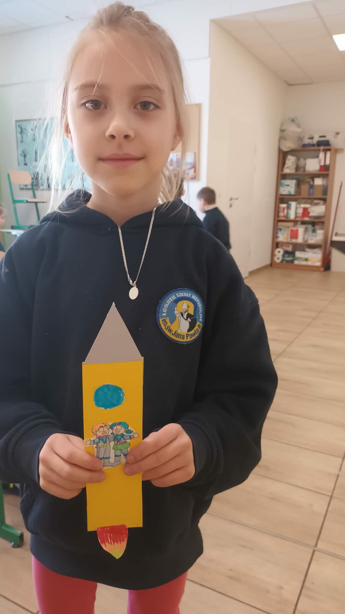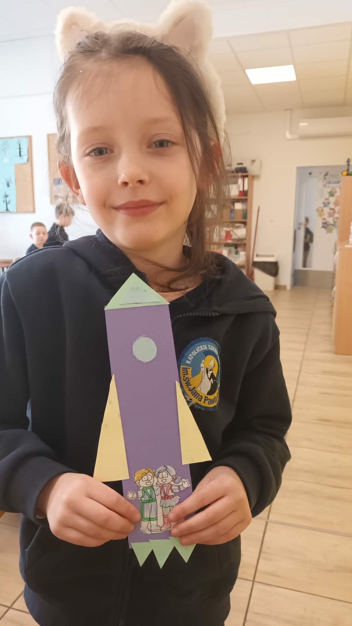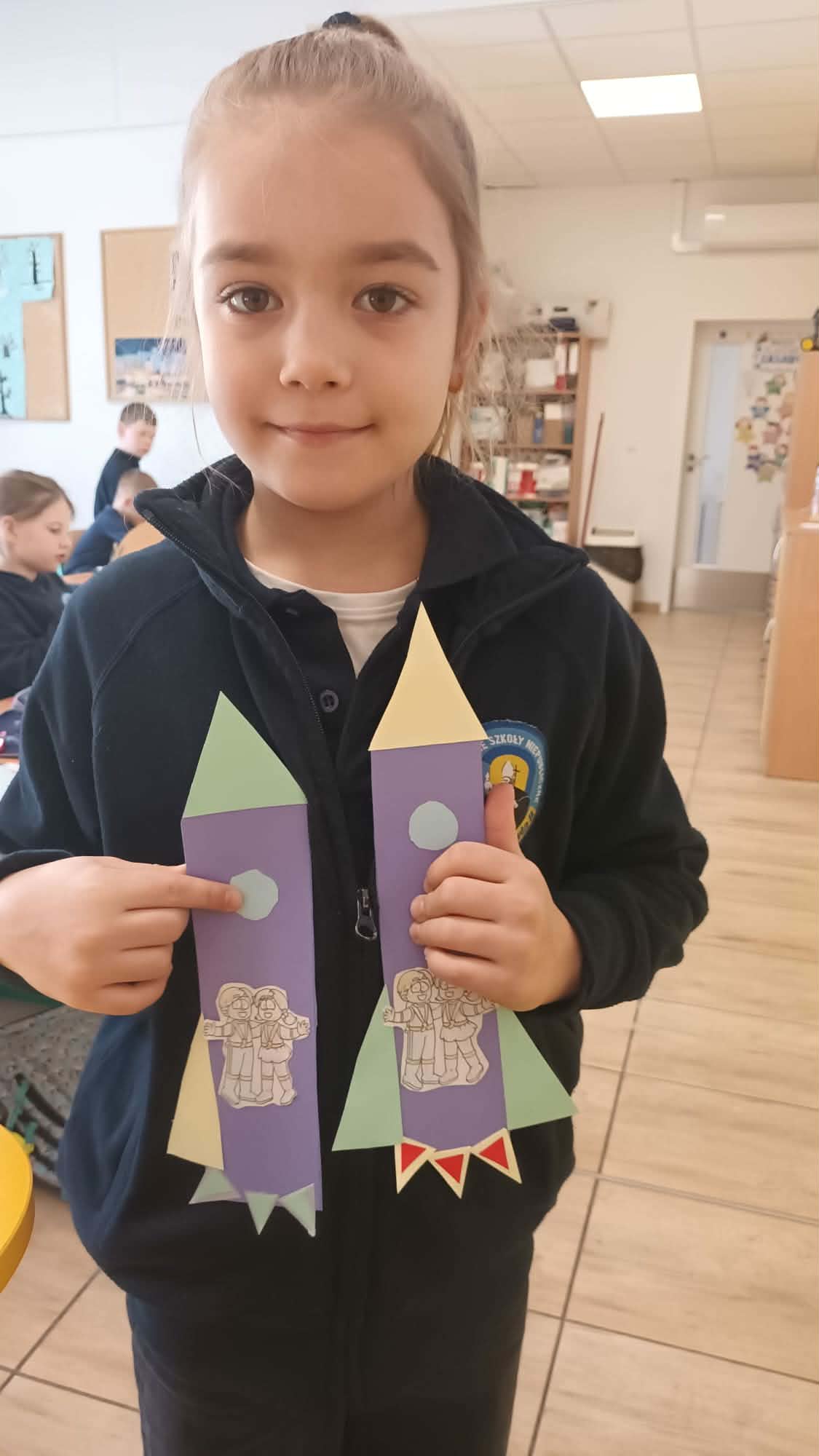 Klasa 1b na zajęciach technicznych stworzyła wyjątkową zakładkę do książki, której motywem przewodnim była rakieta kosmiczna. To nie była zwykła praca plastyczna – projekt miał głębsze przesłanie, nawiązujące do lektury pt. „Pierwszaki z kosmosu”. Ta zabawna i pouczająca książka opowiada o przygodach Poli, która właśnie rozpoczyna naukę w szkole, oraz dwójki kosmitów, którzy przypadkowo trafiają do jej klasy.