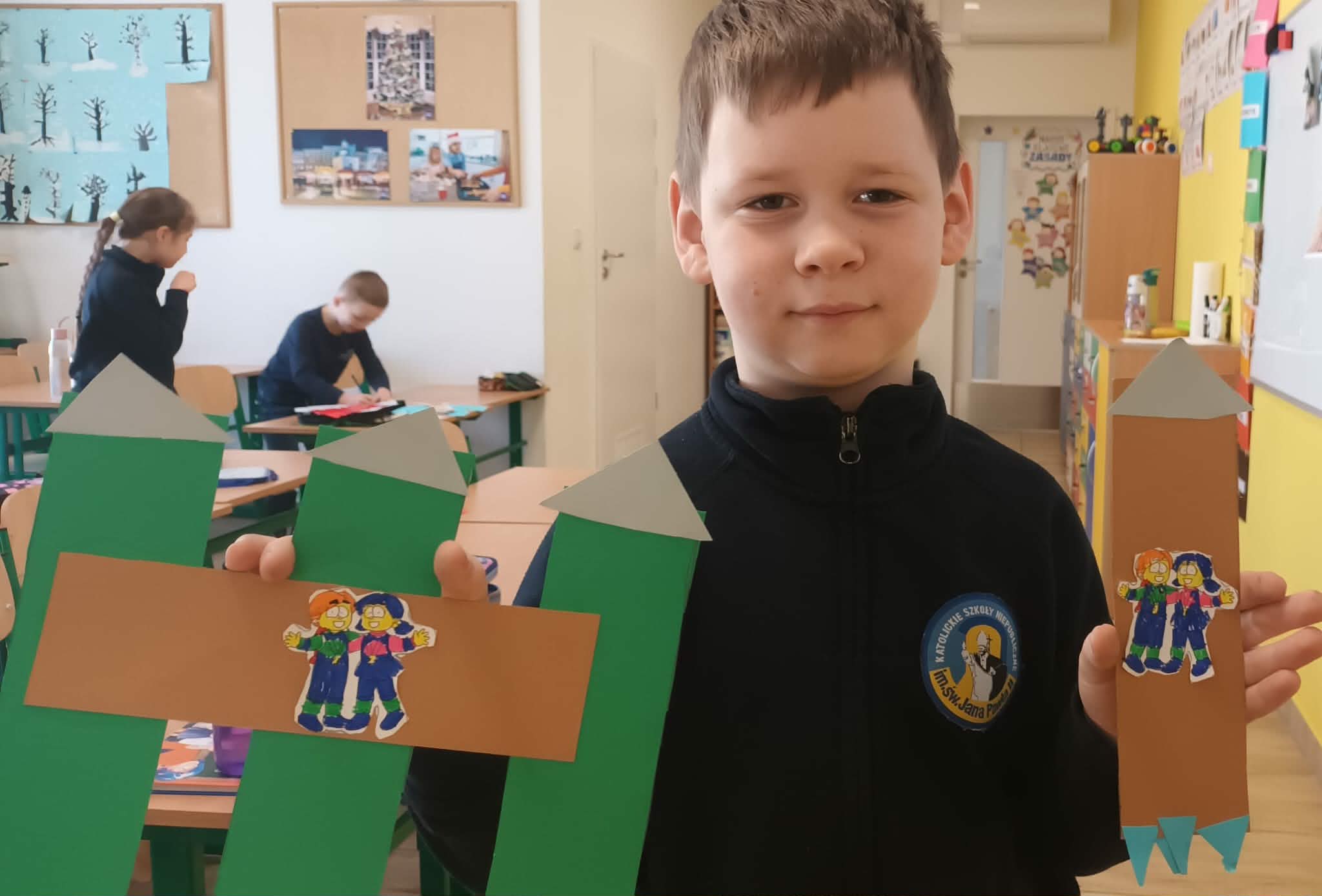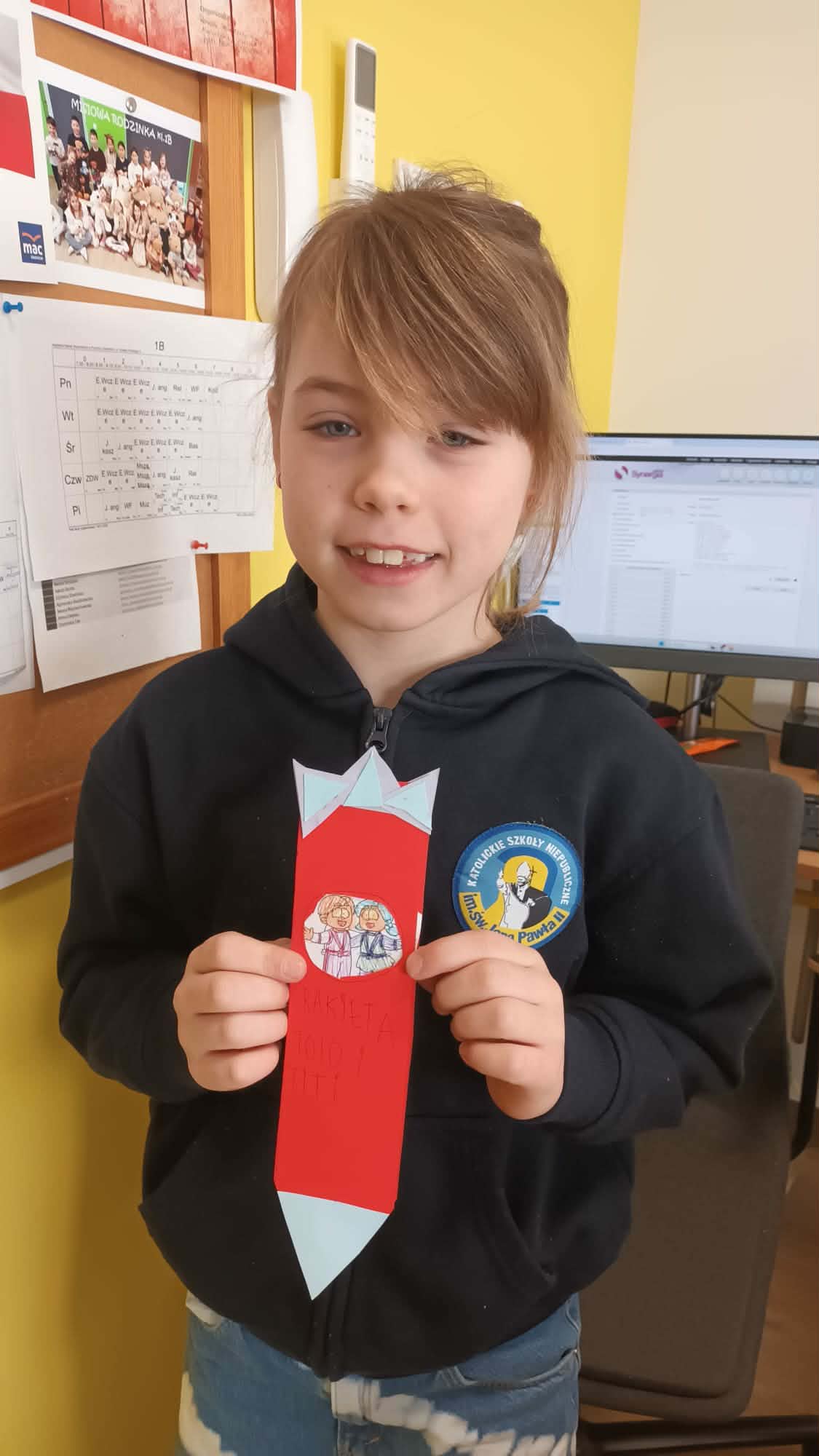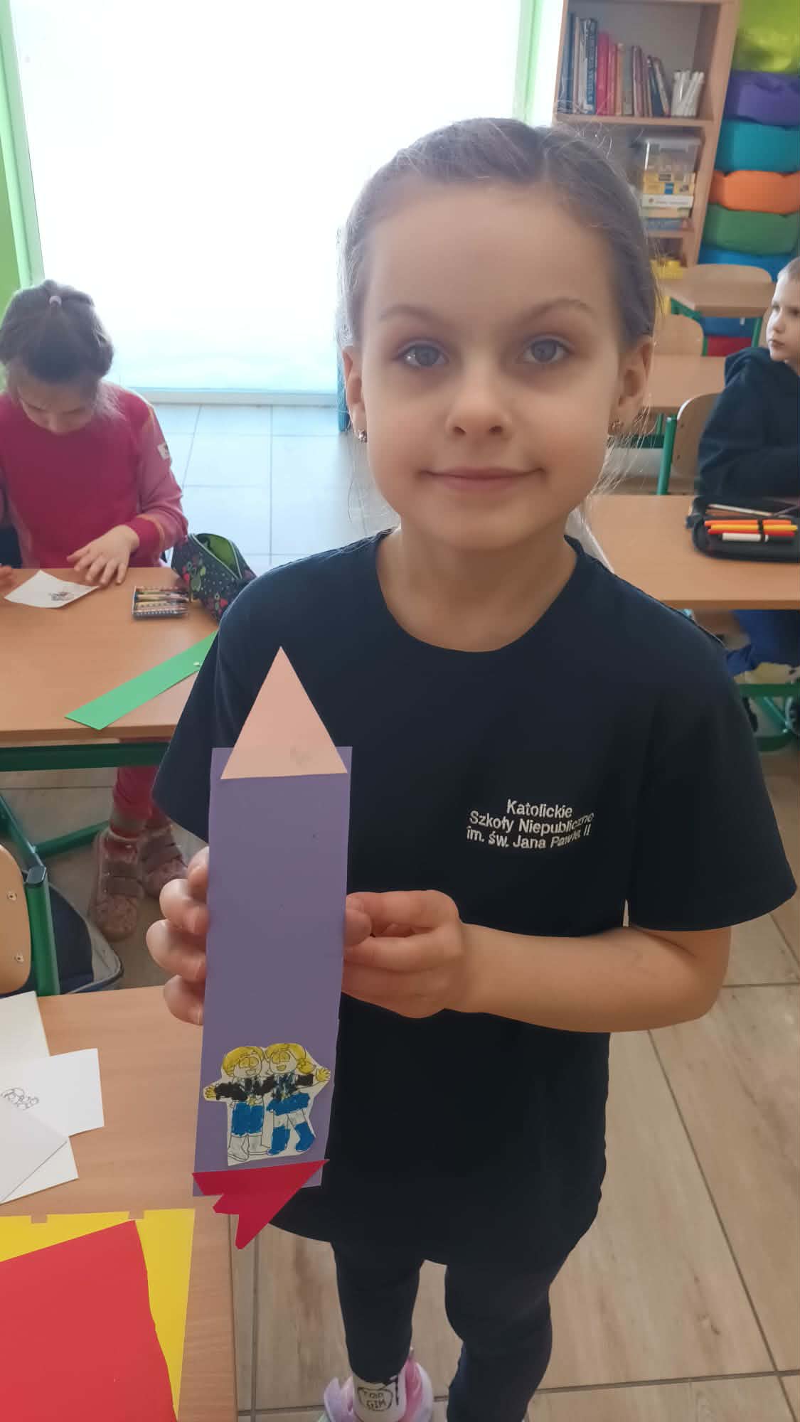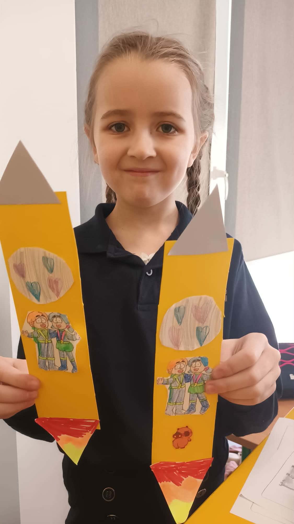 Klasa 1b na zajęciach technicznych stworzyła wyjątkową zakładkę do książki, której motywem przewodnim była rakieta kosmiczna. To nie była zwykła praca plastyczna – projekt miał głębsze przesłanie, nawiązujące do lektury pt. „Pierwszaki z kosmosu”. Ta zabawna i pouczająca książka opowiada o przygodach Poli, która właśnie rozpoczyna naukę w szkole, oraz dwójki kosmitów, którzy przypadkowo trafiają do jej klasy.