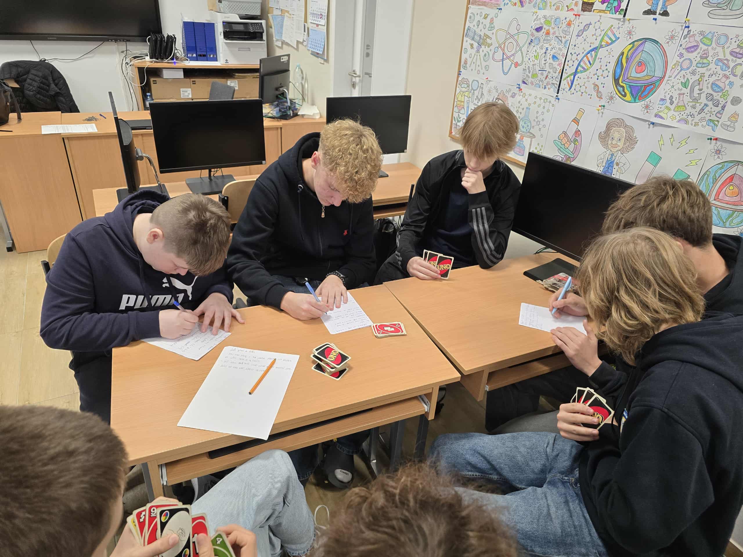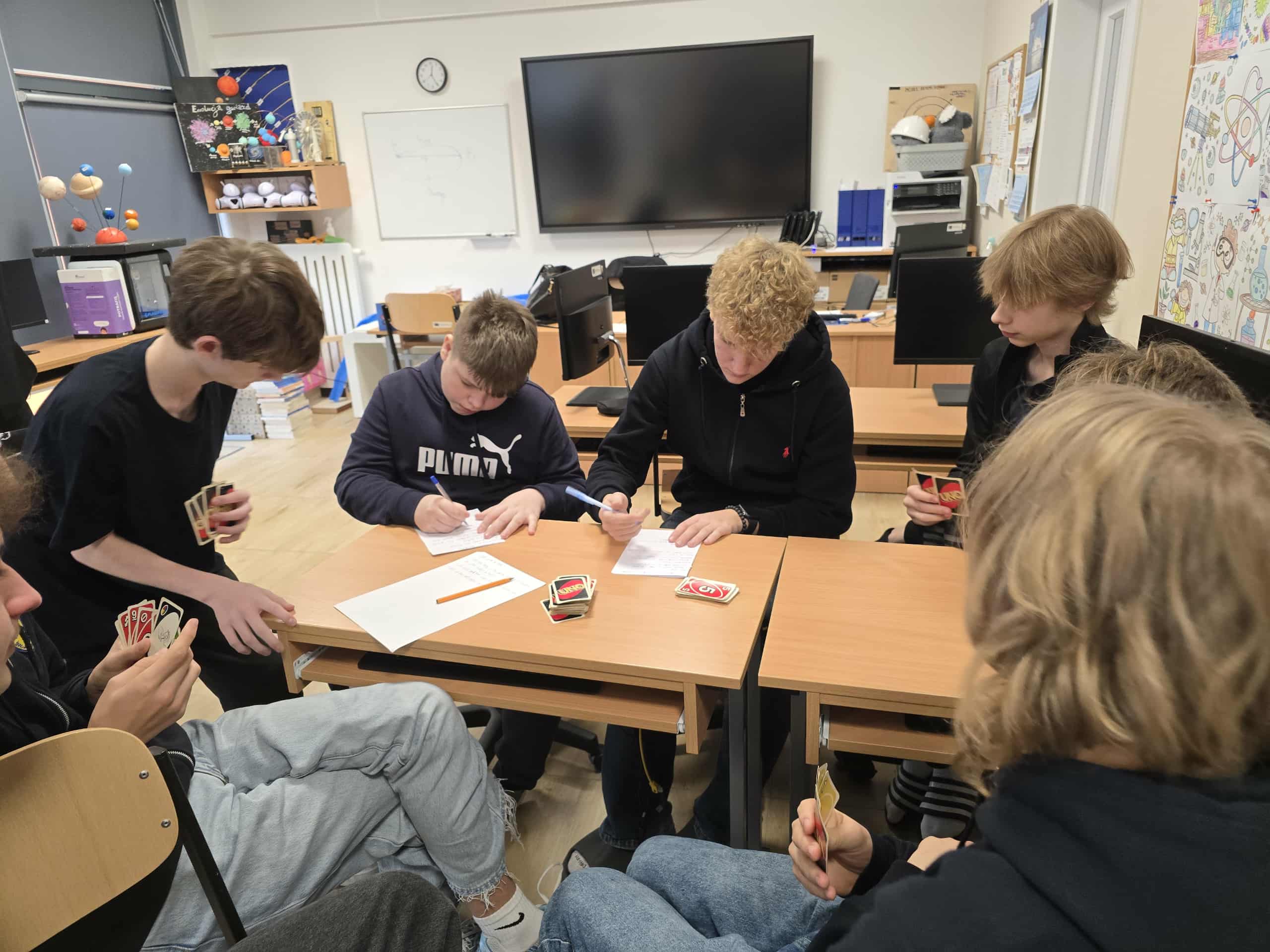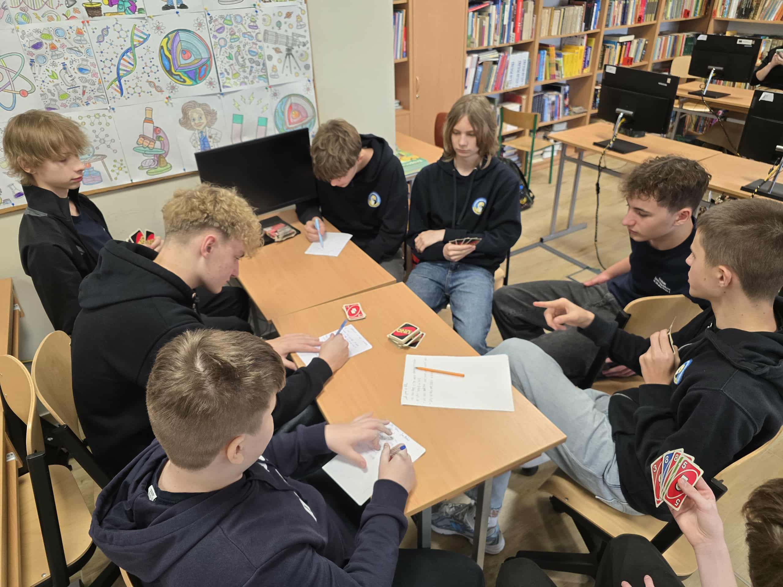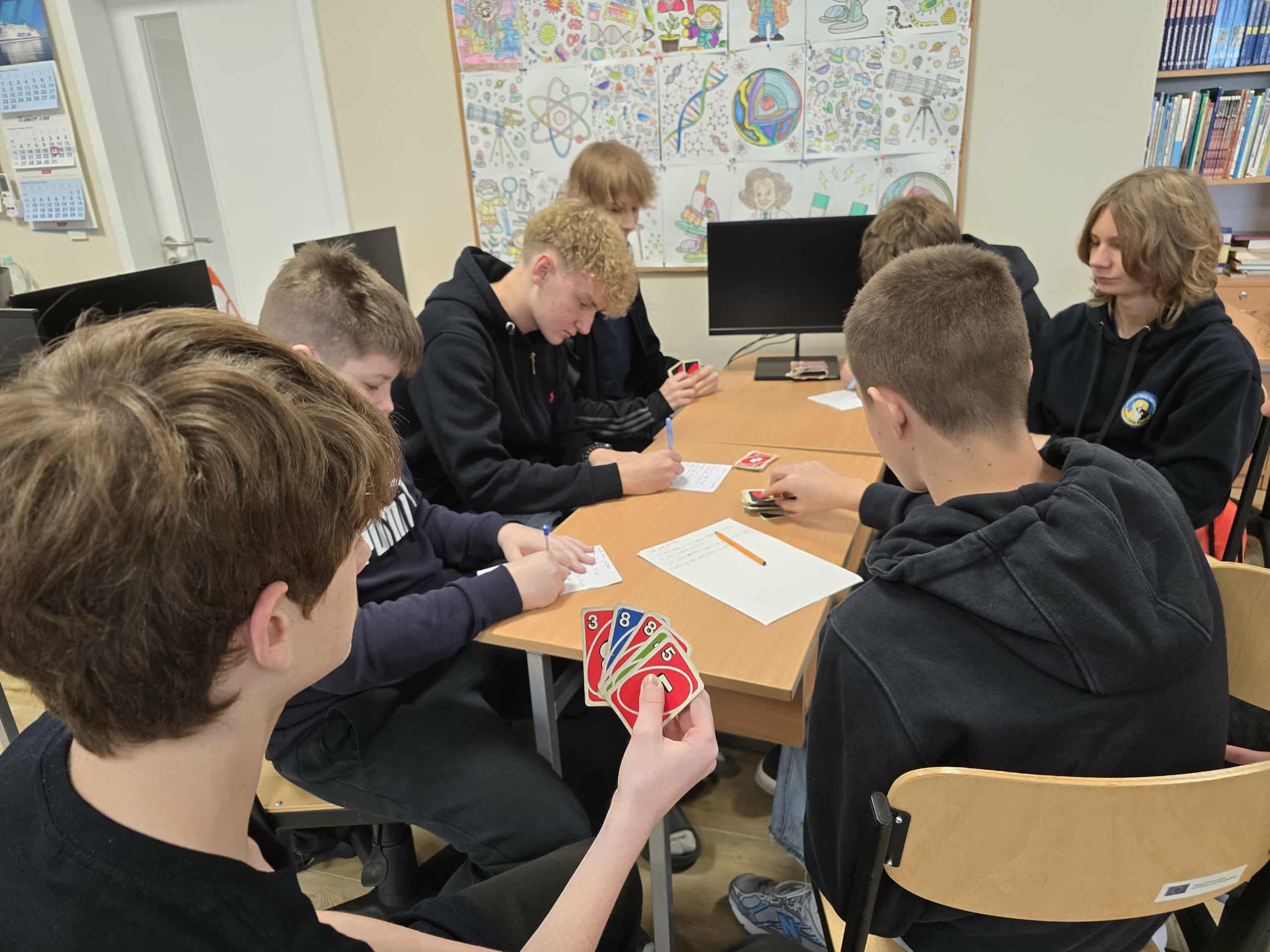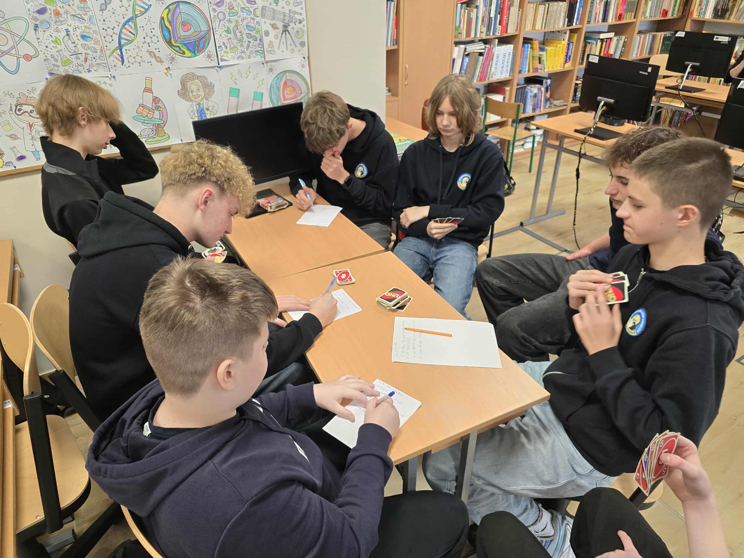 Dzisiejsze zajęcia z informatyki w klasie 8 upłynęły pod znakiem gier planszowych! Uczniowie wzięli udział w zajęciach w ramach Code Week 2025 oraz zaliczyli zadanie 3 Planszówkowy zawrót głowy z modułu VIII projektu (Nie)zwykła Matematyka. Zamiast tradycyjnych zadań, uczniowie przenieśli się w świat rywalizacji i strategicznego myślenia. Na początek emocje sięgnęły zenitu podczas partii Uno, gdzie liczyła się sprawność w doborze kart i szybkie decyzje. Następnie, by poczuć dreszczyk podwójnej adrenaliny, uczniowie spróbowali swoich sił w Double, grze, która testuje spostrzegawczość i refleks.
