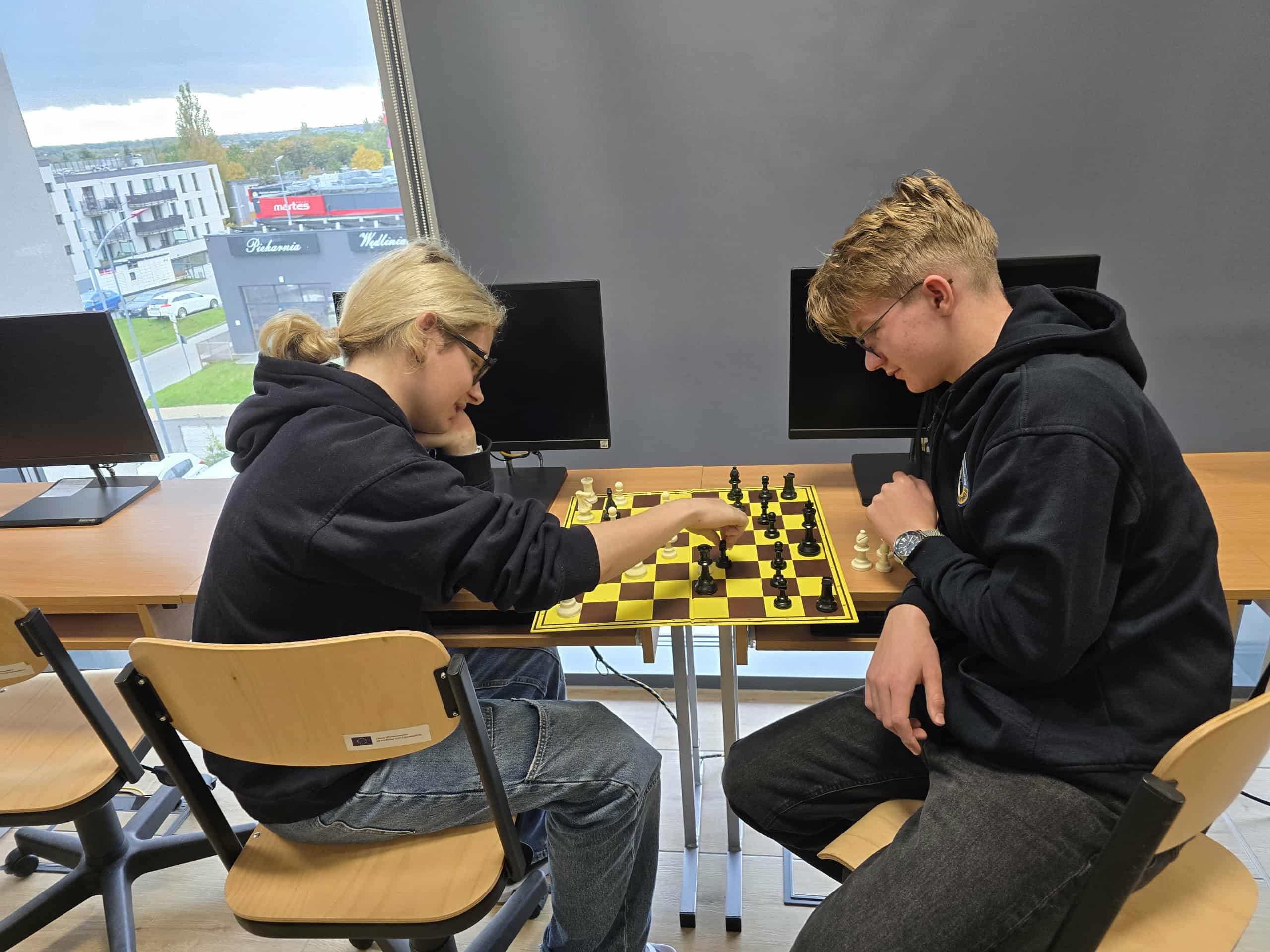 Po dynamicznych rozgrywkach czas na chwilę wytchnienia i strategiczne myślenie. Uczniowie mieli okazję sprawdzić swoje umiejętności w szachach, gdzie każdy ruch ma znaczenie, a planowanie na kilka kroków naprzód jest kluczem do sukcesu. Analiza pozycji na szachownicy, przewidywanie ruchów przeciwnika i obmyślanie strategii – to doskonały trening logicznego myślenia.