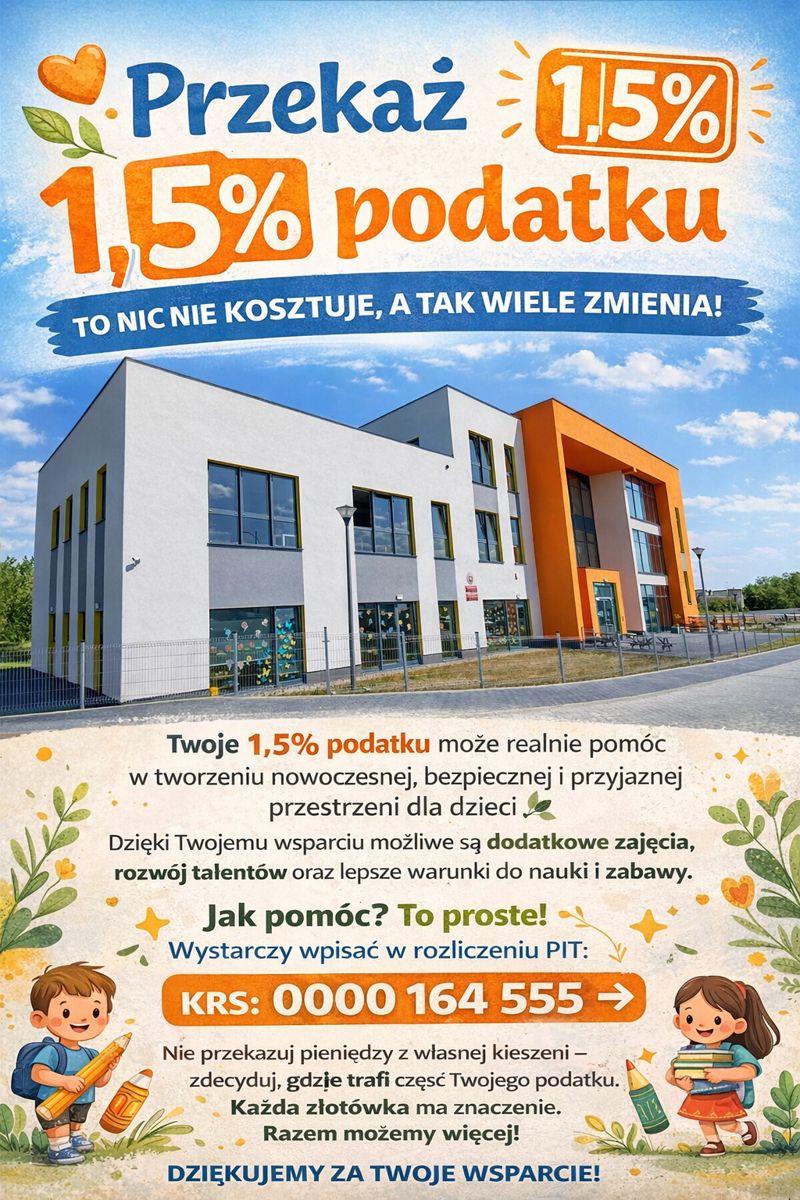 Zbliża się czas rozliczeń podatkowych, a my chcielibyśmy Was zachęcić do wsparcia naszej szkoły poprzez przekazanie 1,5% swojego podatku. To prosta i skuteczna forma pomocy, która pozwoli nam na realizację wielu wartościowych projektów i inicjatyw, które przyniosą korzyści całej społeczności szkolnej.