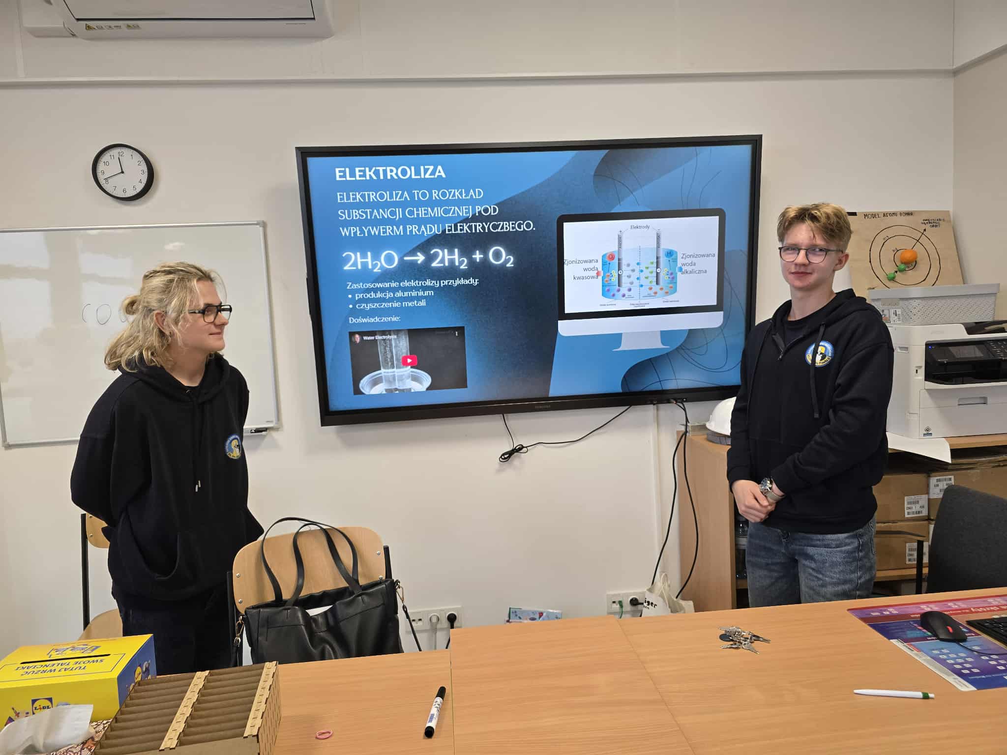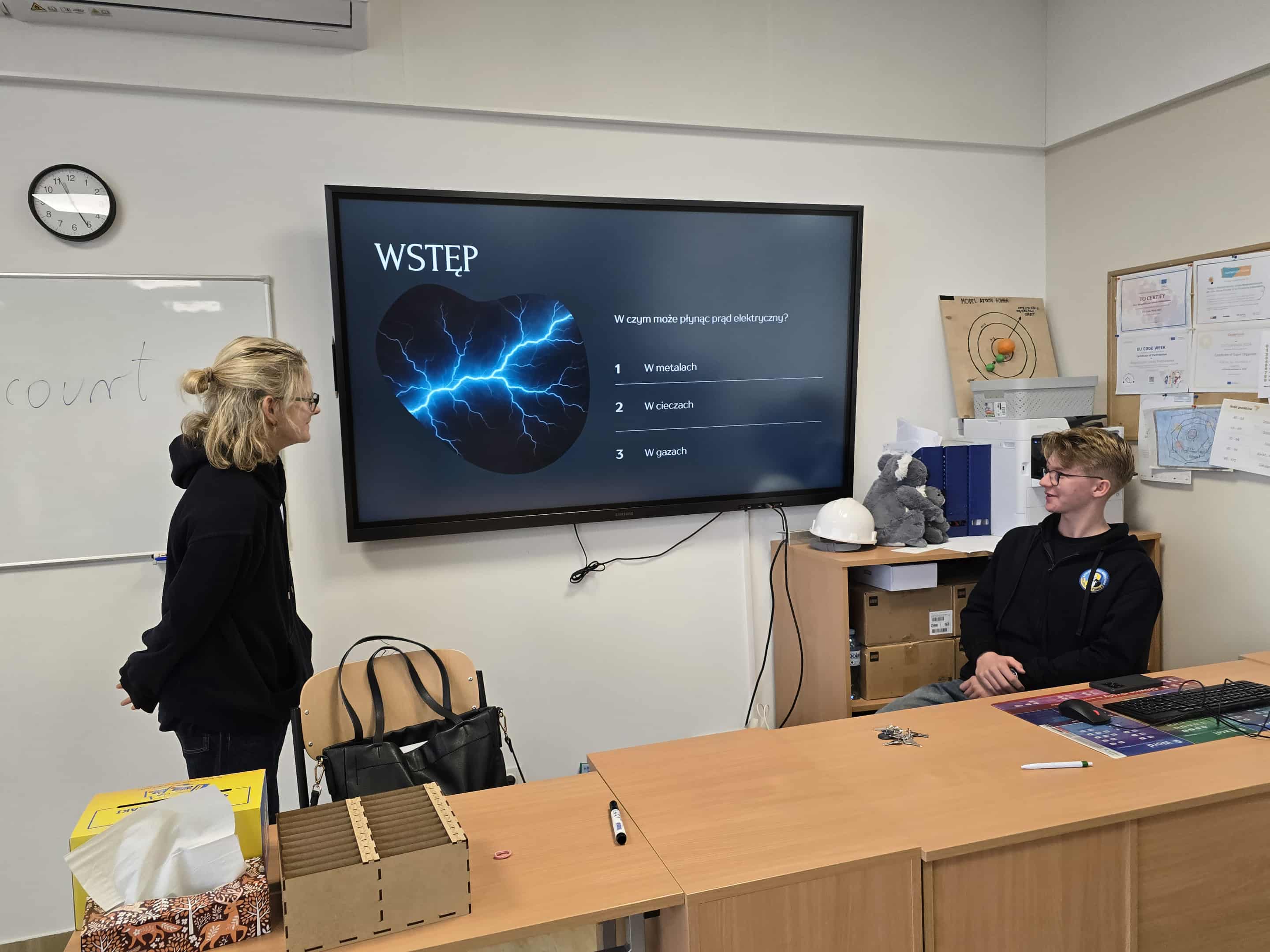 Filip i Krzysztof przygotowali się do tej roli starannie, sięgając po wiedzę z podręczników i materiałów edukacyjnych, a także korzystając z własnej wyobraźni, by przedstawić zjawiska związane z elektrycznością w ciekawy i zrozumiały sposób. W trakcie lekcji omówili podstawowe pojęcia takie jak przewodnictwo elektryczne, rodzaje elektrolitów oraz zjawisko przepływu prądu w cieczach.