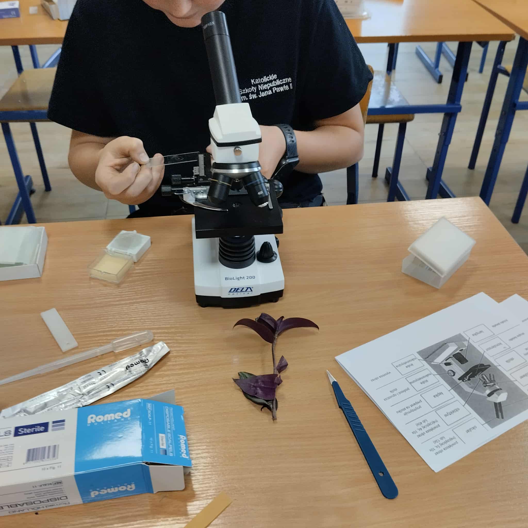 Kolejnym etapem była praktyczna część zajęć, podczas której uczniowie samodzielnie wykonywali preparaty epiderma liścia trzykrotki. Najpierw delikatnie odcinano fragment liścia, a następnie za pomocą nożyka i pęsety pozbywano się zbędnych części, starając się nie uszkodzić komórek. Następnie delikatnie zeskrobywali cienką warstwę tkanki liścia, którą następnie umieszczali na szkiełku podstawowym. Kolejnym krokiem było nałożenie kropli barwnika, co pozwalało na lepszą widoczność struktur pod mikroskopem. Uczestnicy nauczyli się także poprawnego ustawiania preparatu na stoliku mikroskopu, regulacji ostrości i powiększenia, aby uzyskać jak najdokładniejszy obraz.