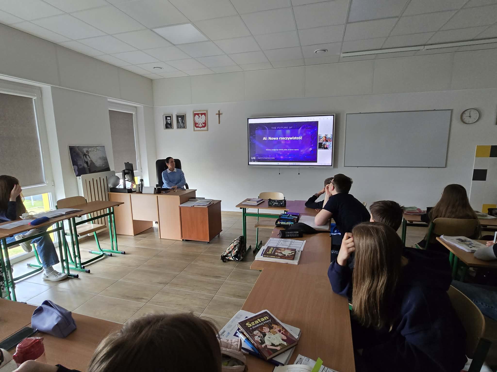 Dziś uczniowie klas 7 i 8 wzięli udział w niezwykle interesującym webinarze zatytułowanym „Pułapki Sztucznej Inteligencji”, zorganizowanym przez Urząd Komunikacji Elektronicznej. Spotkanie online poświęcone było jednemu z najważniejszych tematów współczesnego świata – roli i zagrożeniom związanym ze sztuczną inteligencją.