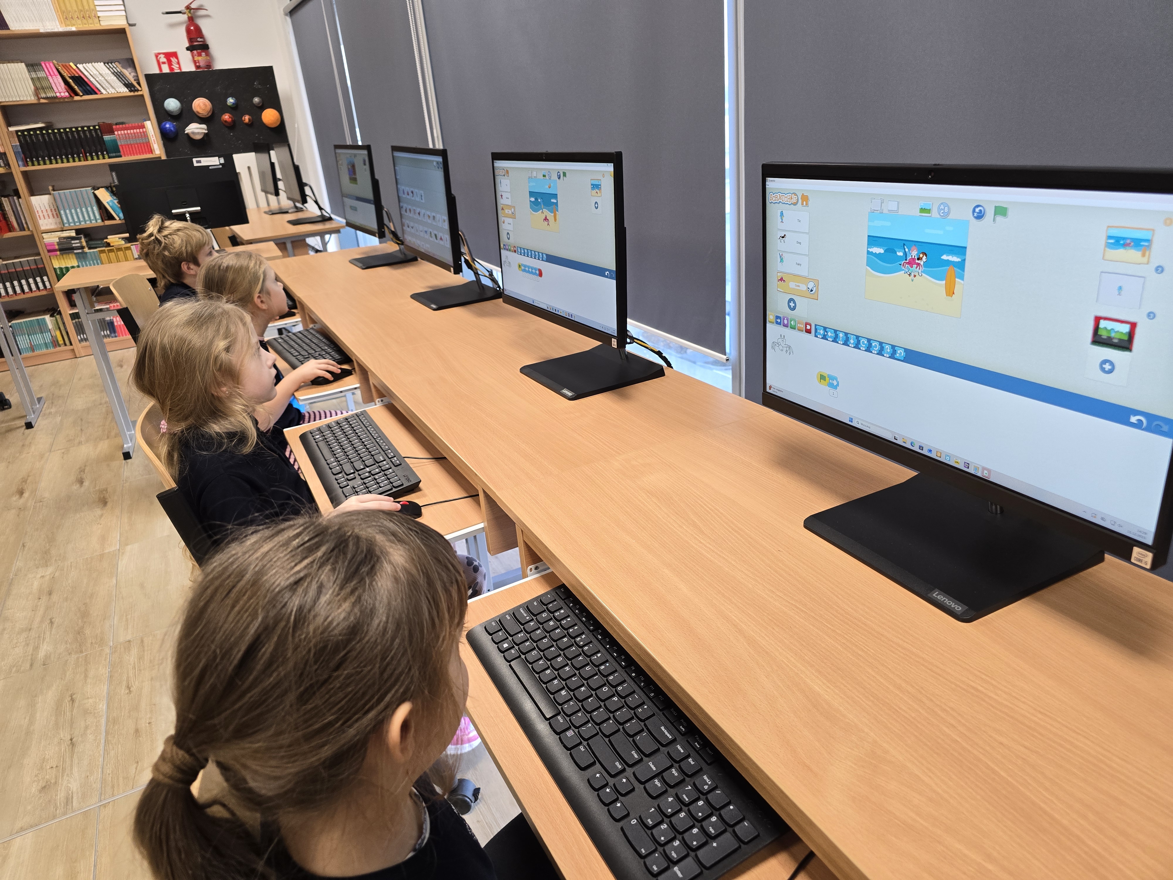 Z uśmiechami na twarzach i pełnymi zapału oczami, mali odkrywcy wkroczyli do kolorowego świata Scratcha Jr. – aplikacji, która w prosty i intuicyjny sposób wprowadza dzieci w świat kodowania. Przy pomocy prostych bloków, takich jak „ruch”, „dźwięk” czy „wygląd”, nasi uczniowie uczyli się tworzyć własne programy.