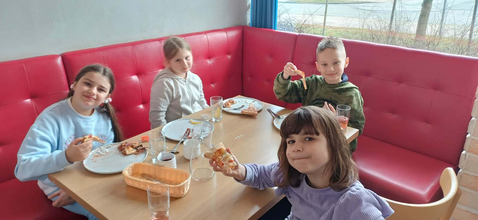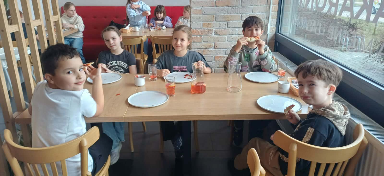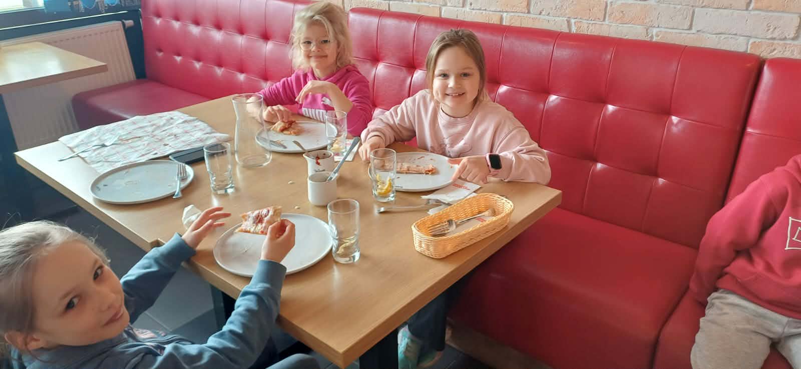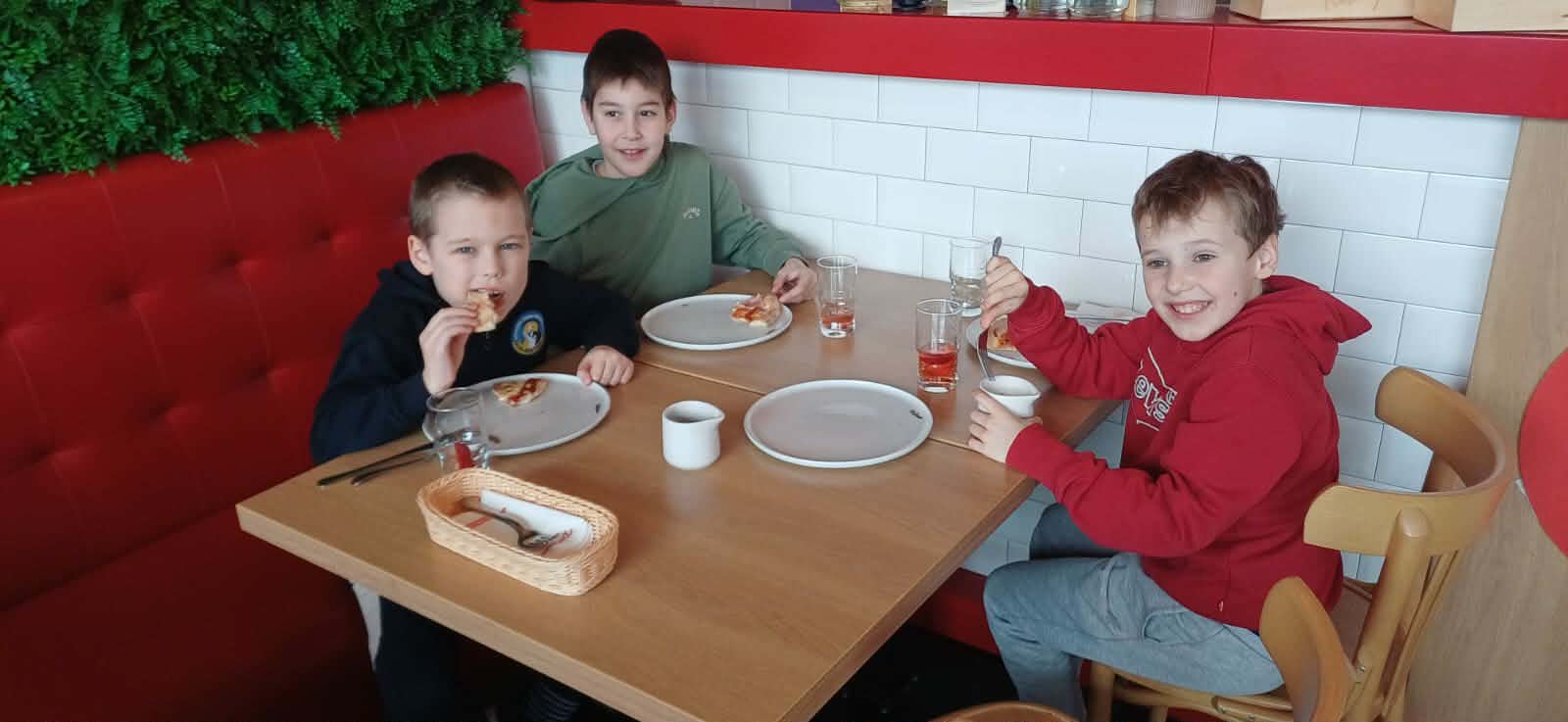 Już od samego wejścia na dzieci czekała miła atmosfera i zapach świeżo pieczonej pizzy. Wspólny posiłek okazał się prawdziwą ucztą – kolorowe, pachnące pizze smakowały wyśmienicie i szybko znikały z talerzy. Był to jednak nie tylko czas delektowania się pysznym jedzeniem, ale także świetna okazja do rozmów, śmiechu i budowania klasowej wspólnoty.