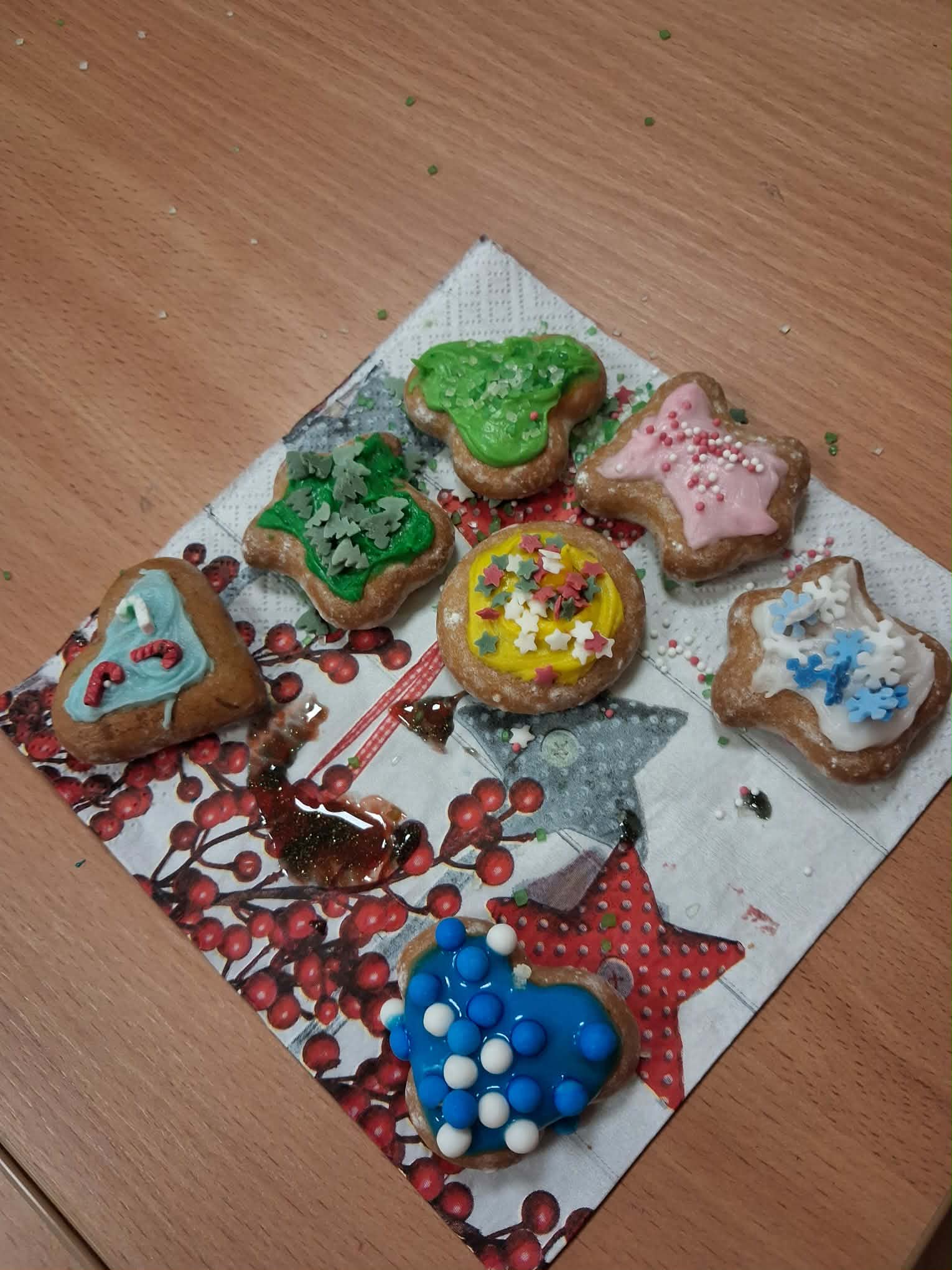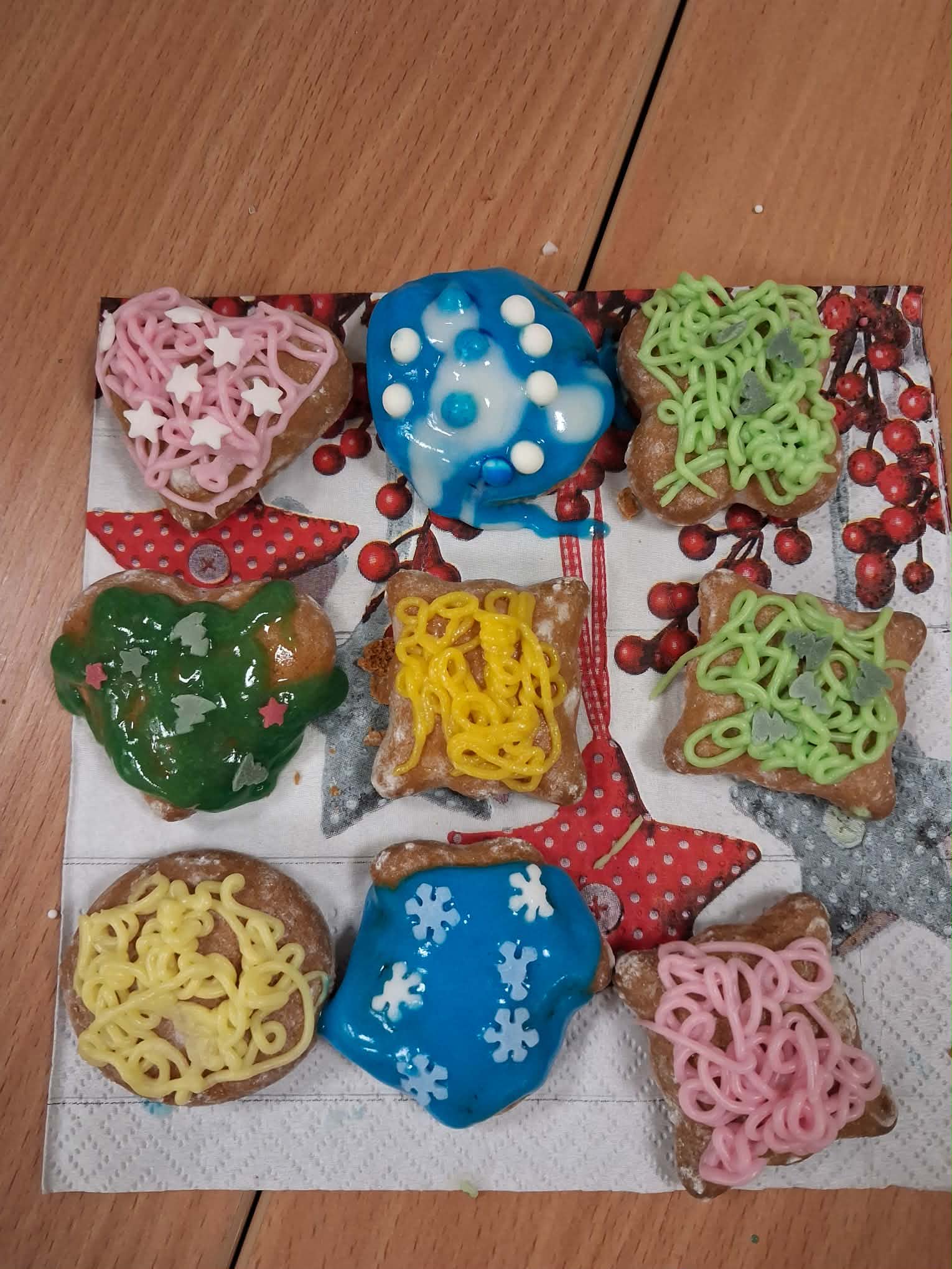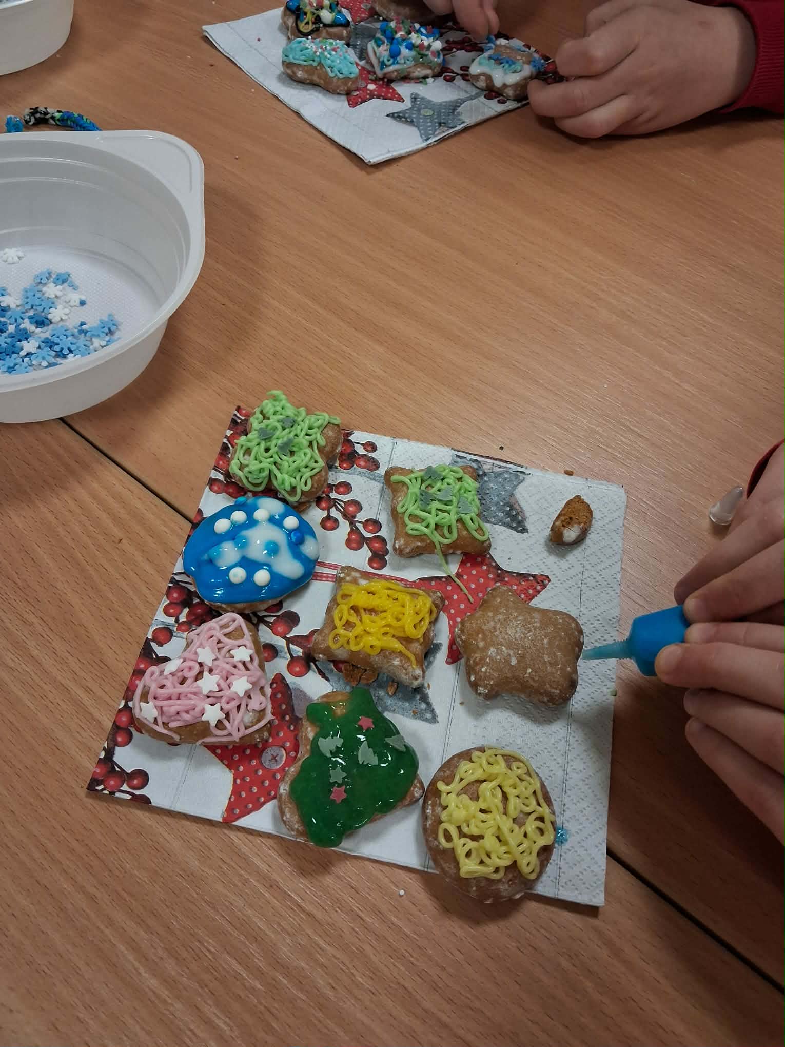 Każdy uczeń otrzymał pyszny, pachnący piernik, który czekał na metamorfozę. Na stołach pojawiły się kolorowe lukry, posypki, cukrowe perełki i inne ozdoby, które miały zamienić zwykłe ciasteczka w małe dzieła sztuki.