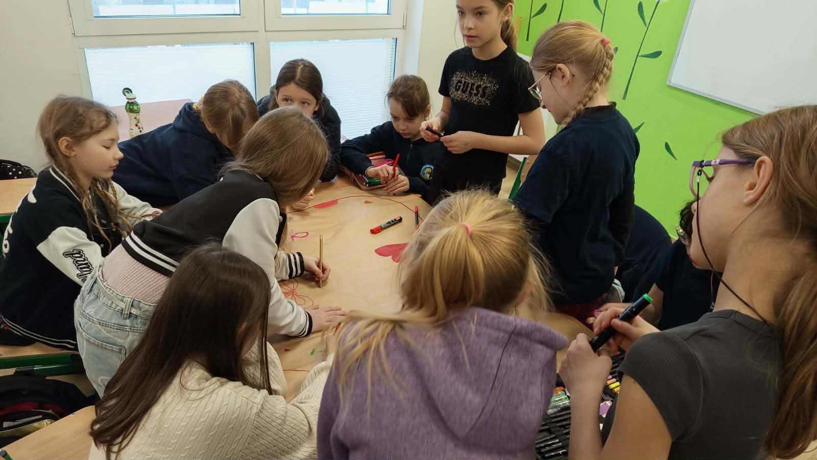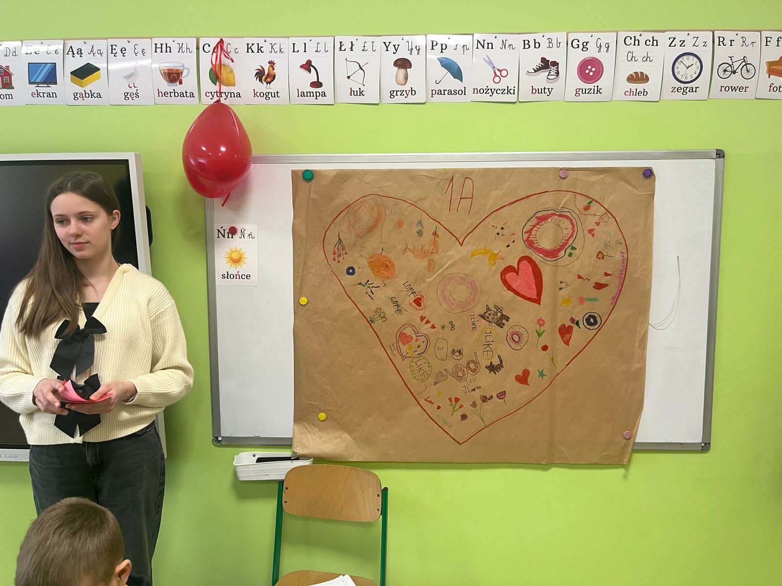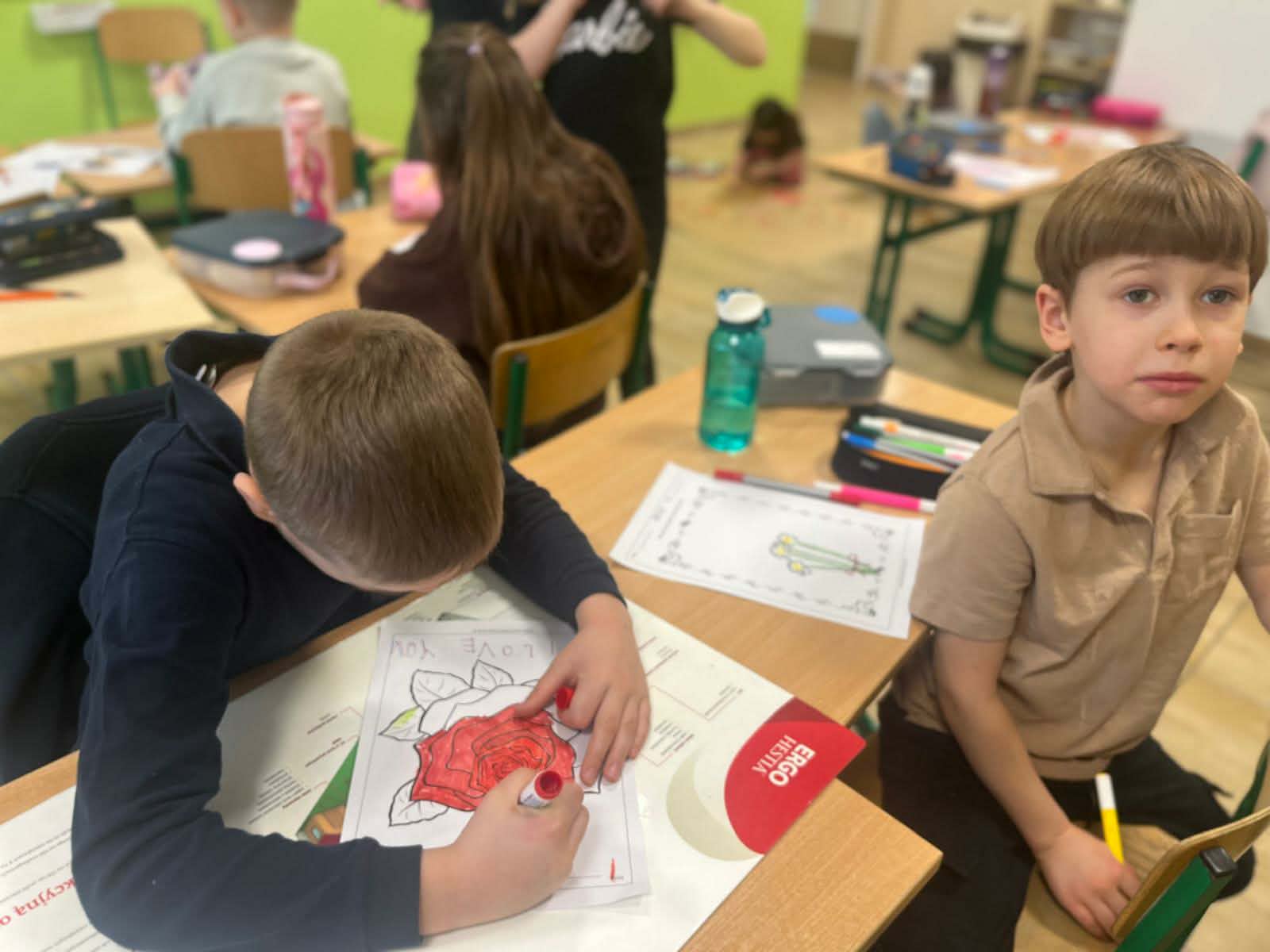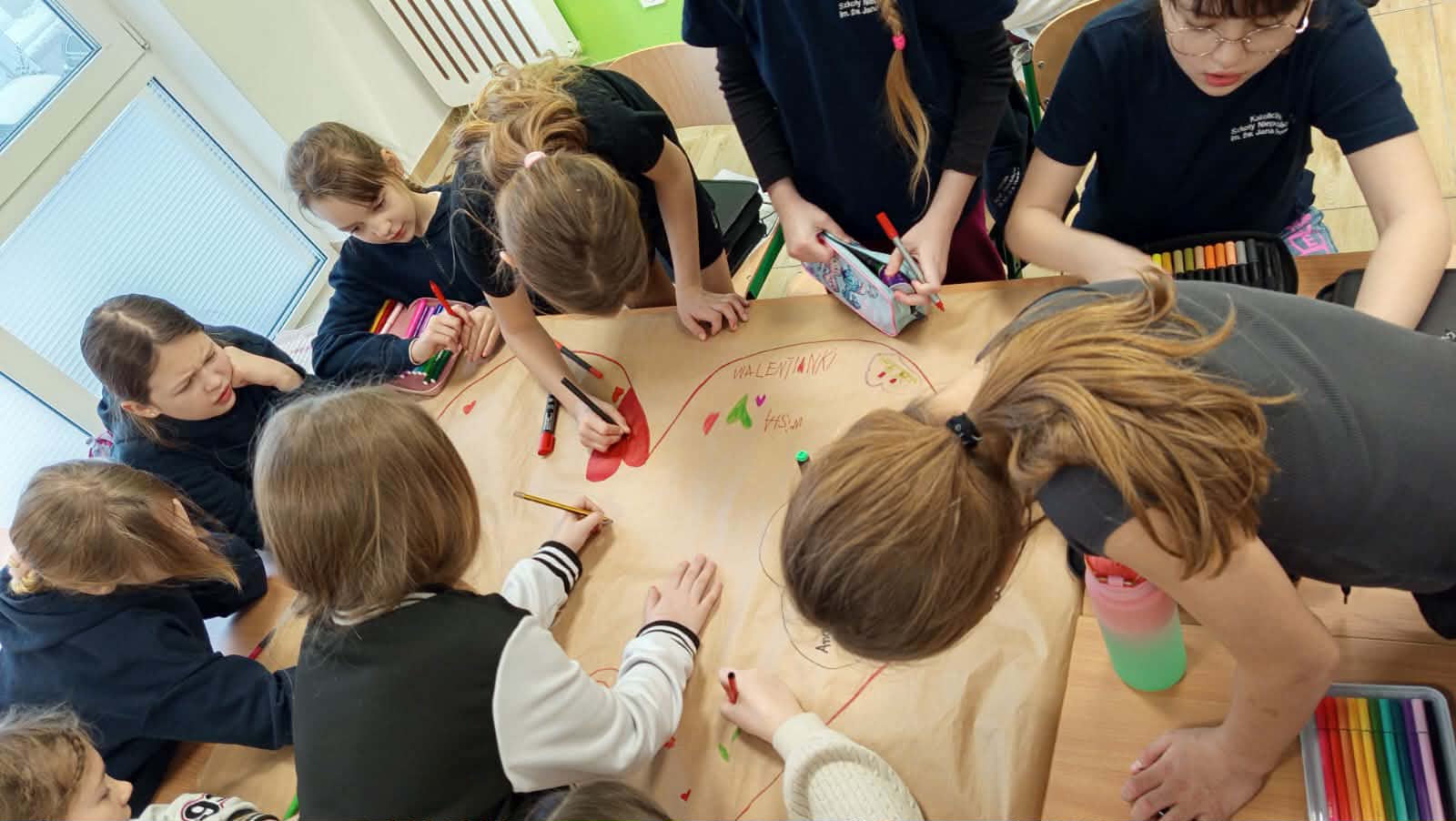 Najmłodsi uczniowie, z klas 0-3, mieli okazję spędzić wyjątkowe chwile w towarzystwie starszych kolegów i koleżanek z klas 7 i 8, którzy wcielili się w rolę wolontariuszy. Wspólnie realizowali oni szereg kreatywnych i angażujących aktywności. Powstawały klasowe walentynkowe serca, gdzie każdy mógł zostawić cząstkę siebie. Dzieciaki z zapałem grały w walentynkowe memory i domino, kolorowały tematyczne karty pracy i kolorowanki, a także tworzyły piękne, własnoręcznie wykonane walentynki. Oczywiście, nie zabrakło rozmów o samej istocie Walentynek. Uśmiechy na twarzach dzieci i zaangażowanie wolontariuszy świadczyły o doskonałej zabawie. Wychowawczynie również aktywnie uczestniczyły w zajęciach, wspierając i motywując młodszych uczniów.