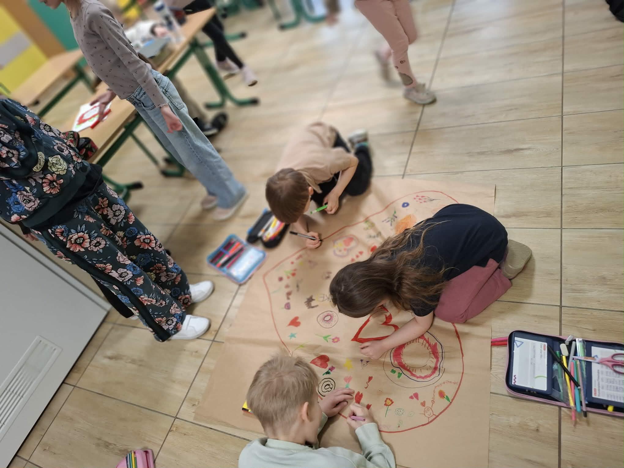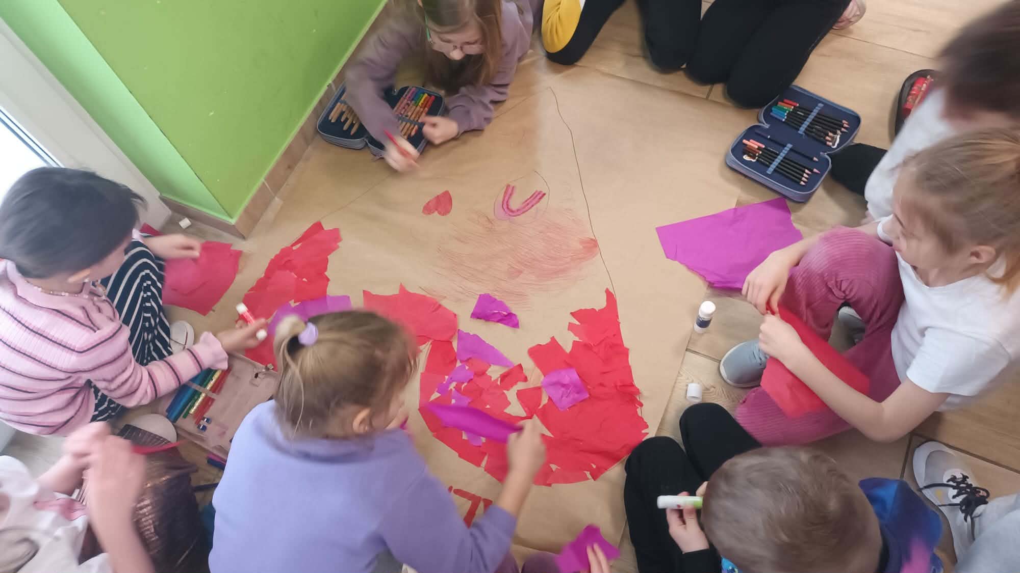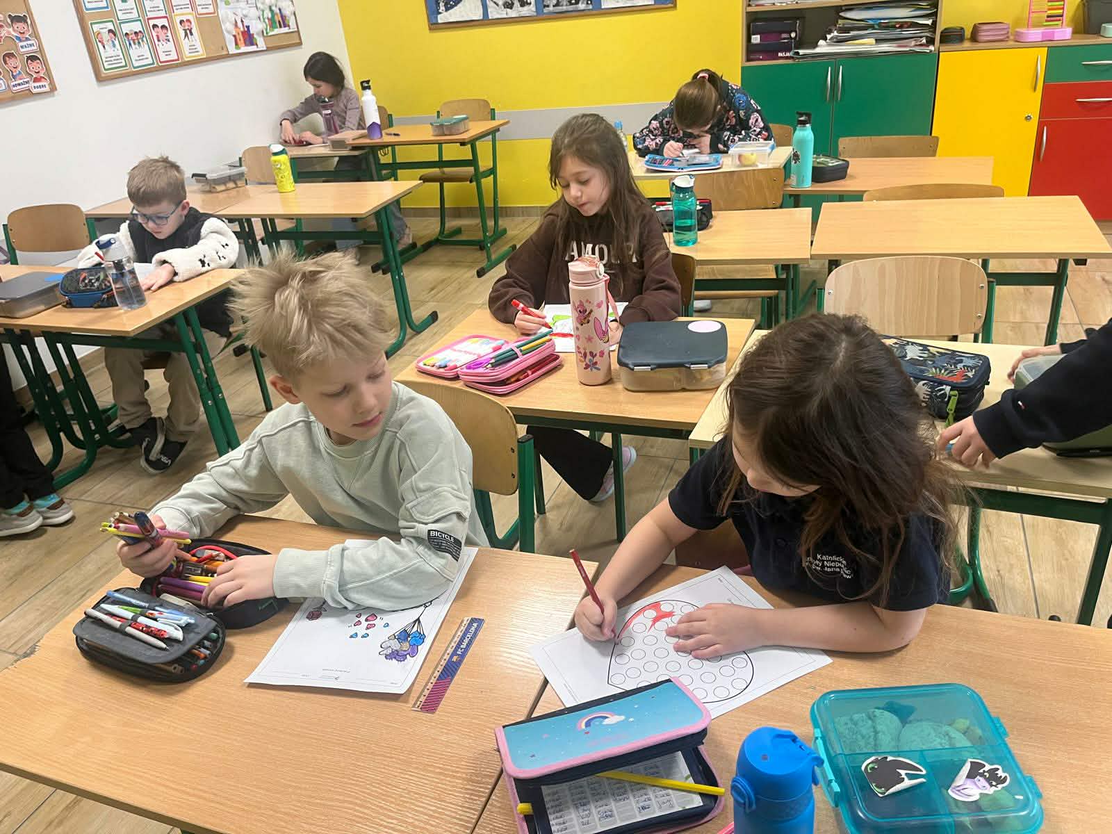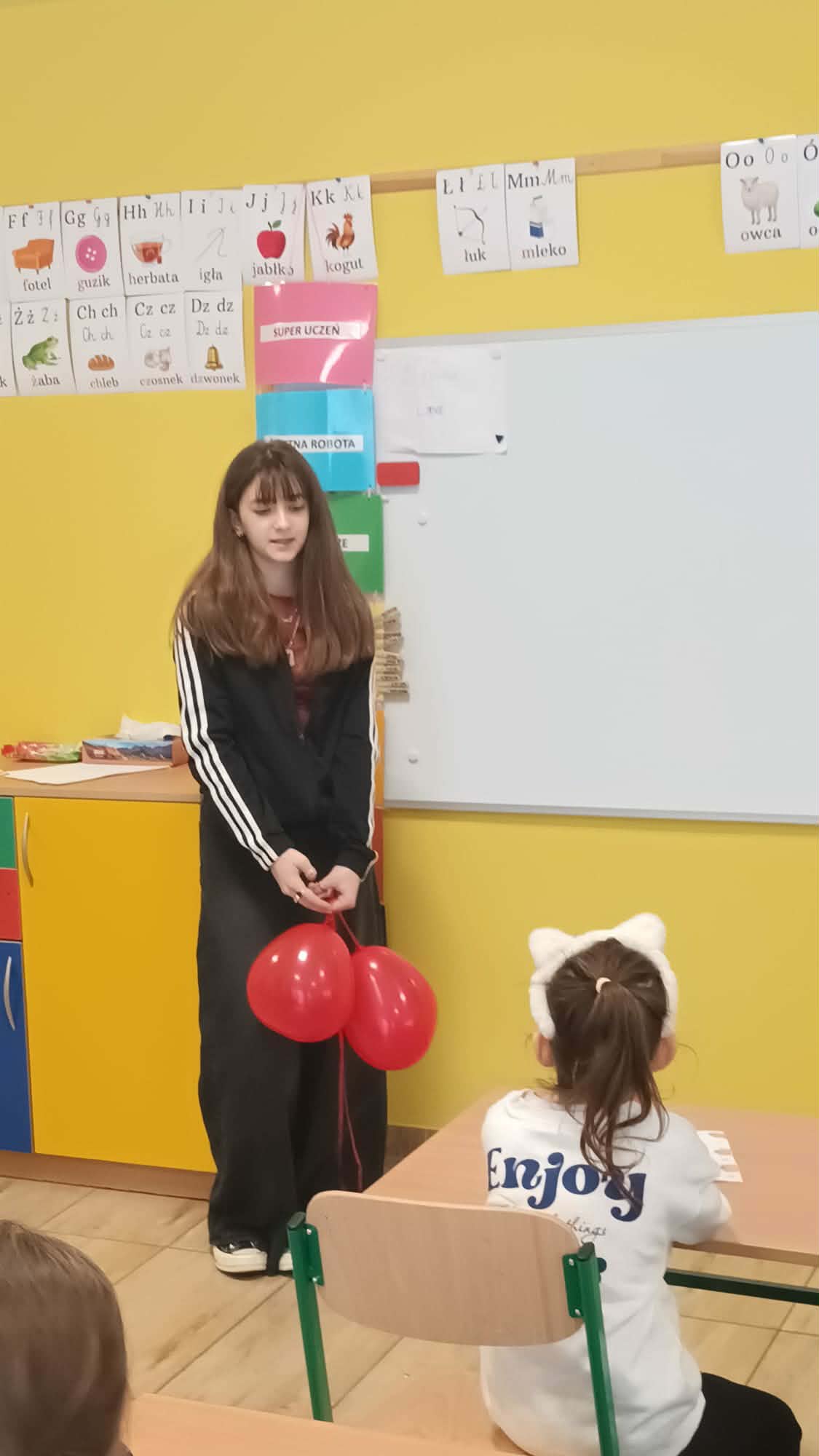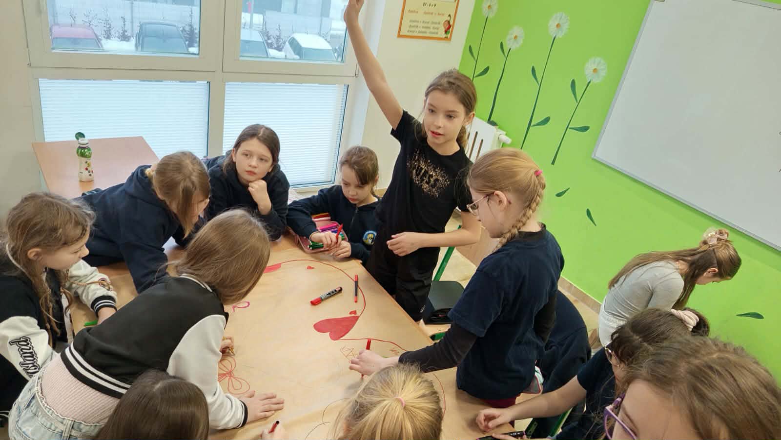 Najmłodsi uczniowie, z klas 0-3, mieli okazję spędzić wyjątkowe chwile w towarzystwie starszych kolegów i koleżanek z klas 7 i 8, którzy wcielili się w rolę wolontariuszy. Wspólnie realizowali oni szereg kreatywnych i angażujących aktywności. Powstawały klasowe walentynkowe serca, gdzie każdy mógł zostawić cząstkę siebie. Dzieciaki z zapałem grały w walentynkowe memory i domino, kolorowały tematyczne karty pracy i kolorowanki, a także tworzyły piękne, własnoręcznie wykonane walentynki. Oczywiście, nie zabrakło rozmów o samej istocie Walentynek. Uśmiechy na twarzach dzieci i zaangażowanie wolontariuszy świadczyły o doskonałej zabawie. Wychowawczynie również aktywnie uczestniczyły w zajęciach, wspierając i motywując młodszych uczniów.