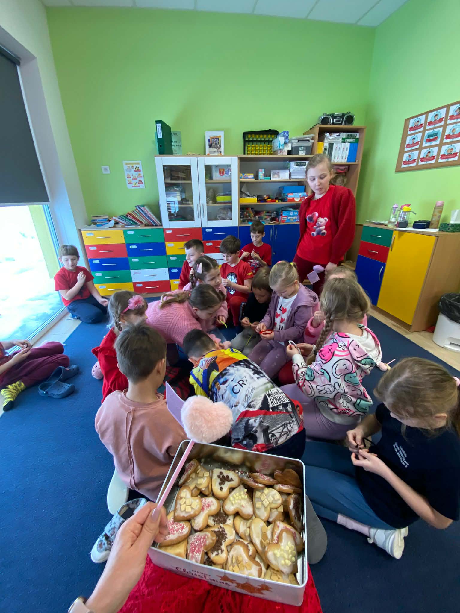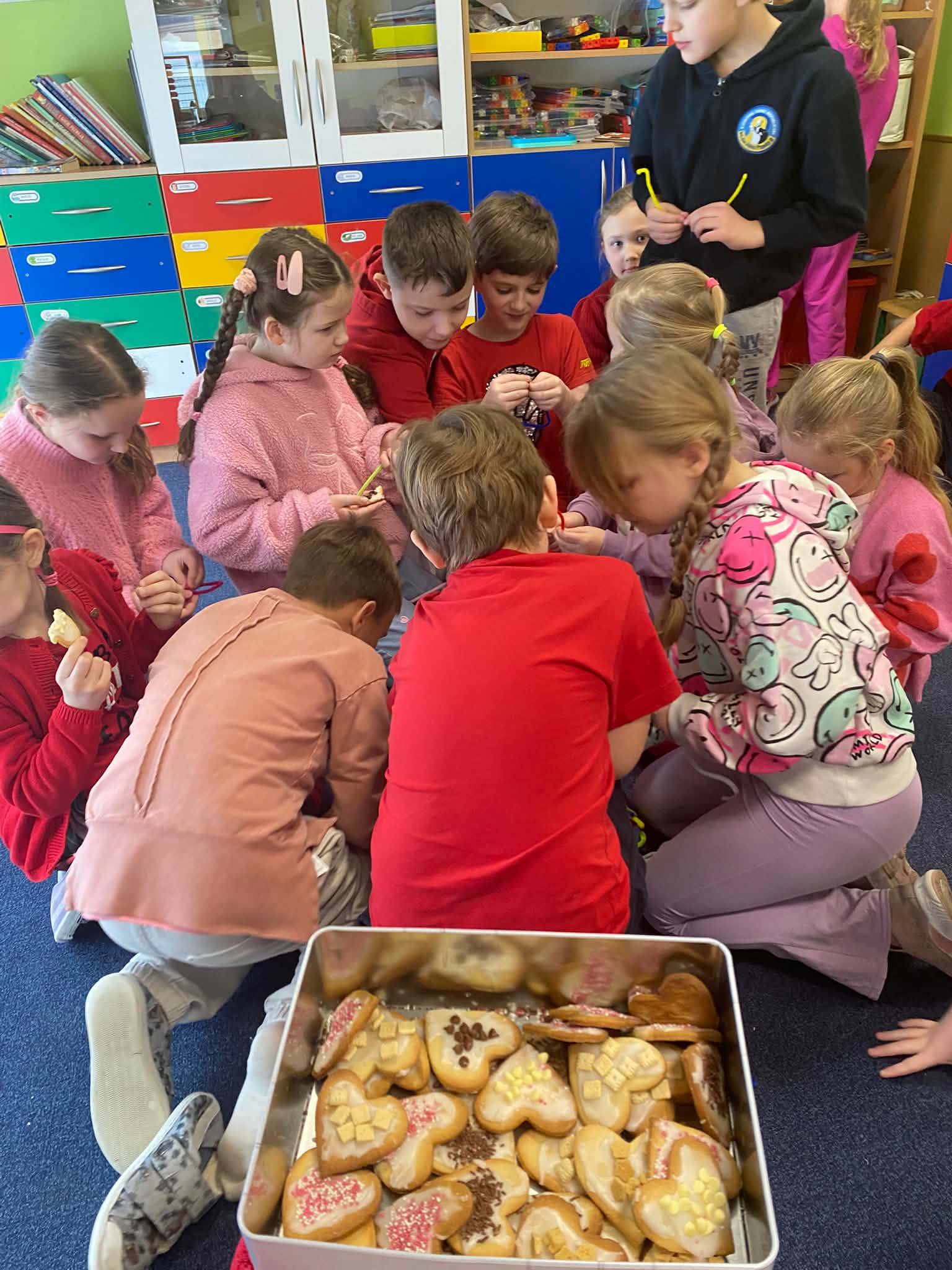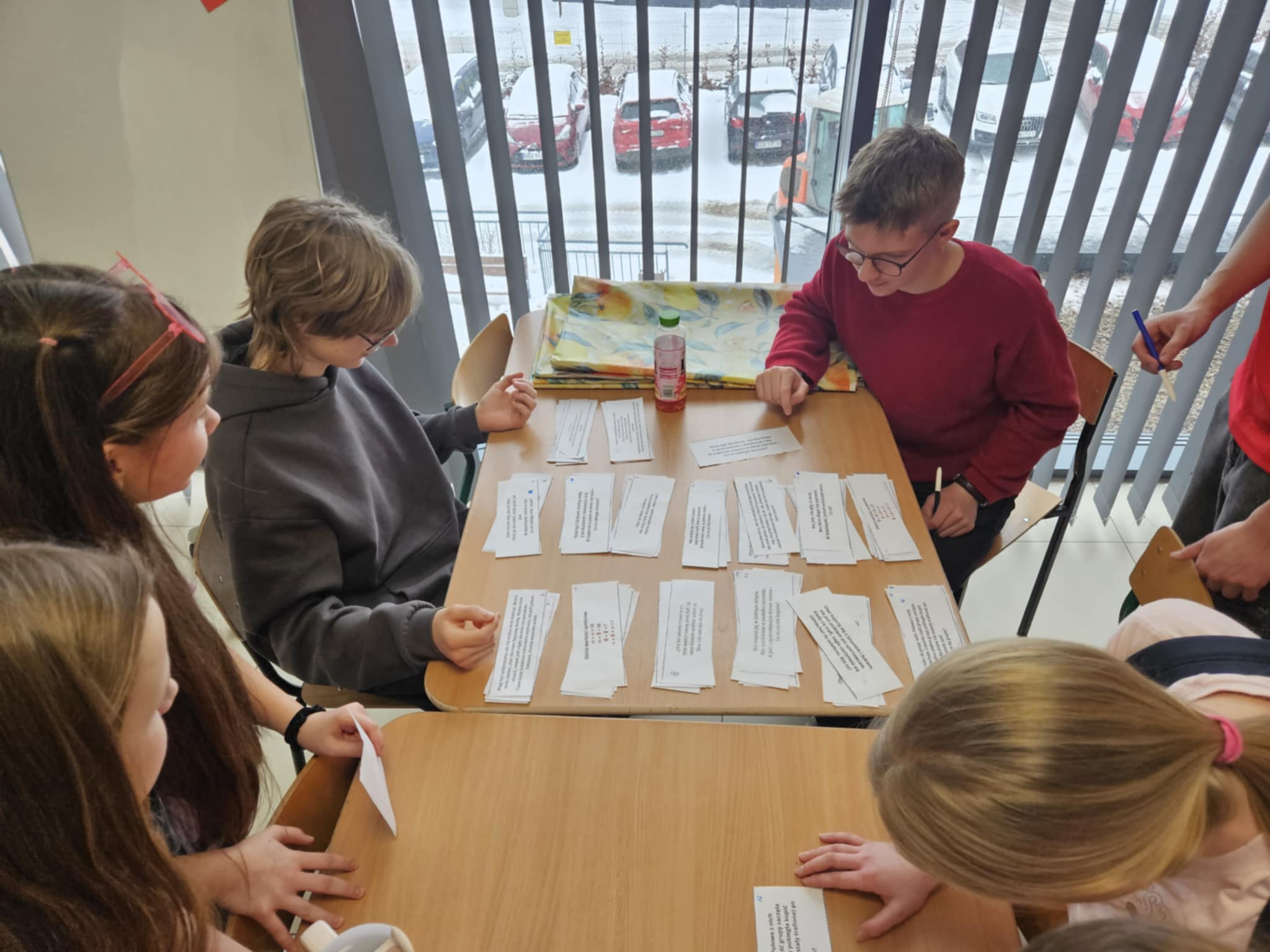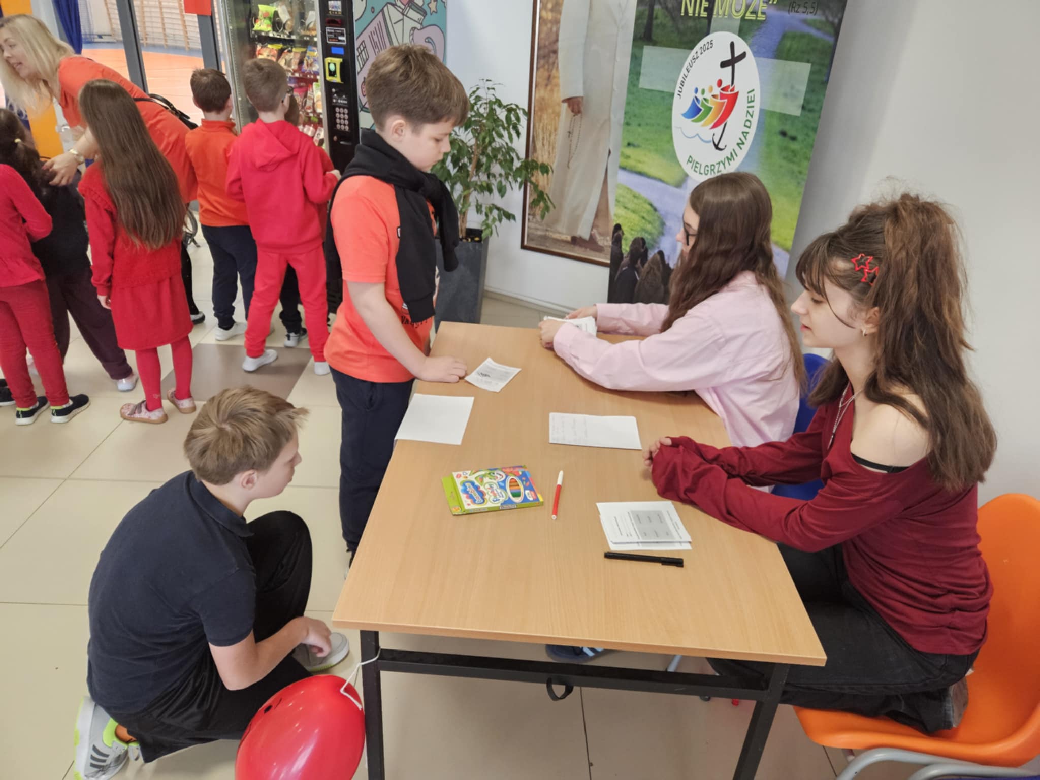 Najmłodsi uczniowie, z klas 0-3, mieli okazję spędzić wyjątkowe chwile w towarzystwie starszych kolegów i koleżanek z klas 7 i 8, którzy wcielili się w rolę wolontariuszy. Wspólnie realizowali oni szereg kreatywnych i angażujących aktywności. Powstawały klasowe walentynkowe serca, gdzie każdy mógł zostawić cząstkę siebie. Dzieciaki z zapałem grały w walentynkowe memory i domino, kolorowały tematyczne karty pracy i kolorowanki, a także tworzyły piękne, własnoręcznie wykonane walentynki. Oczywiście, nie zabrakło rozmów o samej istocie Walentynek. Uśmiechy na twarzach dzieci i zaangażowanie wolontariuszy świadczyły o doskonałej zabawie. Wychowawczynie również aktywnie uczestniczyły w zajęciach, wspierając i motywując młodszych uczniów.
