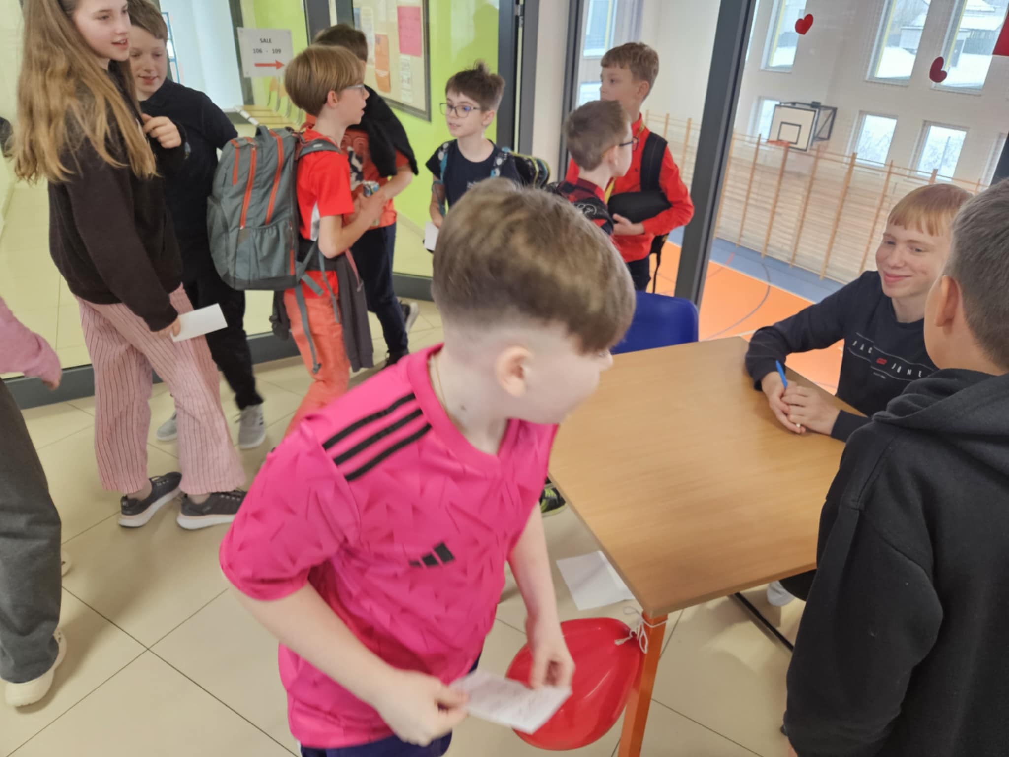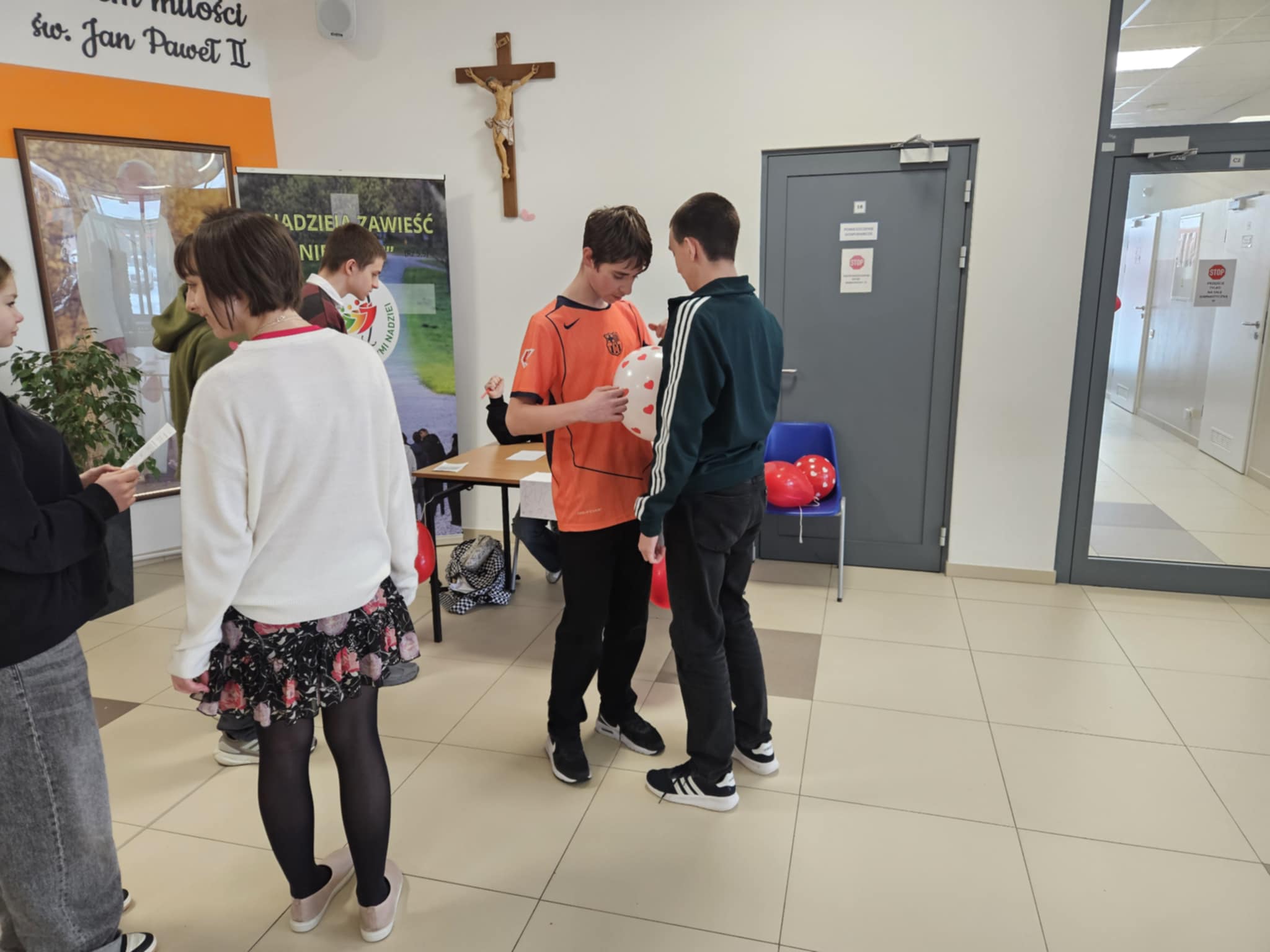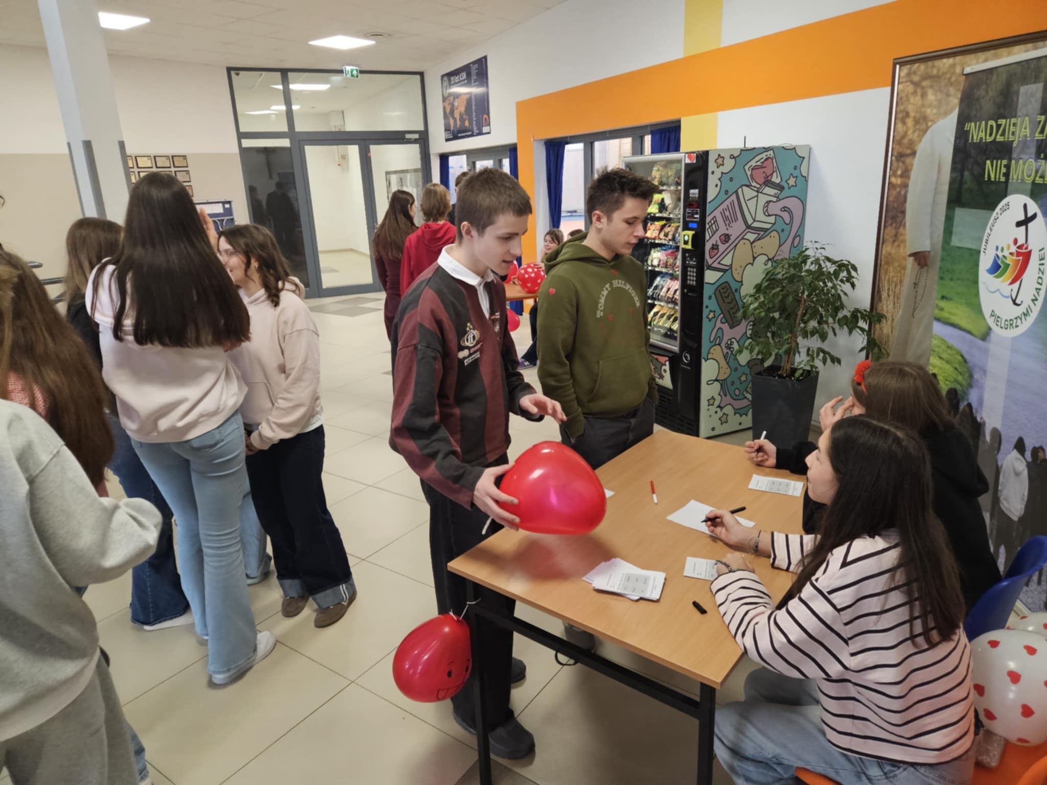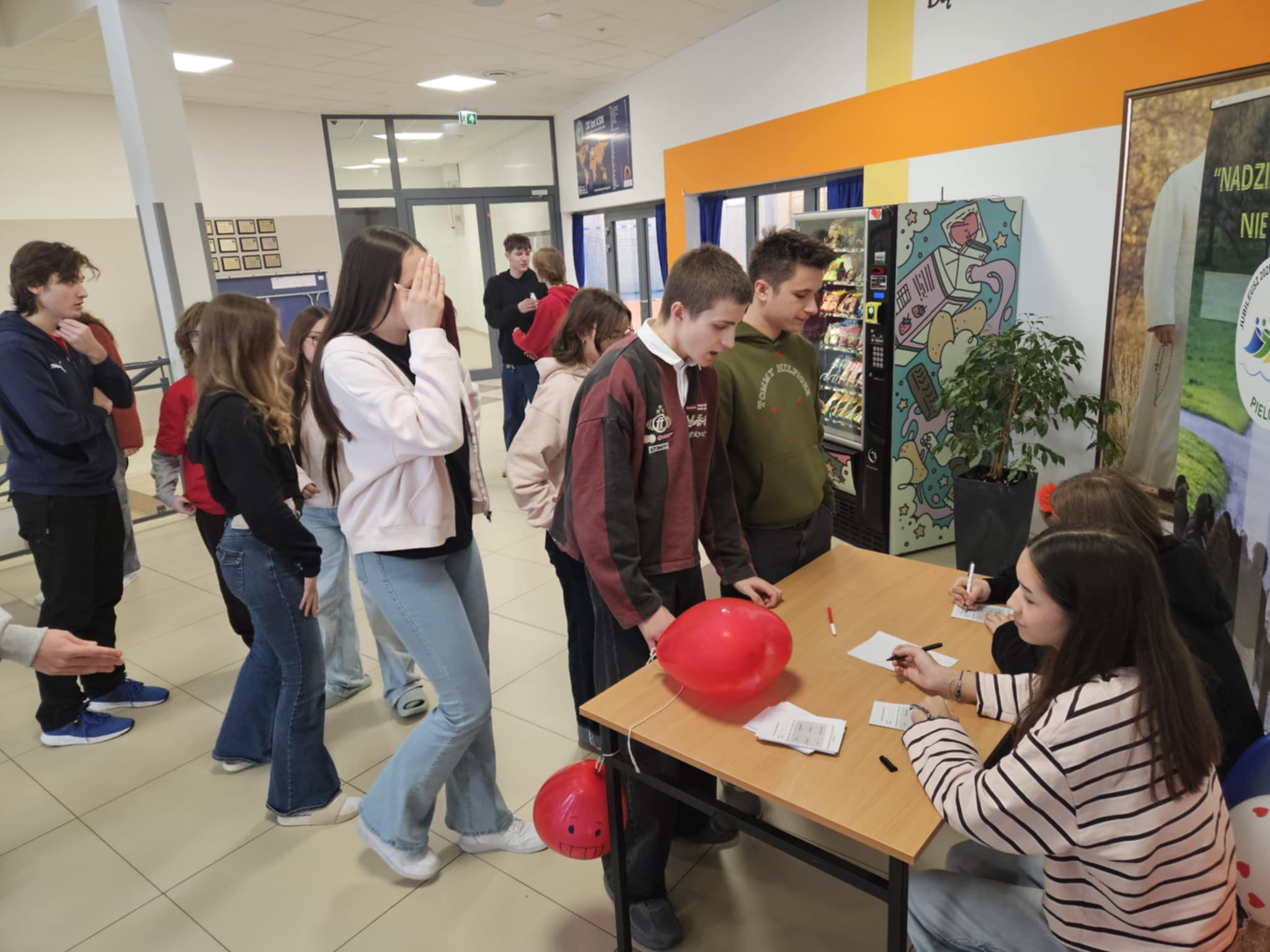 Kulminacyjnym punktem dnia były walentynkowe wyzwania, które czekały na uczniów klas 4-7 na czwartej lekcji, a na klasy 8-LO na trzeciej. Na holu na parterze, antresoli i na II piętrze, przygotowano szereg zadań, które uczniowie wykonywali w parach. Nagrodą za podjęcie wyzwań były słodkie upominki, co dodatkowo motywowało do wspólnej zabawy i integracji.