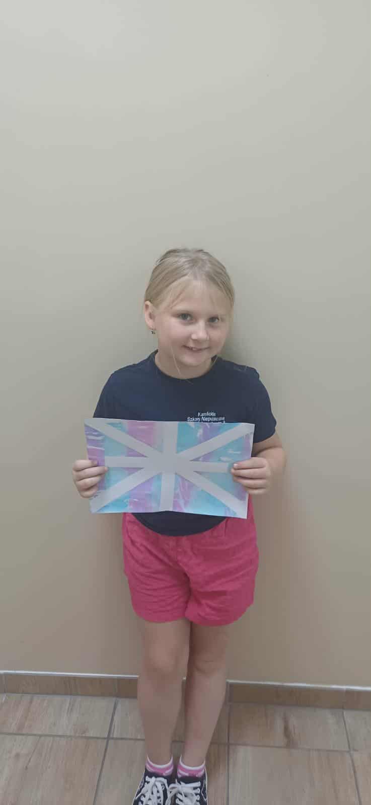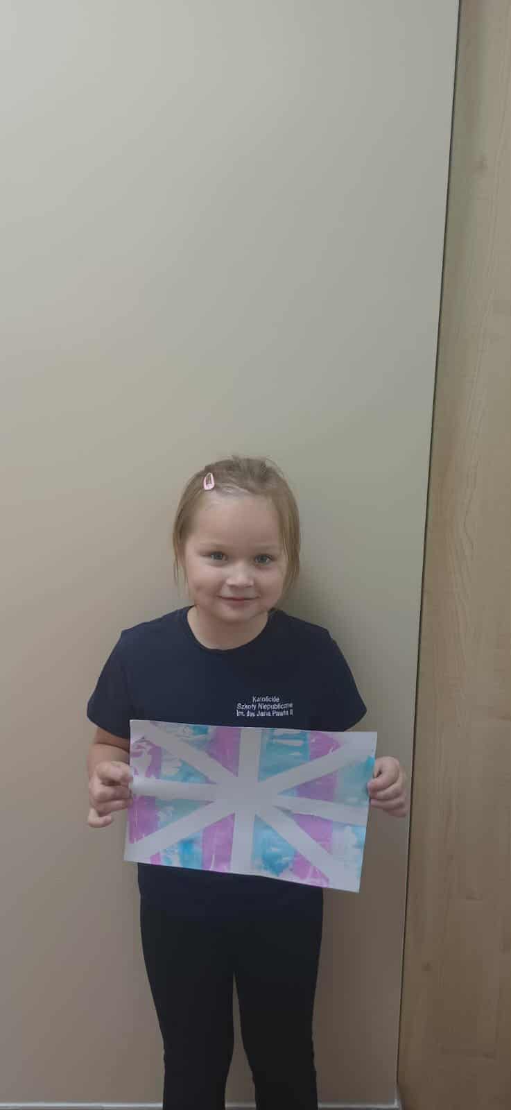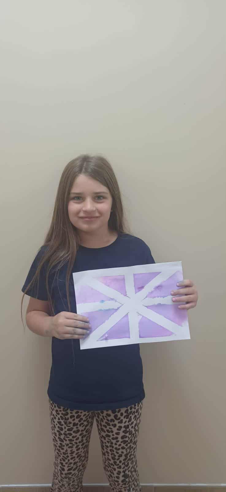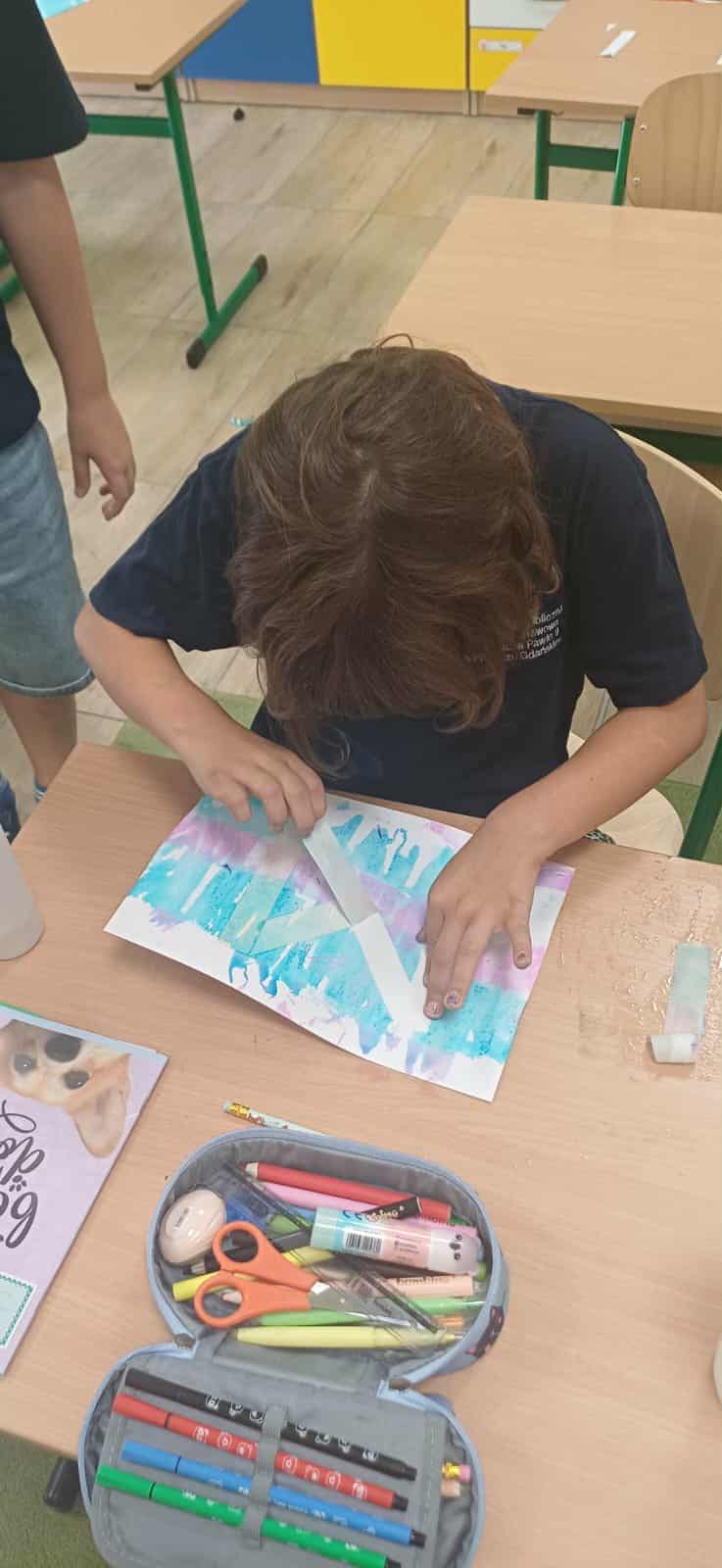 Na koniec uczniowie odklejali taśmę, odkrywając piękne, niepowtarzalne wzory i efekty, które powstały pod wpływem farbującej się bibuły. Każdy projekt jest unikalny i pełen wyobraźni.