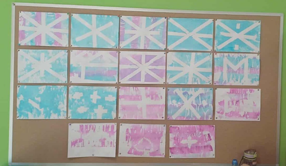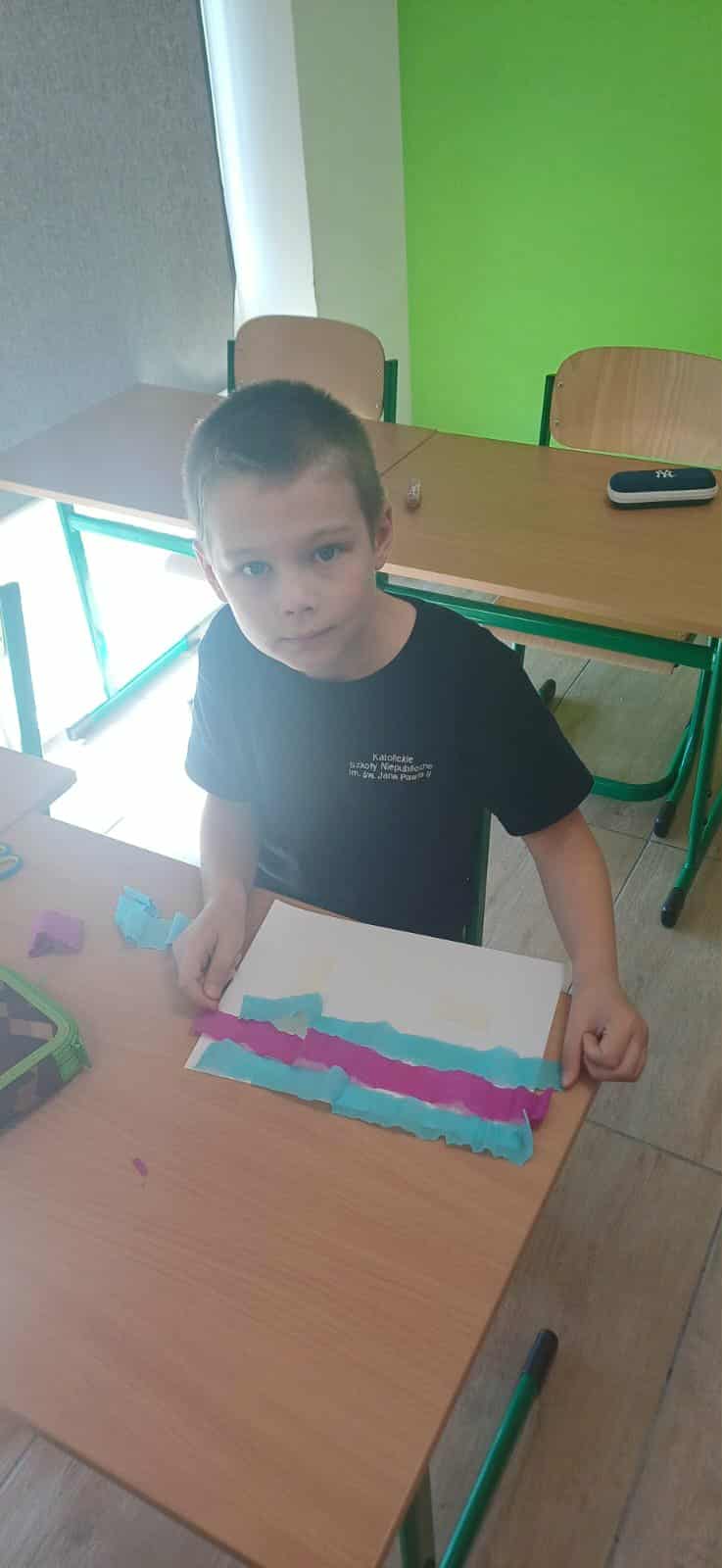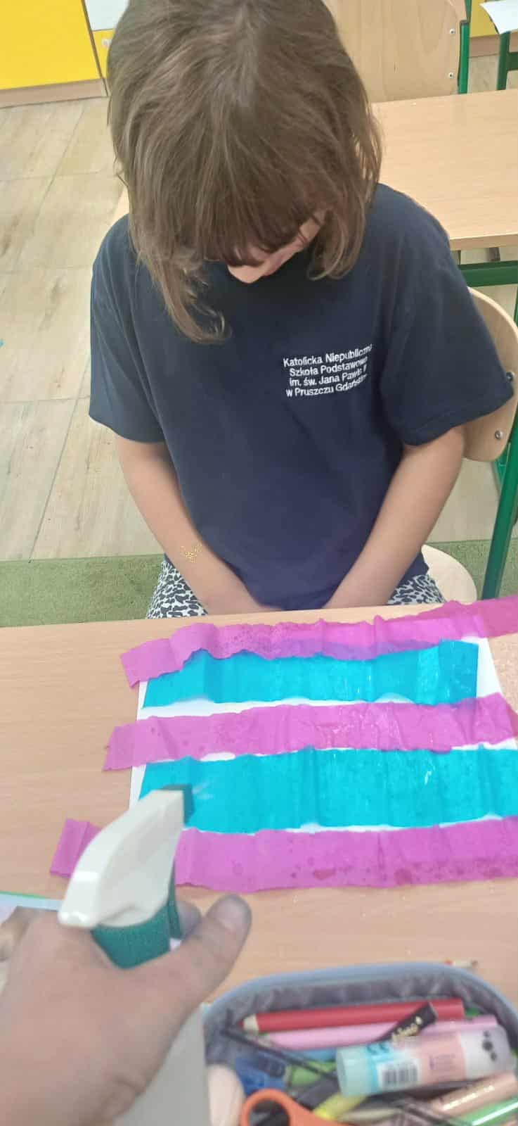 Podczas zajęć uczniowie najpierw przyklejali taśmę na kartki, tworząc różnorodne wzory i kształty. Następnie nakładali na kartkę kolorową bibułę, którą starannie układali, tworząc interesujące kompozycje. Kolejnym etapem było spryskanie kartki wodą – dzięki temu bibuła zaczynała się farbować, co dodawało pracom wyjątkowego efektu kolorystycznego.