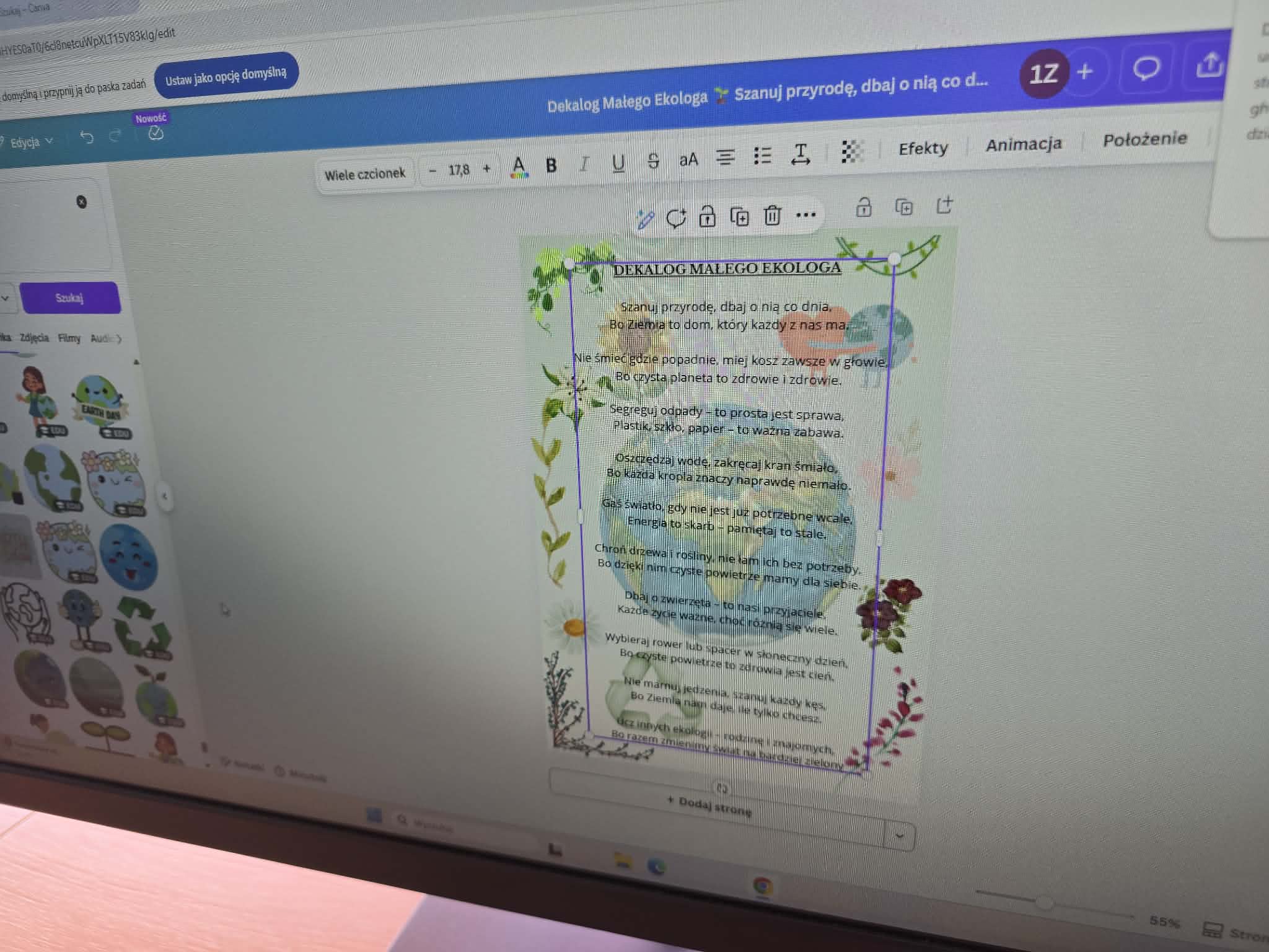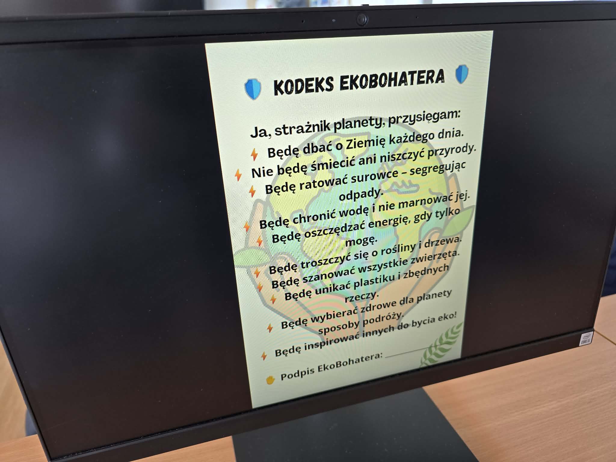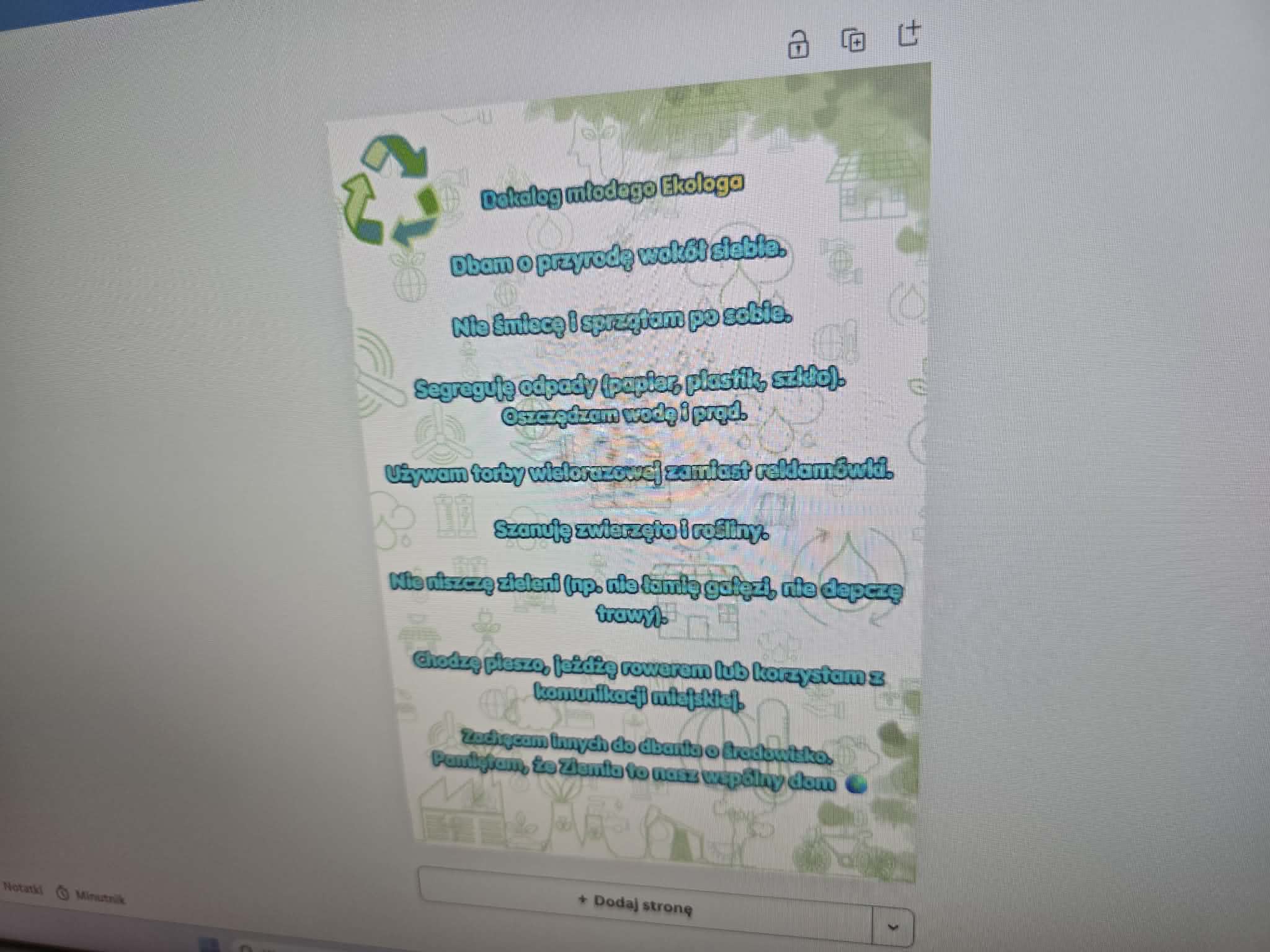 W związku z obchodami Tygodnia Ziemi uczniowie podczas zajęć z informatyki e klasie 7 zaangażowali się w kreatywne działania na rzecz ochrony środowiska. Tym razem połączyli wiedzę ekologiczną z umiejętnościami cyfrowymi, tworząc plakaty przedstawiające Dekalog Małego Ekologa.