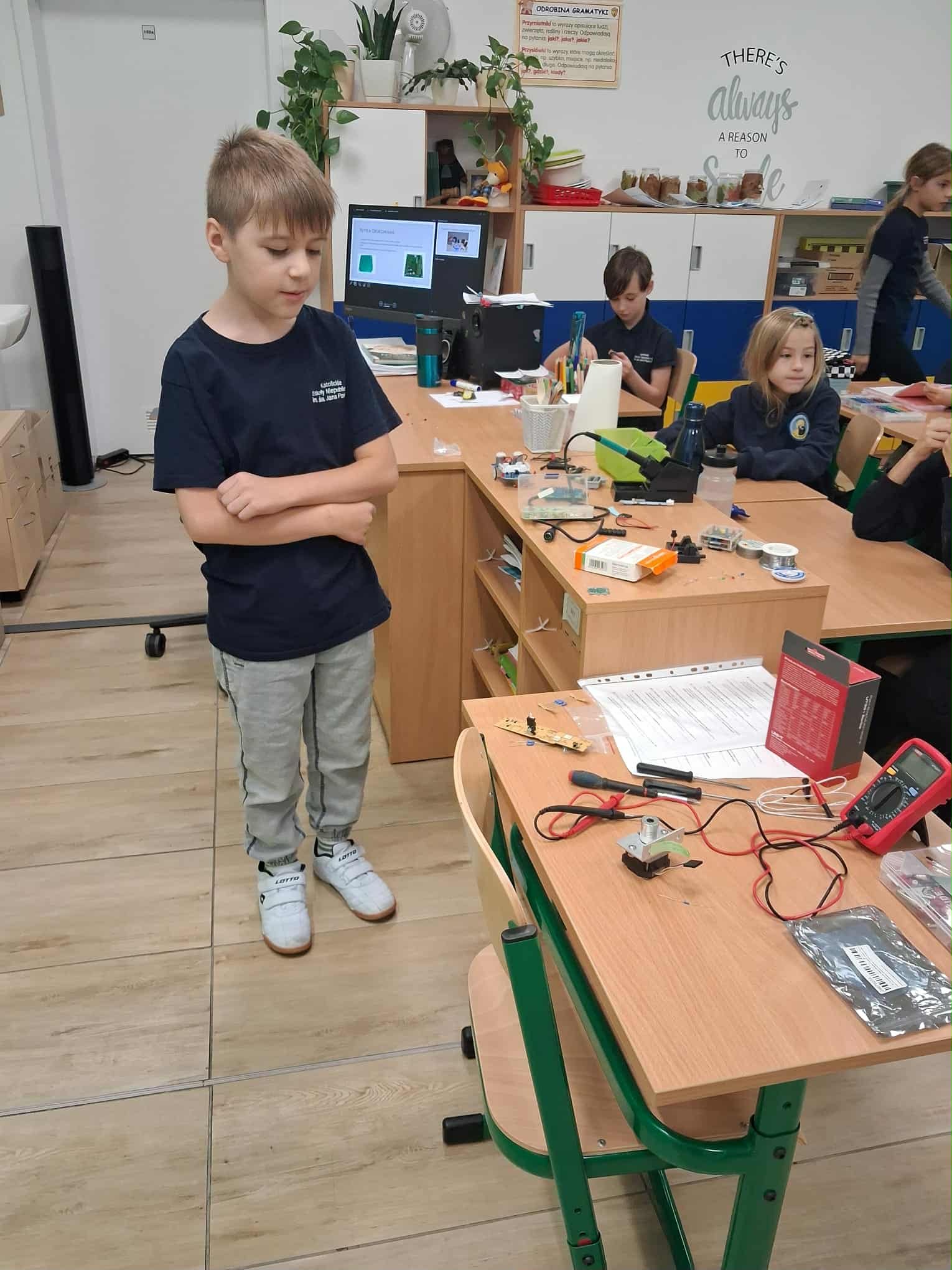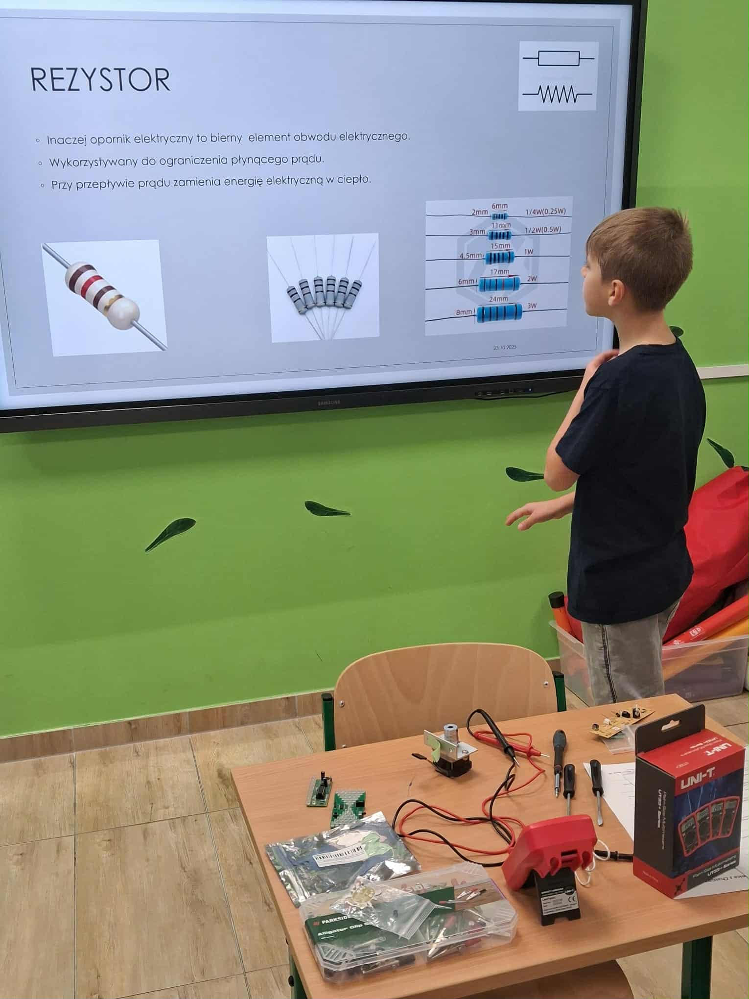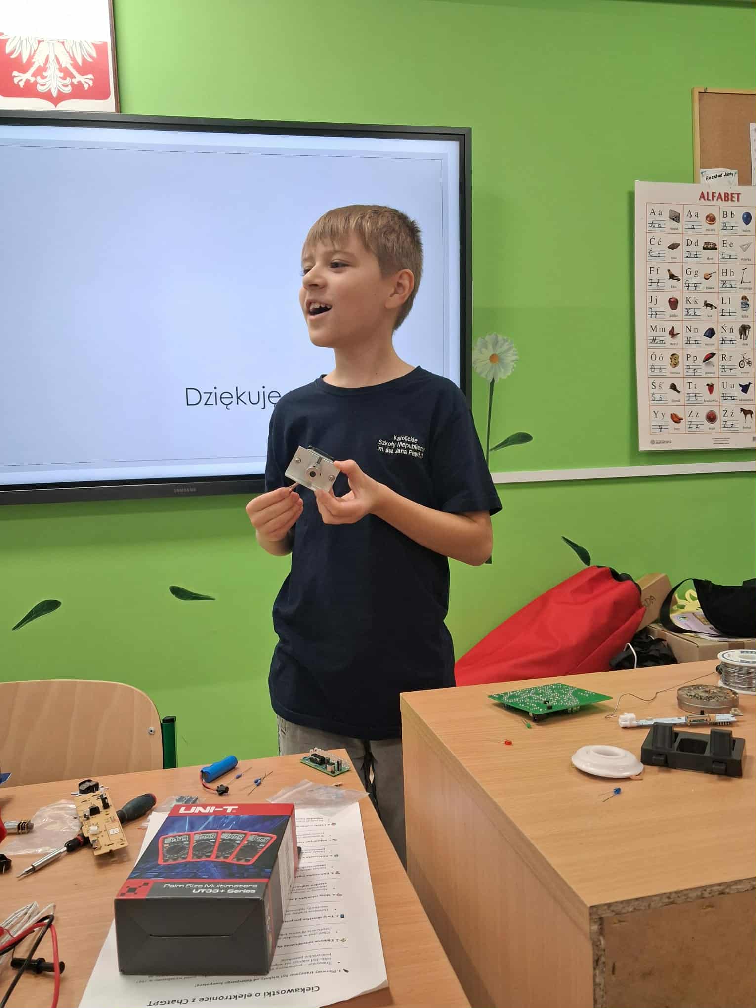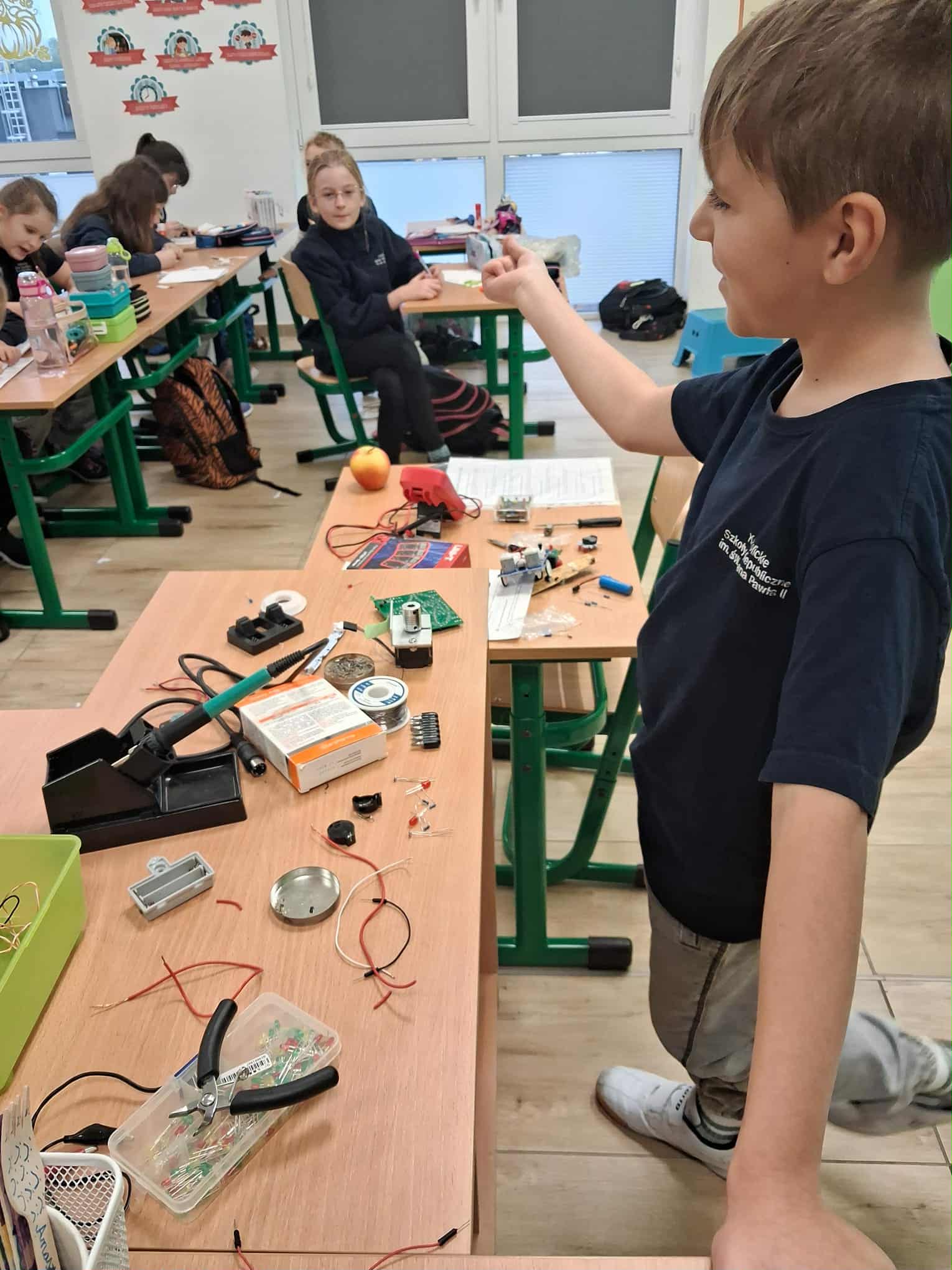 Uczniowie z zainteresowaniem słuchali Adama, który w ciekawy i przystępny sposób opowiadał o obwodach elektrycznych, źródłach energii oraz zasadach bezpiecznego korzystania z prądu. Pokazał też, jak działa lutownica, diody i inne urządzenia — dzięki czemu teoria zamieniła się w praktykę! Takie zajęcia to świetny przykład nauki przez doświadczenie. Dziękujemy za odwagę, zaangażowanie i świetnie poprowadzoną lekcję!