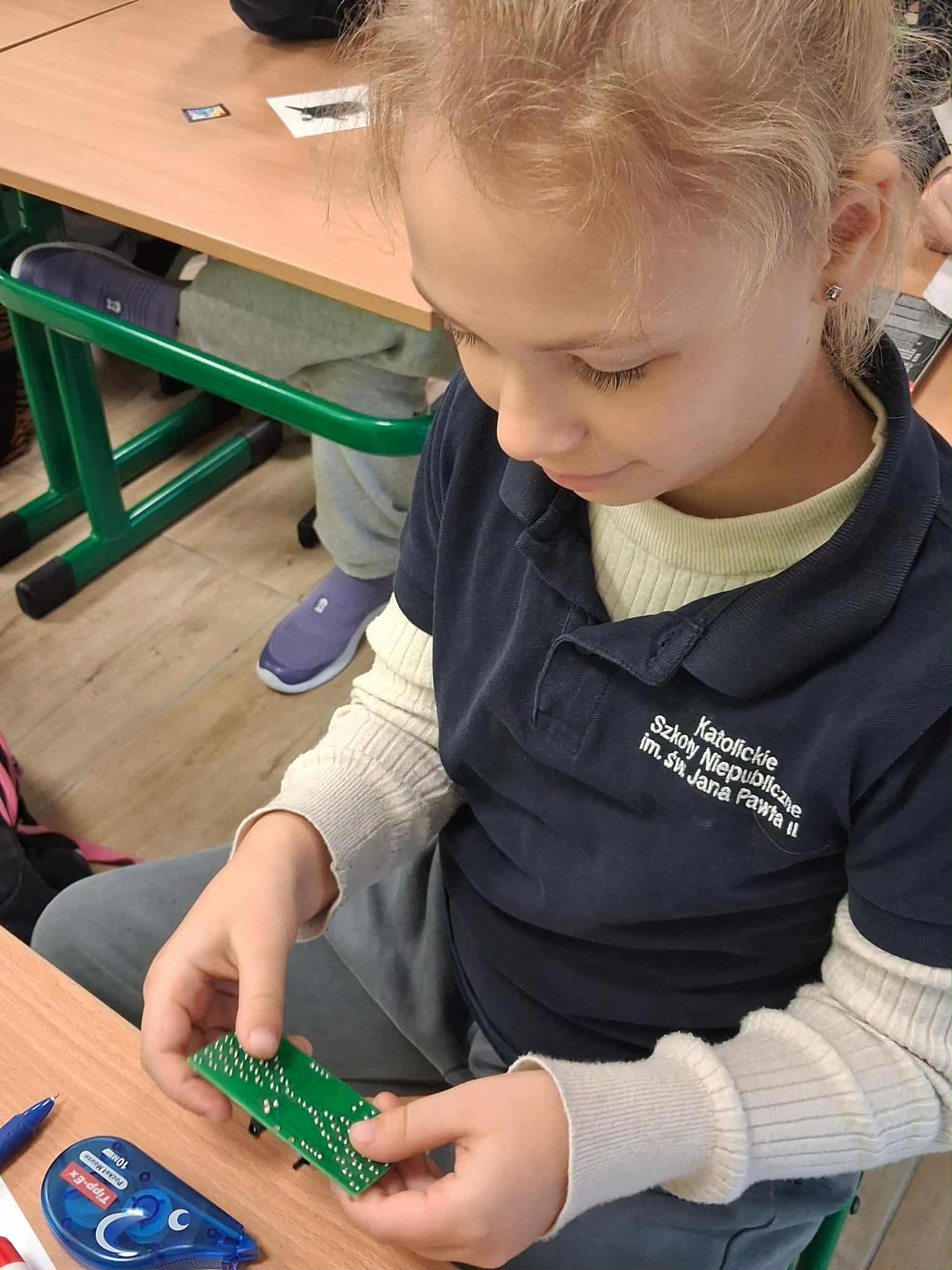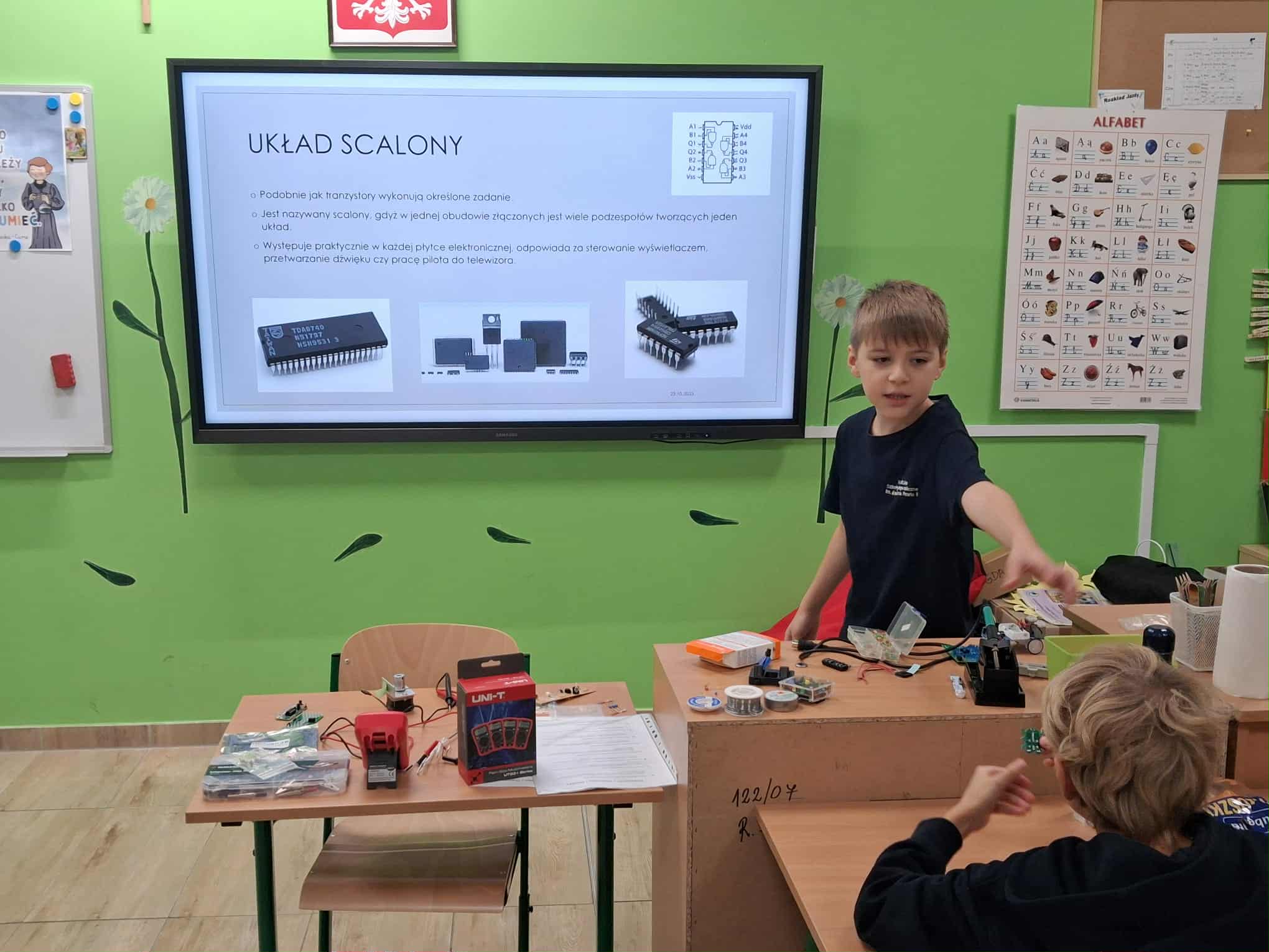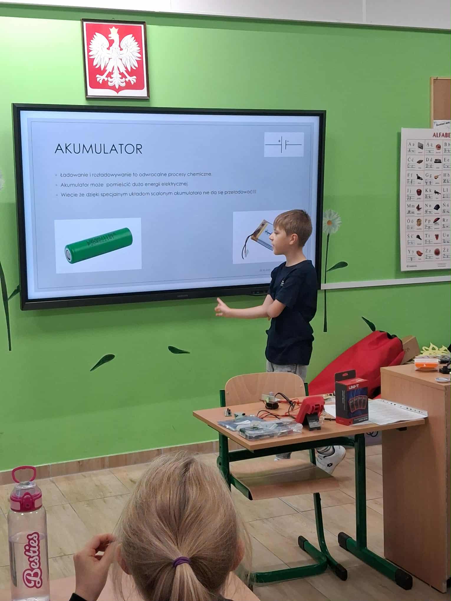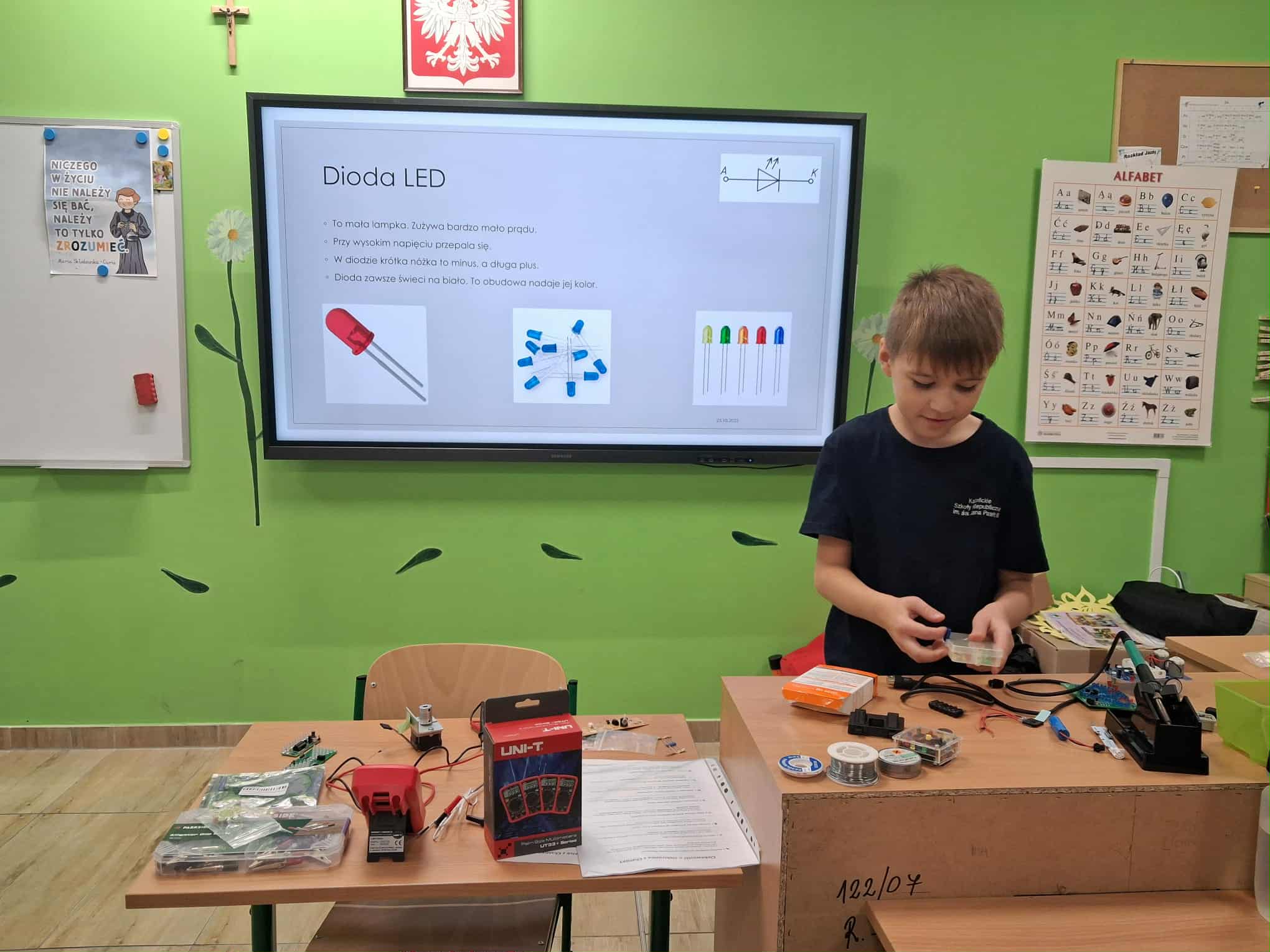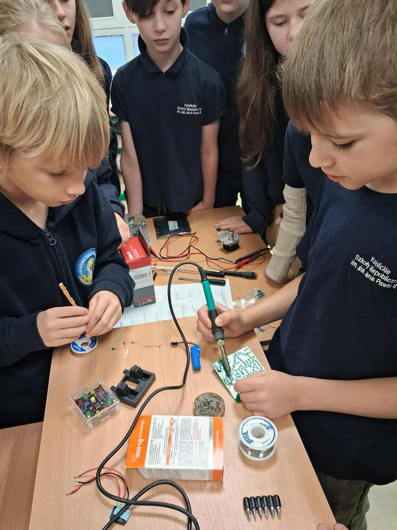 Uczniowie z zainteresowaniem słuchali Adama, który w ciekawy i przystępny sposób opowiadał o obwodach elektrycznych, źródłach energii oraz zasadach bezpiecznego korzystania z prądu. Pokazał też, jak działa lutownica, diody i inne urządzenia — dzięki czemu teoria zamieniła się w praktykę! Takie zajęcia to świetny przykład nauki przez doświadczenie. Dziękujemy za odwagę, zaangażowanie i świetnie poprowadzoną lekcję!