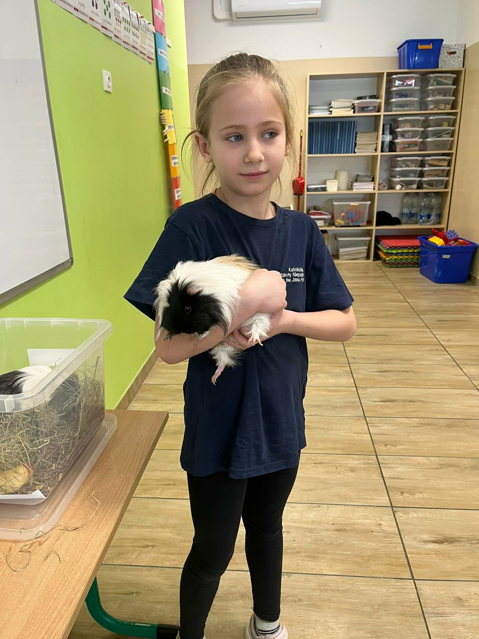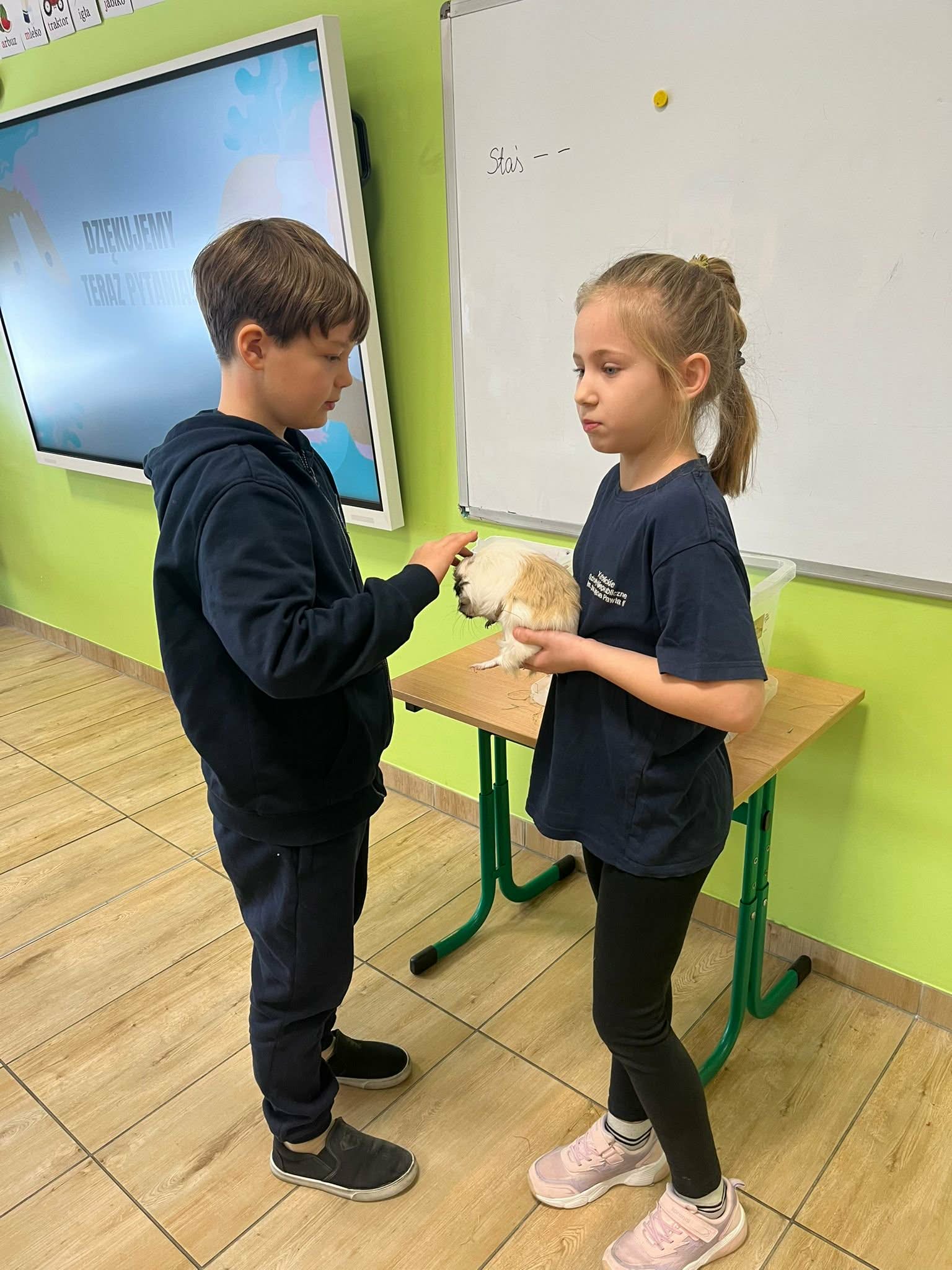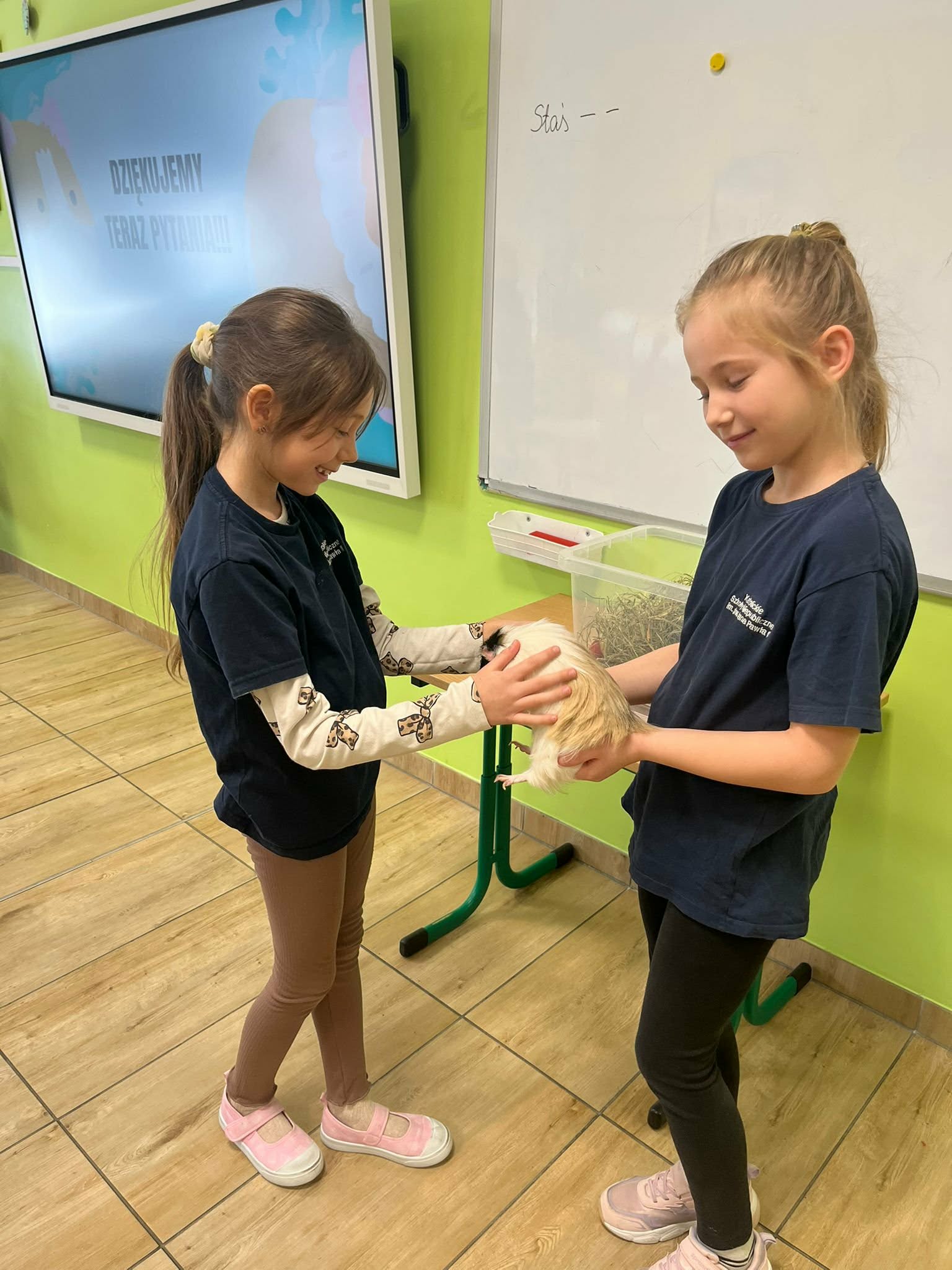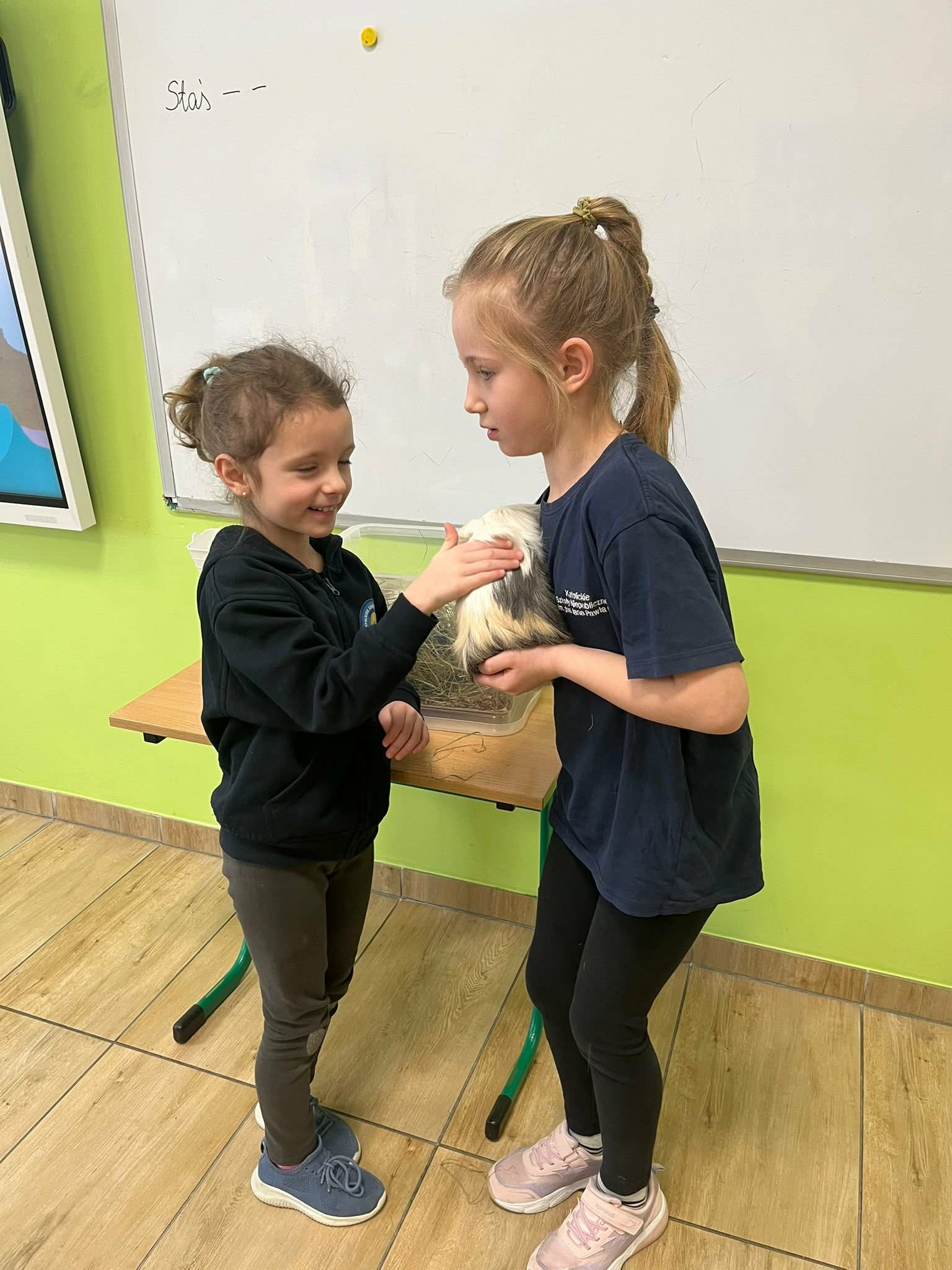 Dziś w klasie 1a odbyła się wyjątkowa lekcja! Nasza uczennica, Zosia, wcieliła się w rolę nauczycielki i poprowadziła zajęcia na temat świnek morskich. Zosia była doskonale przygotowana – zaprezentowała przygotowaną przez siebie prezentację, w której opowiedziała o życiu, zwyczajach oraz potrzebach świnek morskich. W niezwykle ciekawy sposób przedstawiła wiele interesujących informacji, a także z dużym zaangażowaniem odpowiadała na – wcale nie takie łatwe – pytania zadawane przez kolegów i koleżanki z klasy. Największą atrakcją były jednak wyjątkowe goście – dwie świnki morskie należące do Zosi: Lila i Lawa. To mama i córka, które wzbudziły ogromne zainteresowanie i sympatię całej klasy. Dzieci miały okazję nie tylko dowiedzieć się wielu ciekawostek, ale także pogłaskać zwierzątka pod czujnym okiem właścicielki. Na zakończenie uczniowie otrzymali kolorowanki ze świnkami morskimi, które z radością wypełniali barwami. To była wspaniała lekcja pełna wiedzy, uśmiechu i pozytywnych emocji. Gratulujemy Zosi odwagi, zaangażowania i świetnego przygotowania zajęć!
