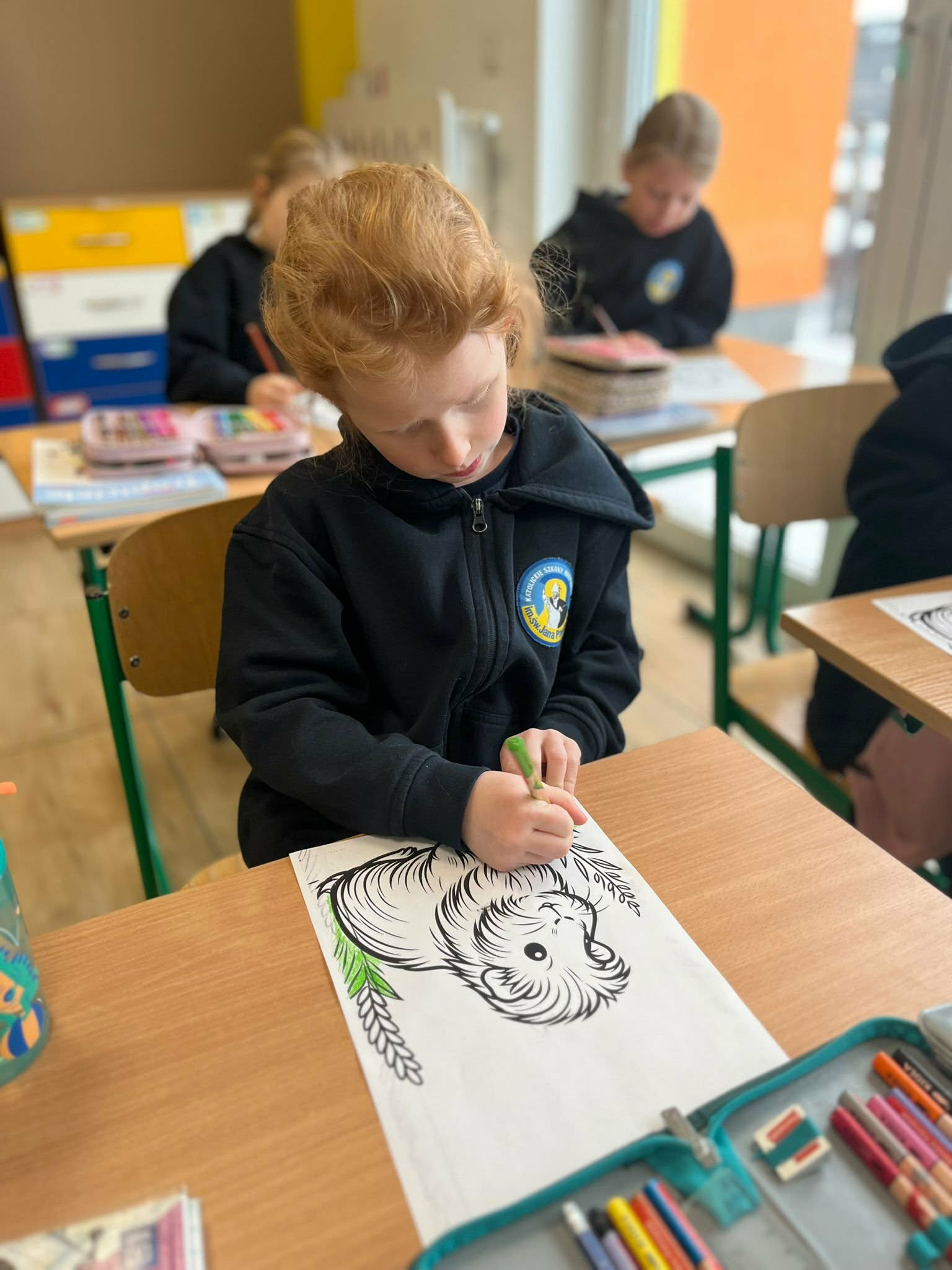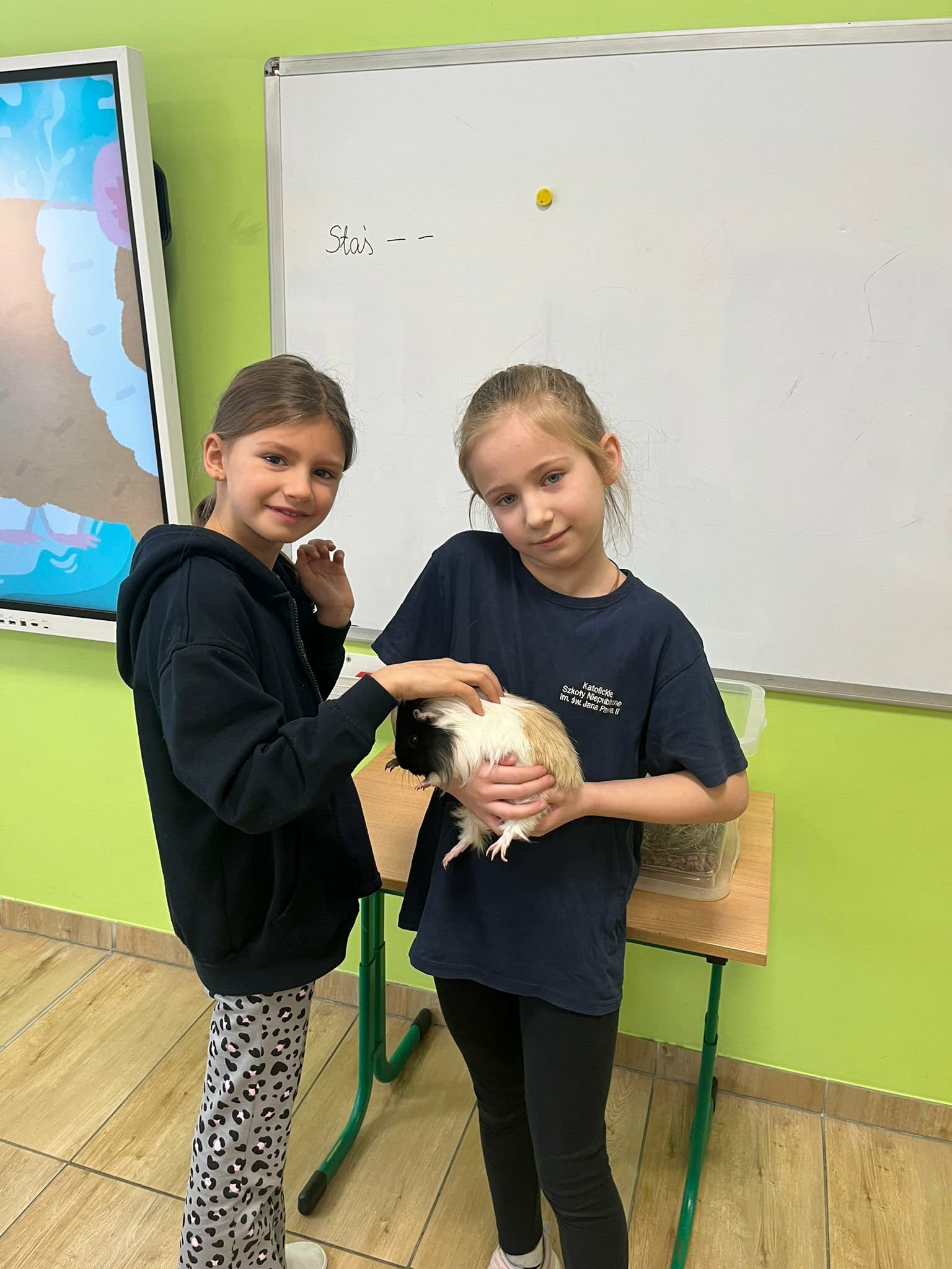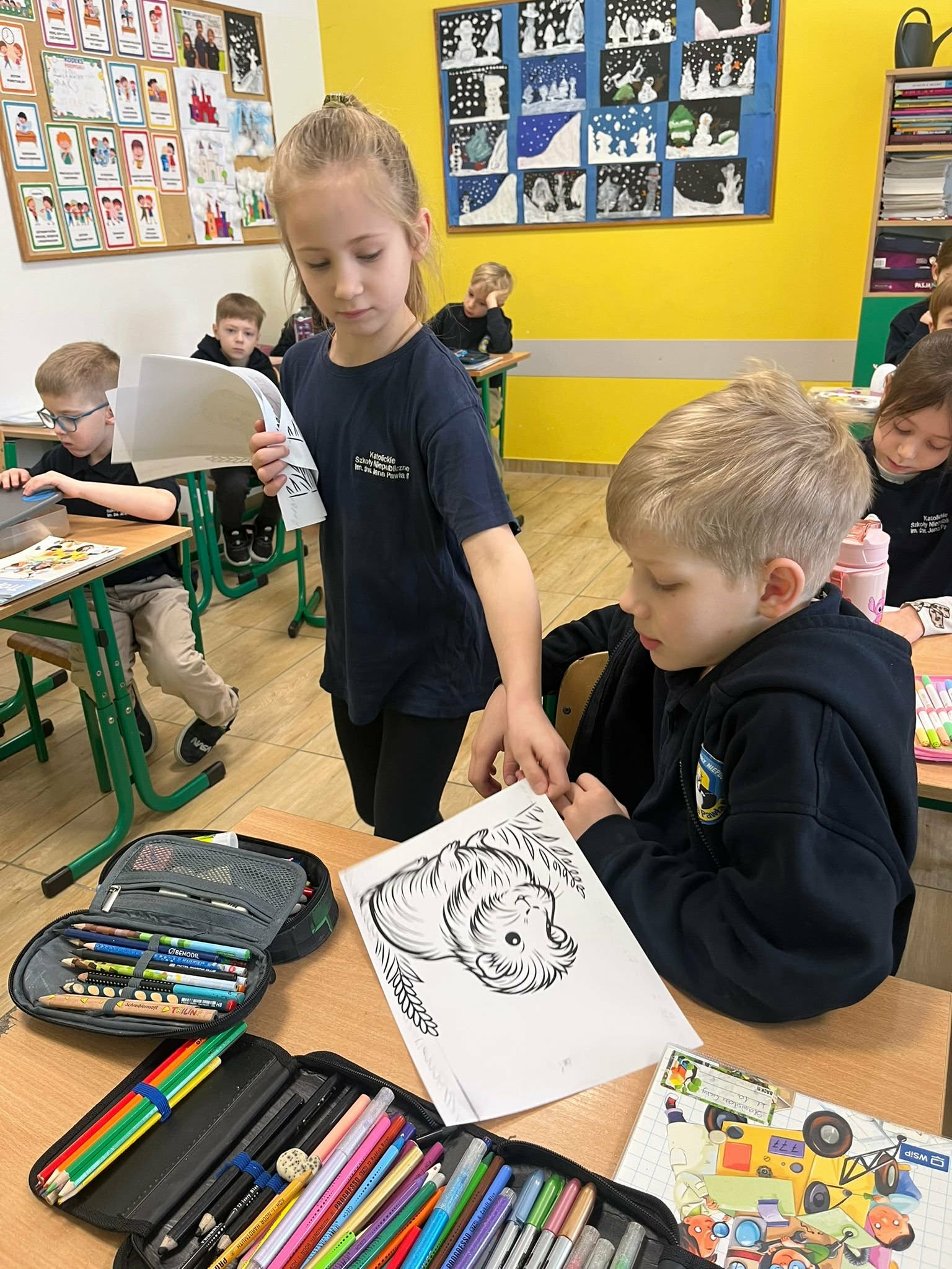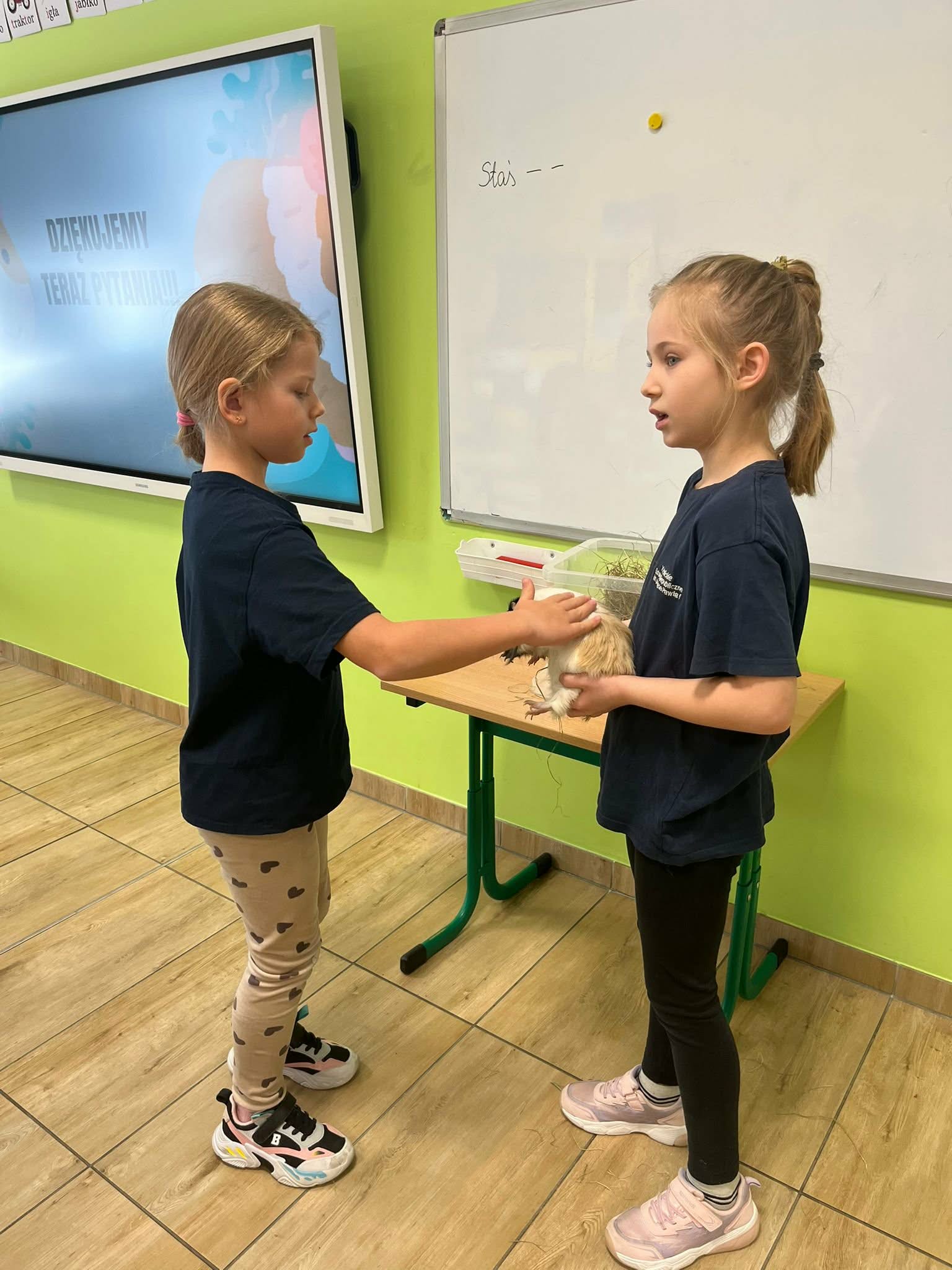 Dziś w klasie 1a odbyła się wyjątkowa lekcja! Nasza uczennica, Zosia, wcieliła się w rolę nauczycielki i poprowadziła zajęcia na temat świnek morskich. Zosia była doskonale przygotowana – zaprezentowała przygotowaną przez siebie prezentację, w której opowiedziała o życiu, zwyczajach oraz potrzebach świnek morskich. W niezwykle ciekawy sposób przedstawiła wiele interesujących informacji, a także z dużym zaangażowaniem odpowiadała na – wcale nie takie łatwe – pytania zadawane przez kolegów i koleżanki z klasy. Największą atrakcją były jednak wyjątkowe goście – dwie świnki morskie należące do Zosi: Lila i Lawa. To mama i córka, które wzbudziły ogromne zainteresowanie i sympatię całej klasy. Dzieci miały okazję nie tylko dowiedzieć się wielu ciekawostek, ale także pogłaskać zwierzątka pod czujnym okiem właścicielki. Na zakończenie uczniowie otrzymali kolorowanki ze świnkami morskimi, które z radością wypełniali barwami. To była wspaniała lekcja pełna wiedzy, uśmiechu i pozytywnych emocji. Gratulujemy Zosi odwagi, zaangażowania i świetnego przygotowania zajęć!