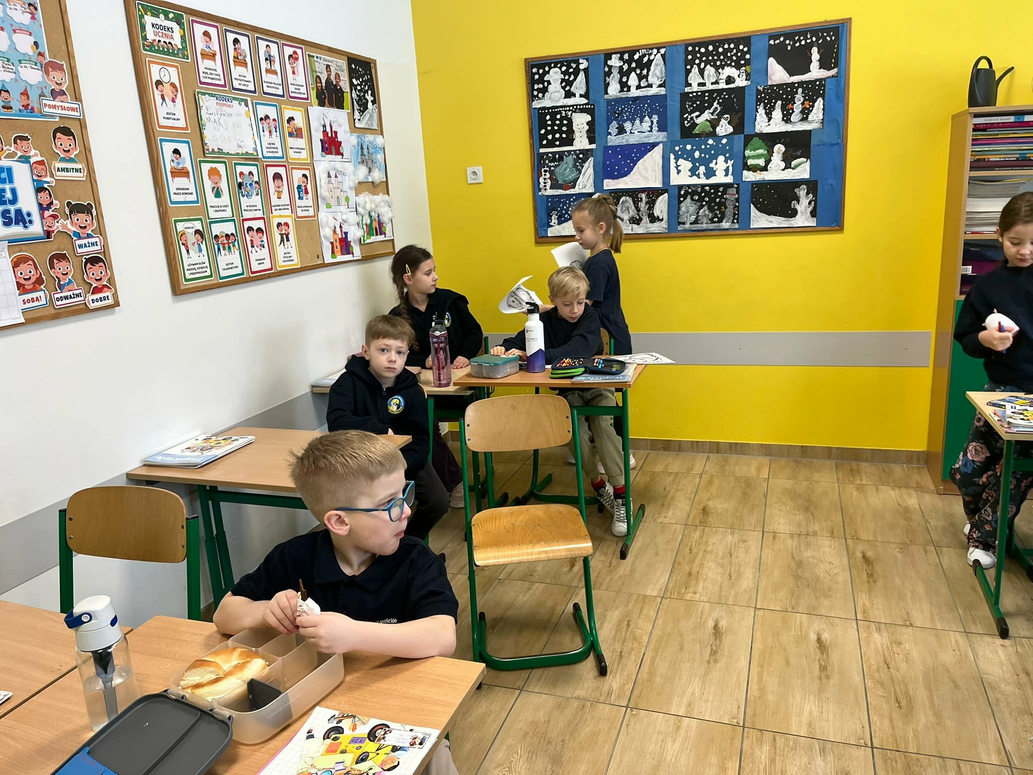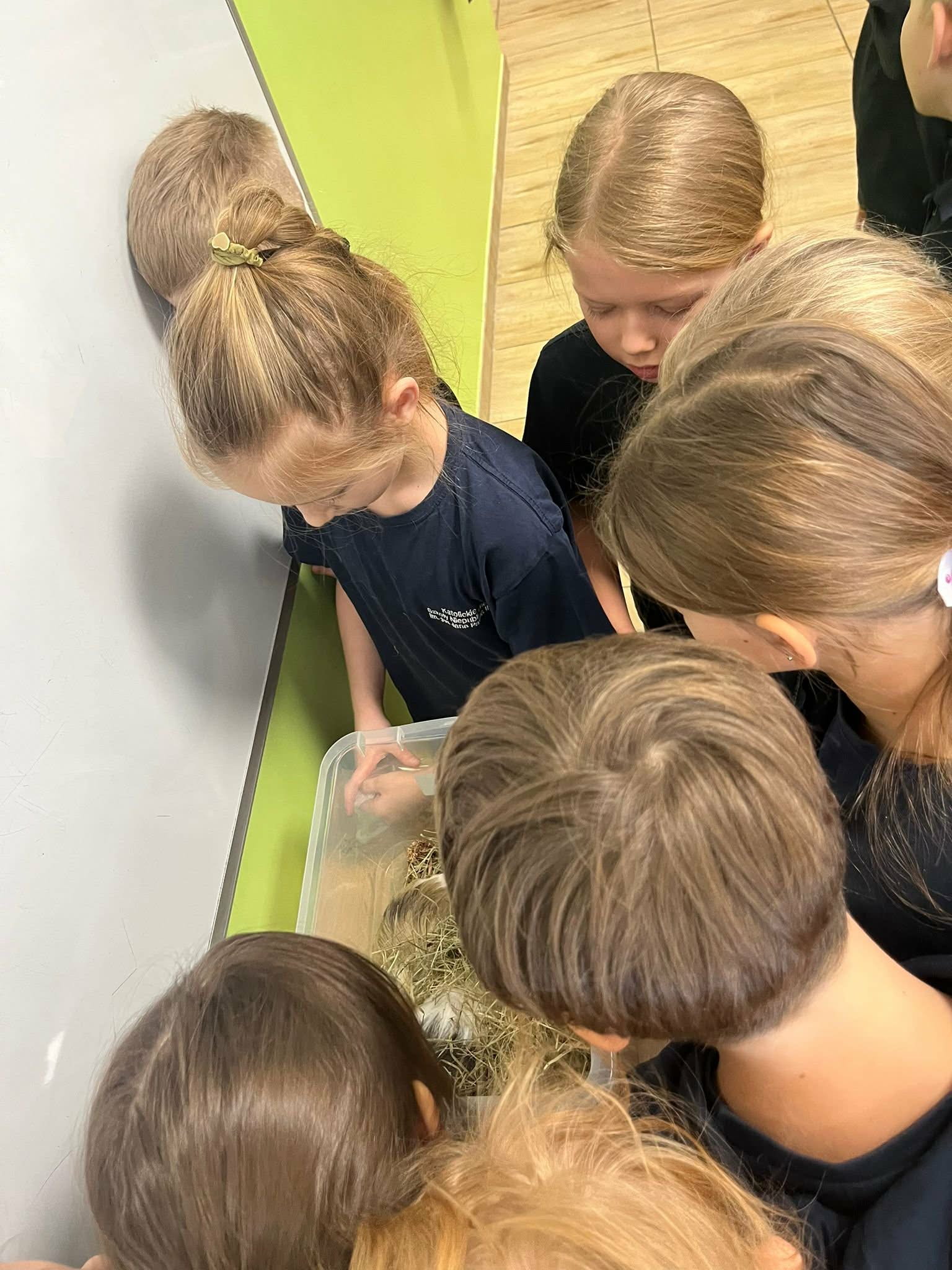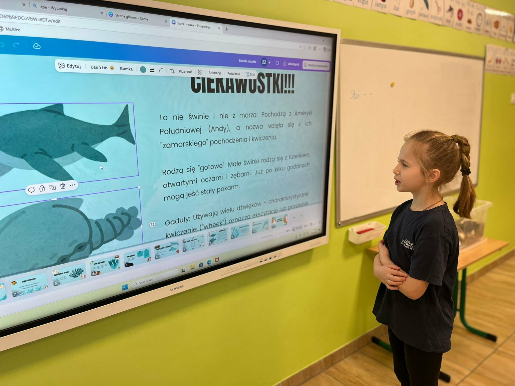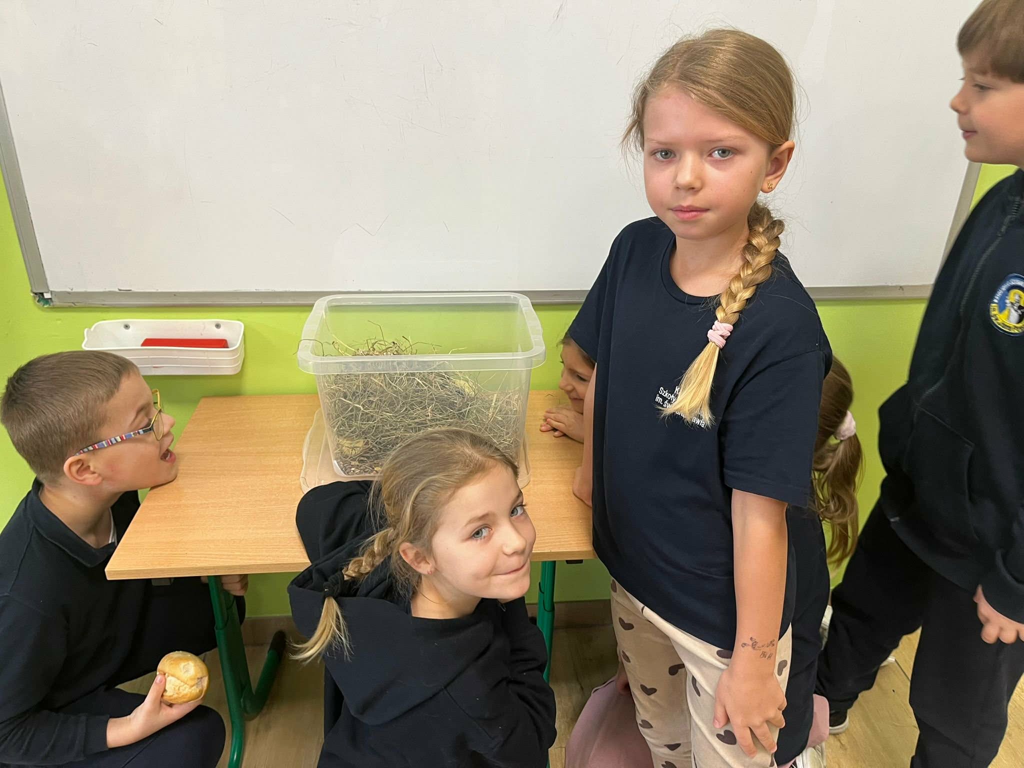 Dziś w klasie 1a odbyła się wyjątkowa lekcja! Nasza uczennica, Zosia, wcieliła się w rolę nauczycielki i poprowadziła zajęcia na temat świnek morskich. Zosia była doskonale przygotowana – zaprezentowała przygotowaną przez siebie prezentację, w której opowiedziała o życiu, zwyczajach oraz potrzebach świnek morskich. W niezwykle ciekawy sposób przedstawiła wiele interesujących informacji, a także z dużym zaangażowaniem odpowiadała na – wcale nie takie łatwe – pytania zadawane przez kolegów i koleżanki z klasy. Największą atrakcją były jednak wyjątkowe goście – dwie świnki morskie należące do Zosi: Lila i Lawa. To mama i córka, które wzbudziły ogromne zainteresowanie i sympatię całej klasy. Dzieci miały okazję nie tylko dowiedzieć się wielu ciekawostek, ale także pogłaskać zwierzątka pod czujnym okiem właścicielki. Na zakończenie uczniowie otrzymali kolorowanki ze świnkami morskimi, które z radością wypełniali barwami. To była wspaniała lekcja pełna wiedzy, uśmiechu i pozytywnych emocji. Gratulujemy Zosi odwagi, zaangażowania i świetnego przygotowania zajęć!