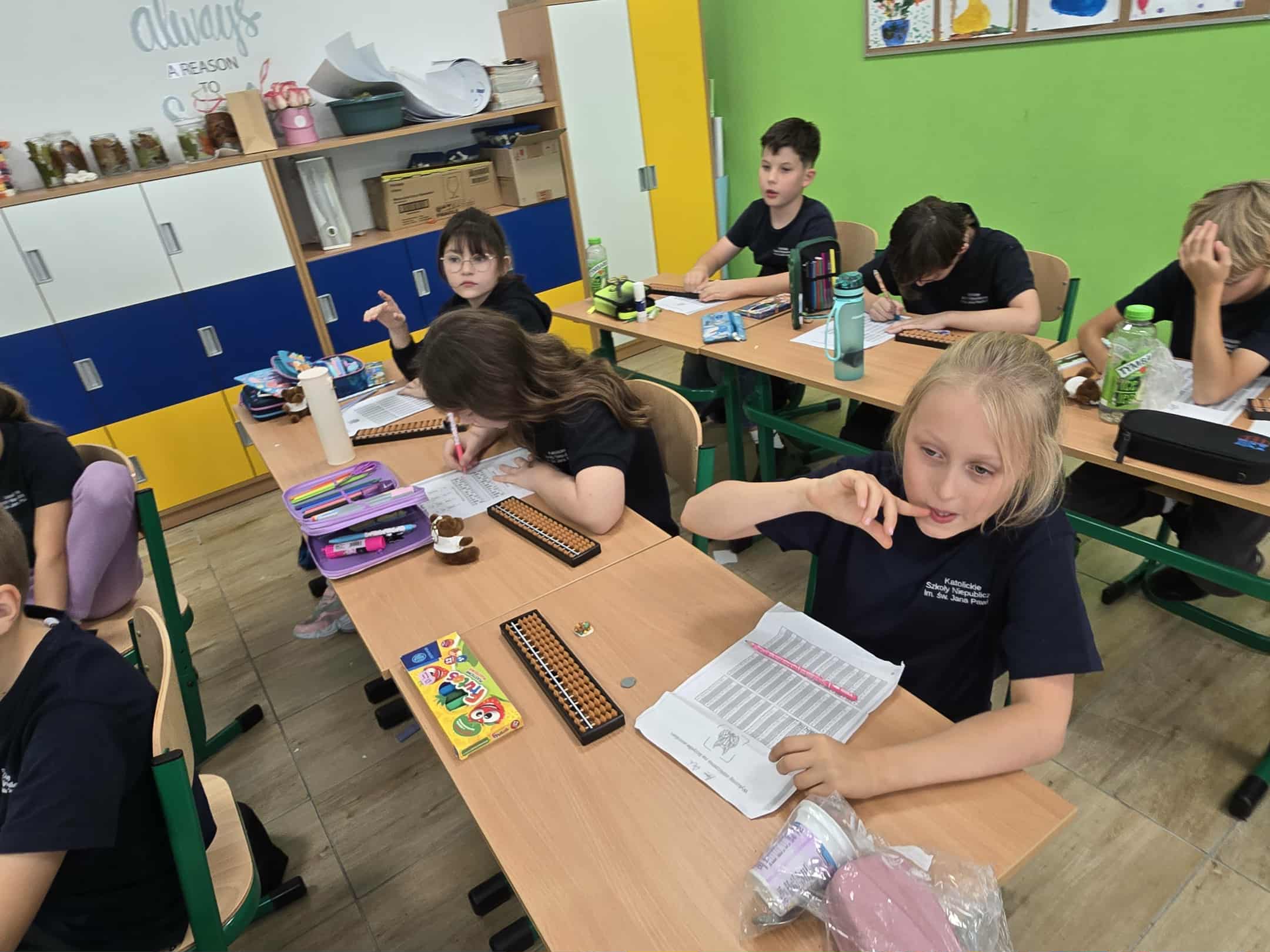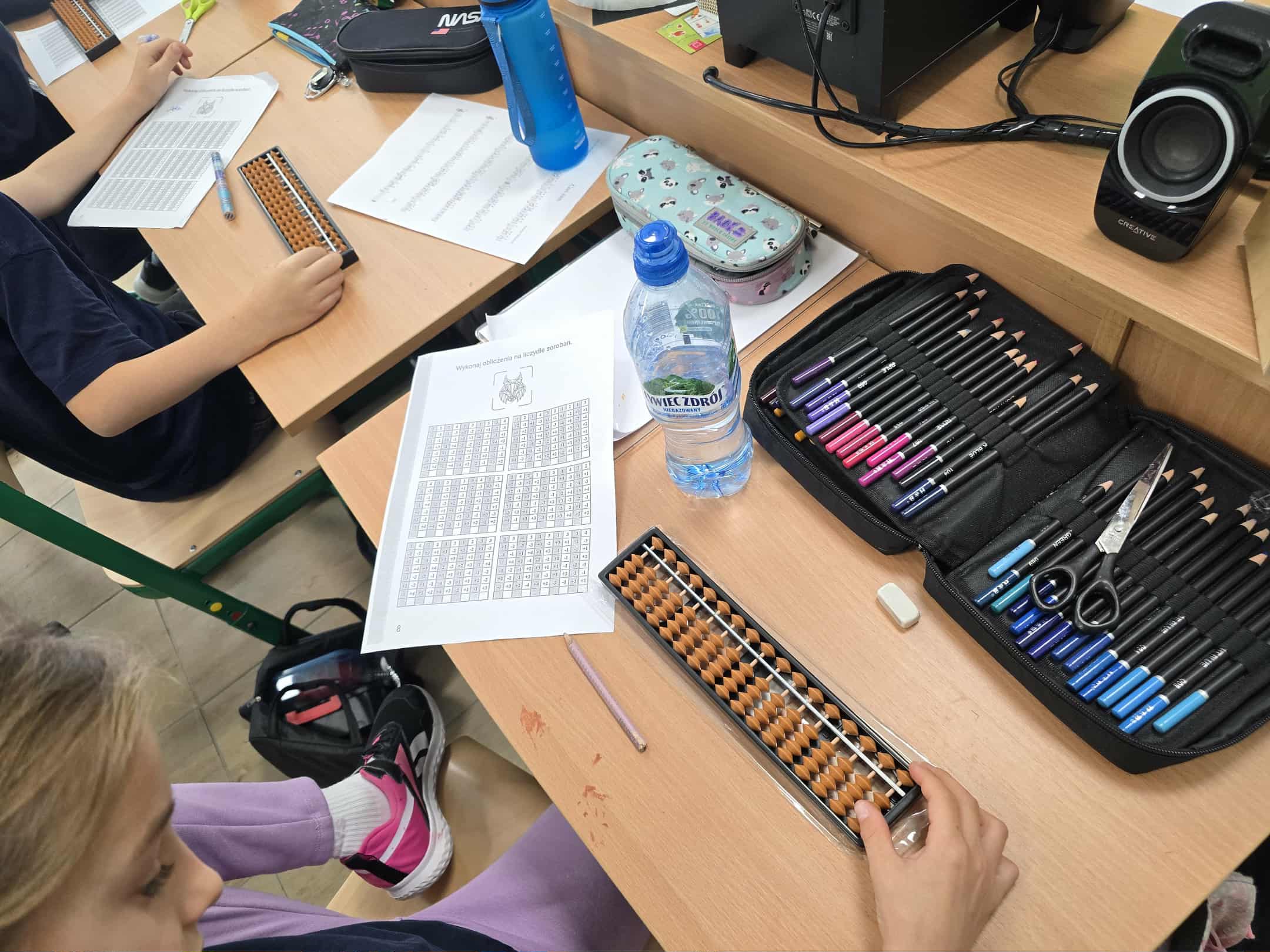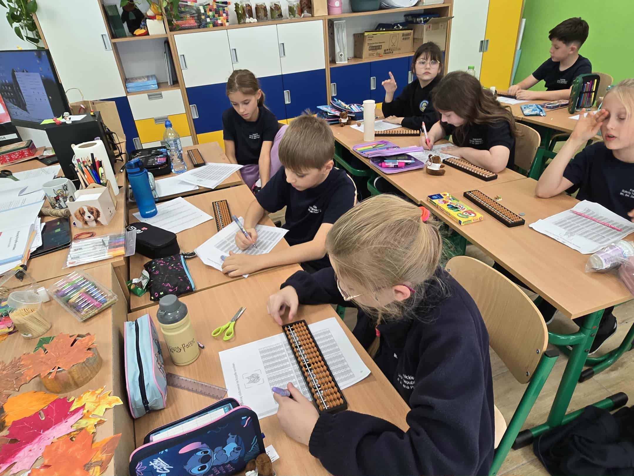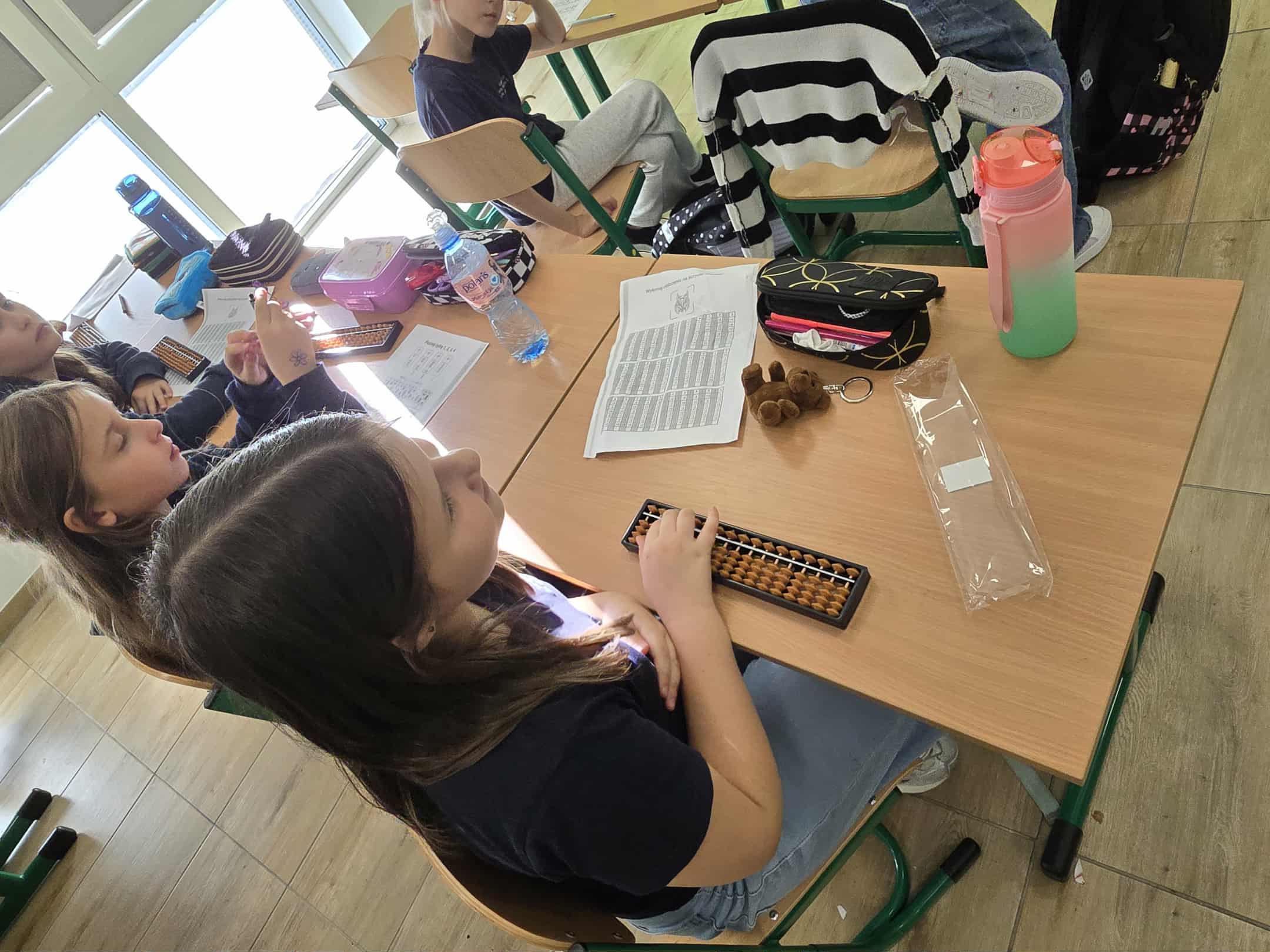 Podczas już kolejnych zajęć uczniowie z entuzjazmem uczyły się, jak przesuwać koraliki na sorobanie, aby liczyć, dodawać i odejmować proste przykłady, co sprawiło im ogromną frajdę i motywację do dalszej nauki.