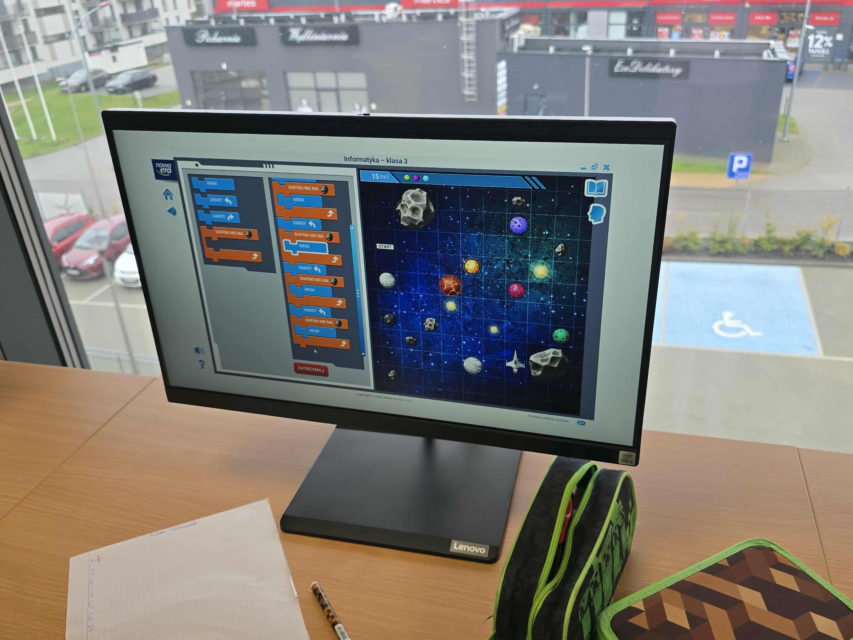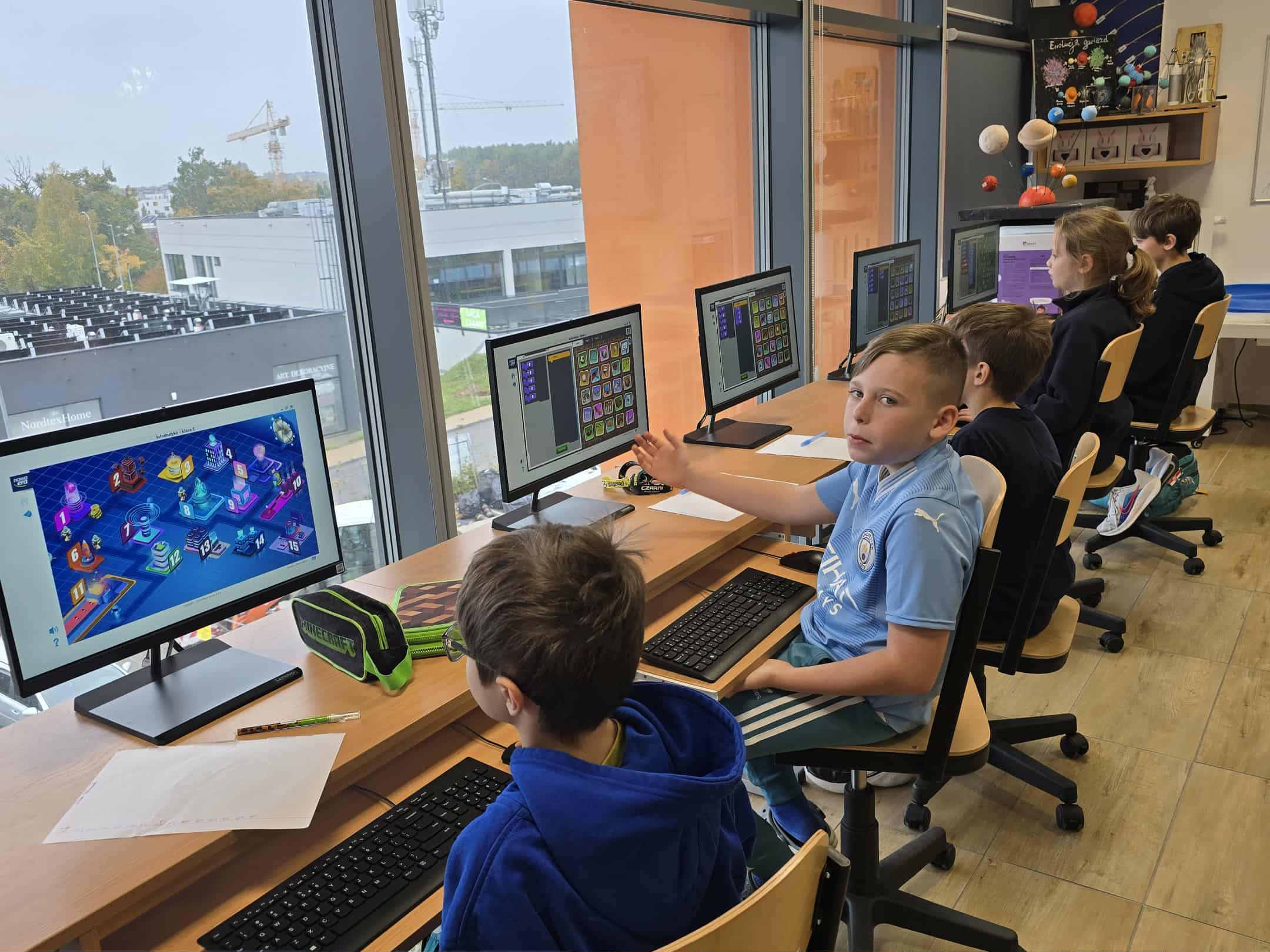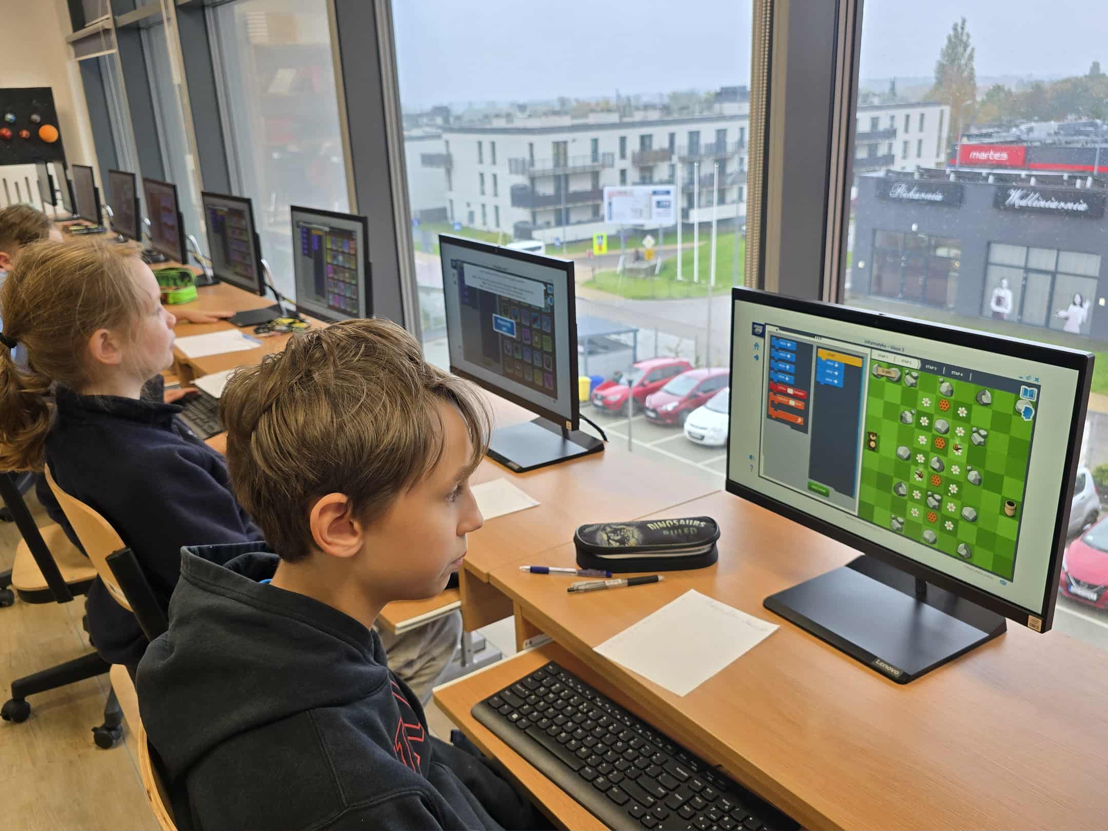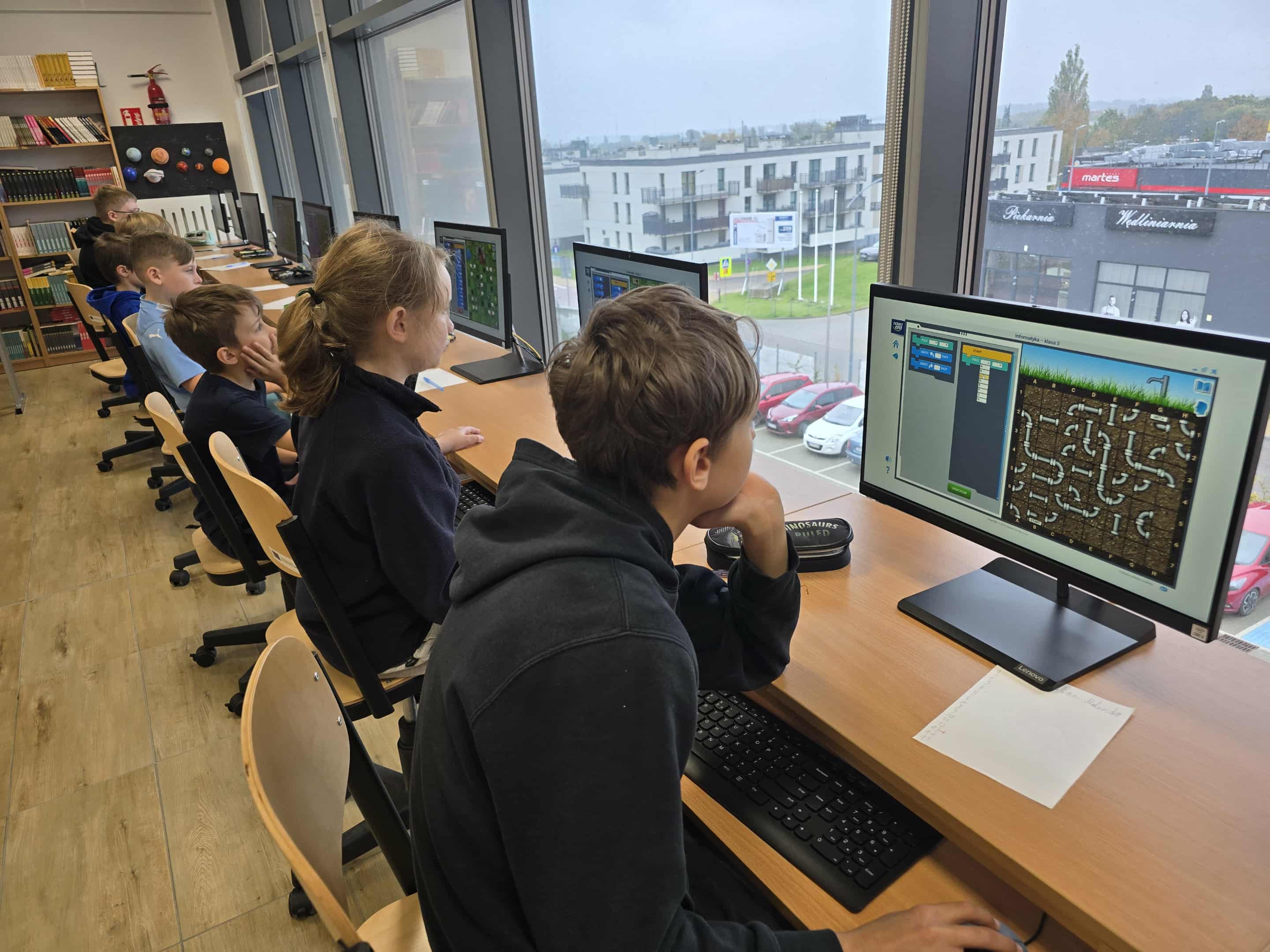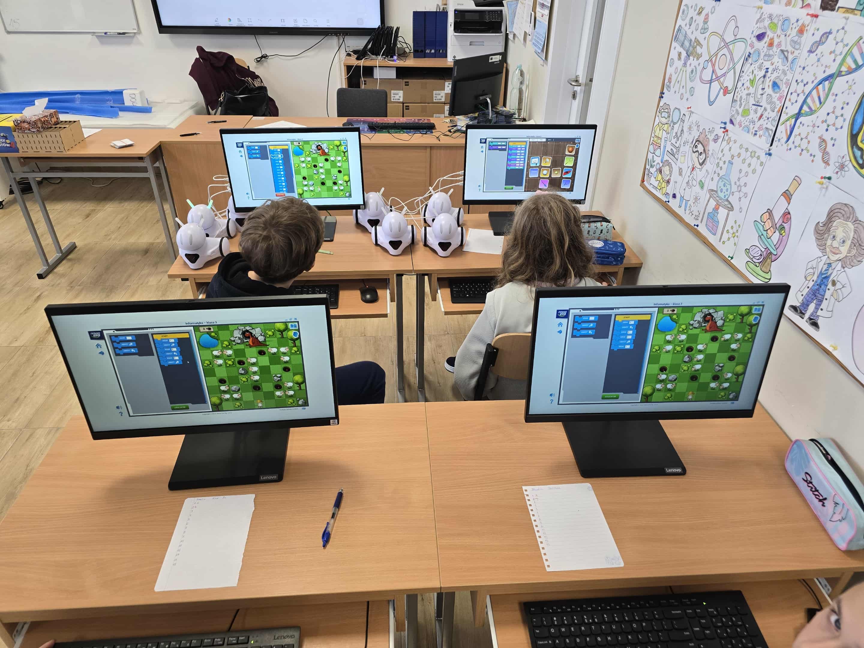 W naszej szkole uczniowie klasy 5 mieli okazję uczestniczyć w nowoczesnych zajęciach z informatyki, które łączyły naukę z dobrą zabawą. Podczas lekcji uczniowie poznawali podstawy programowania korzystając z metod kodowania blokowego, co pozwala im rozwijać umiejętności logicznego myślenia i rozwiązywania problemów.