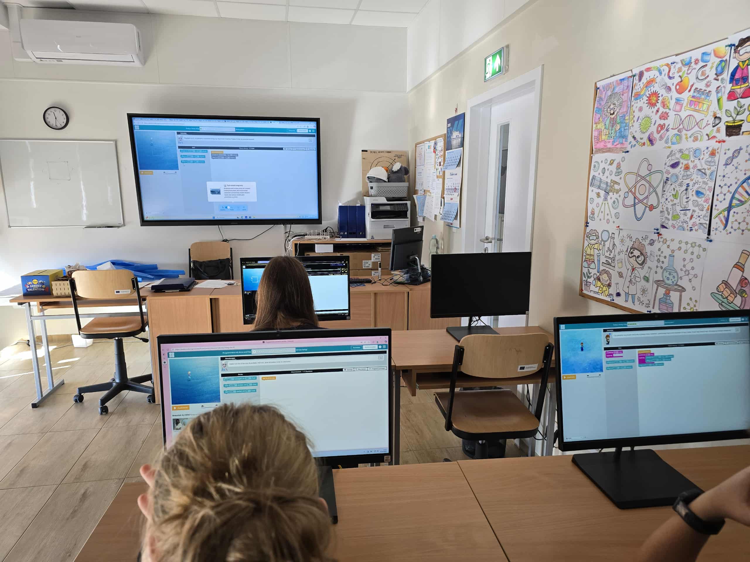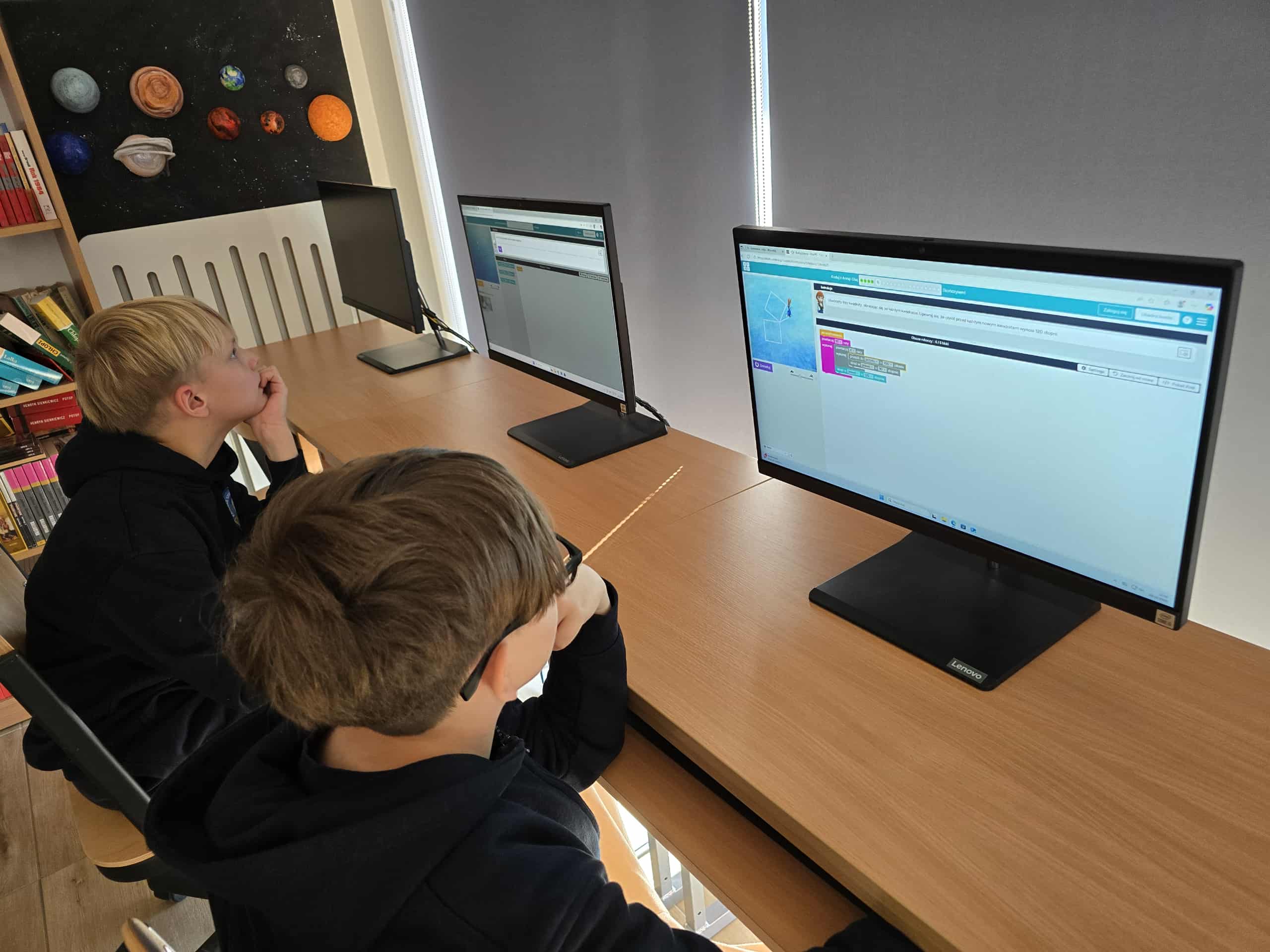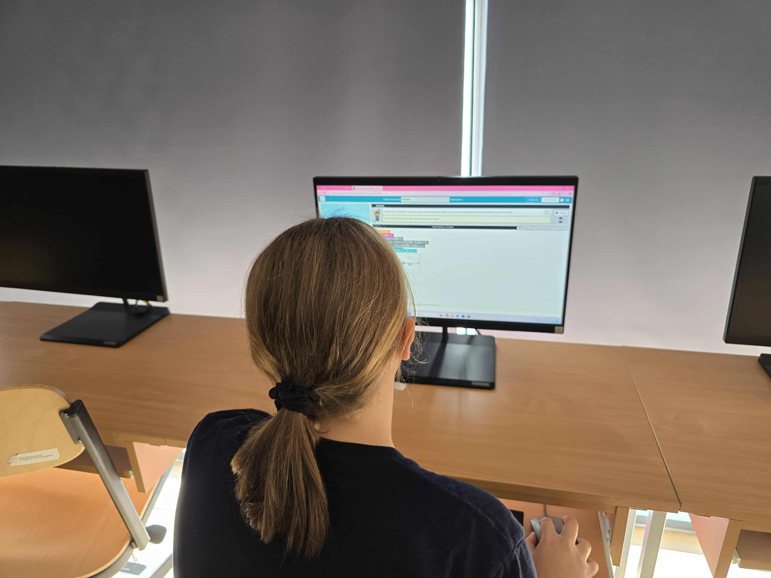 Podczas lekcji informatyki dzieci z entuzjazmem tworzyły własne projekty, korzystając z interaktywnego środowiska programowania opartego na blokach, które przypominały układanie puzzli. Uczniowie mieli okazję nauczyć się podstaw logiki programowania, takich jak pętle, warunki i sterowanie postaciami, a wszystko to w przyjaznej i kreatywnej atmosferze.