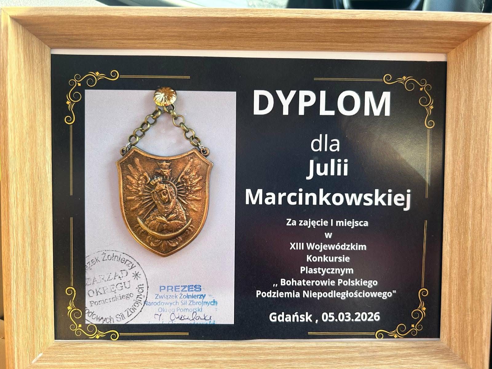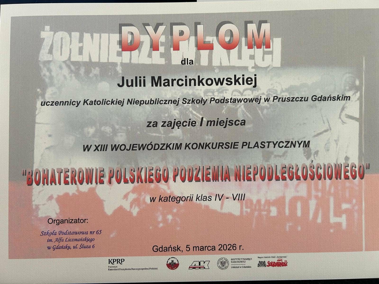 Dziś odbyło się uroczyste wręczenie dyplomów i nagród w XIII Wojewódzkim Konkursie Plastycznym „Bohaterowie Polskiego Podziemia Niepodległościowego”. W wydarzeniu wzięła udział nasza uczennica – Julia z klasy 8, która zdobyła I miejsce w tym prestiżowym konkursie.