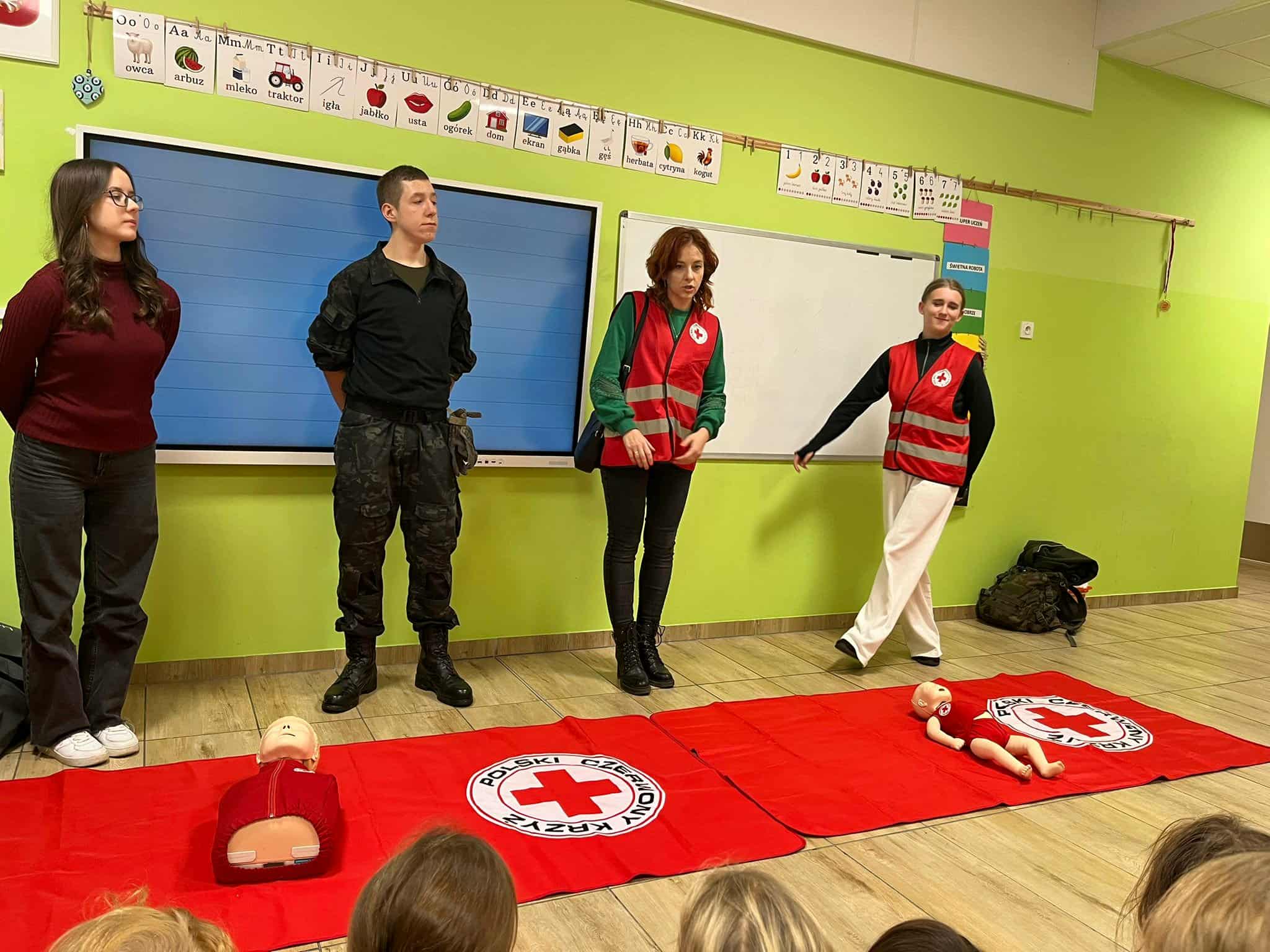 Dziś klasy 0–3 odwiedziła pani Ewa Kubicka-Topka, psycholog z Zespołu Szkół Ogrodniczych i Ogólnokształcących w Pruszczu Gdańskim, wraz z uczniami ze szkolnego koła PCK. Goście przeprowadzili dla naszych najmłodszych bardzo ciekawe warsztaty z udzielania pierwszej pomocy.