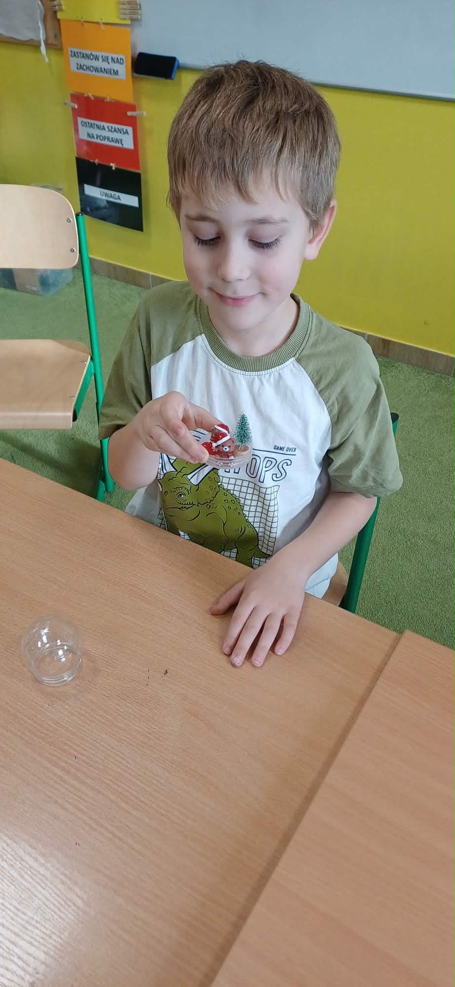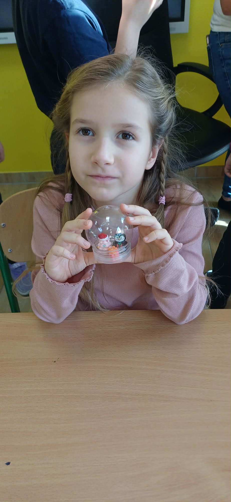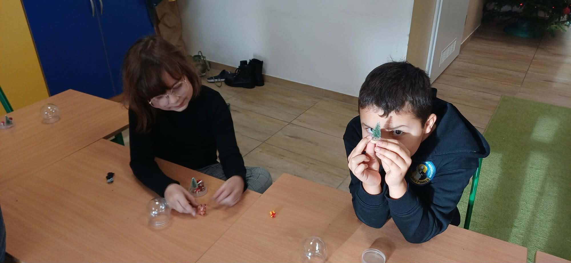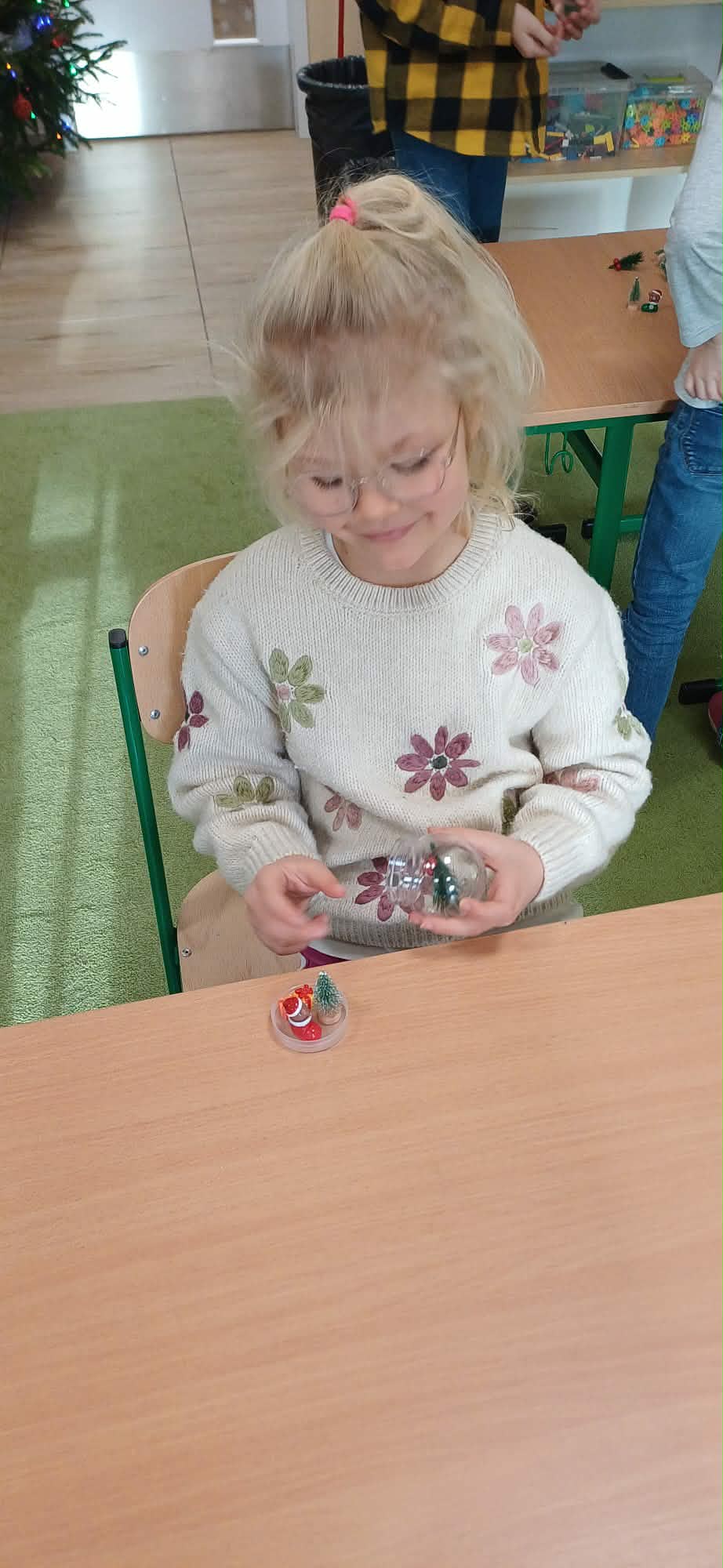 Zabawa była fantastyczna, a uśmiechy nie schodziły z twarzy dzieci. Warsztaty okazały się również wspaniałą lekcją kreatywności. Każdy uczeń mógł wykazać się pomysłowością, wybierając dekoracje, które miały ozdobić jego magiczną kulę. Do specjalnie przygotowanych pojemników trafiały kolorowe figurki, błyszczące gwiazdki i inne urocze dodatki.