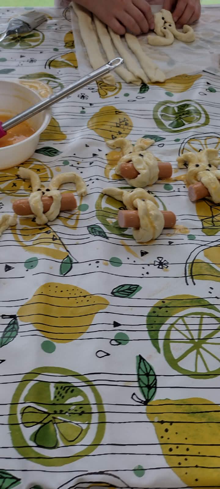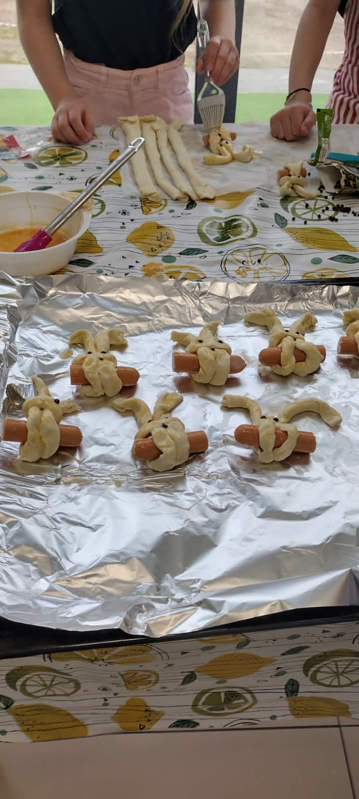 Podczas warsztatów uczniowie samodzielnie wałkowali ciasto francuskie, kroili parówki i formowali z nich urocze króliczki. Każdy mógł ozdobić swojego króliczka, dodając oczka, uszka czy ogonki z ciasta, dzięki czemu powstały wyjątkowe i niepowtarzalne smakołyki. Kreatywność uczniów sprawiła, że każdy króliczek był inny i pełen charakteru.
