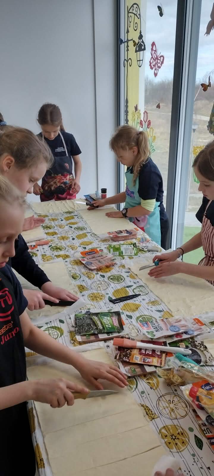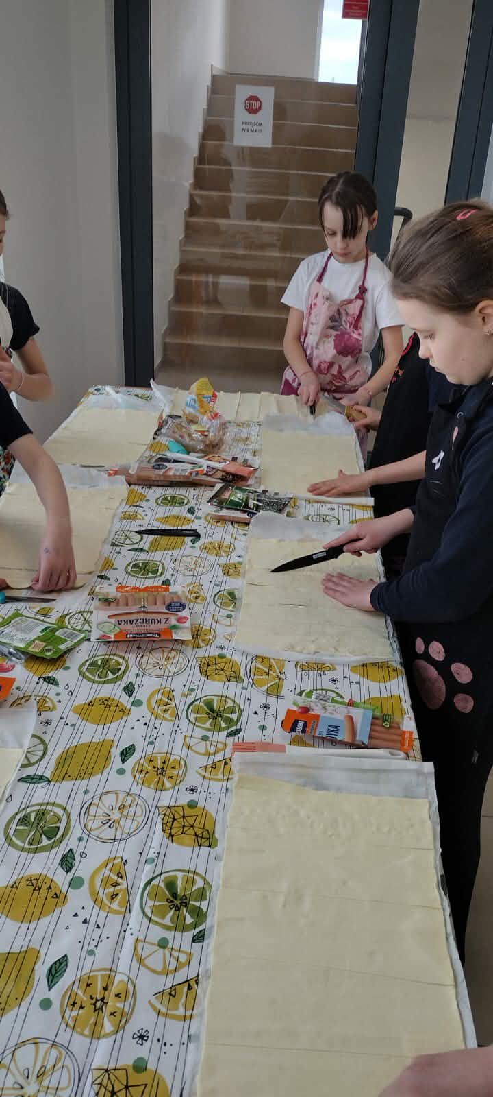 Warsztaty były okazją do wspólnej pracy i wymiany pomysłów. Uczniowie pomagali sobie nawzajem w formowaniu ciasta, podpowiadali techniki krojenia i dekorowania, a wspólny śmiech i zaangażowanie sprawiły, że czas spędzony w kuchni był pełen radości.