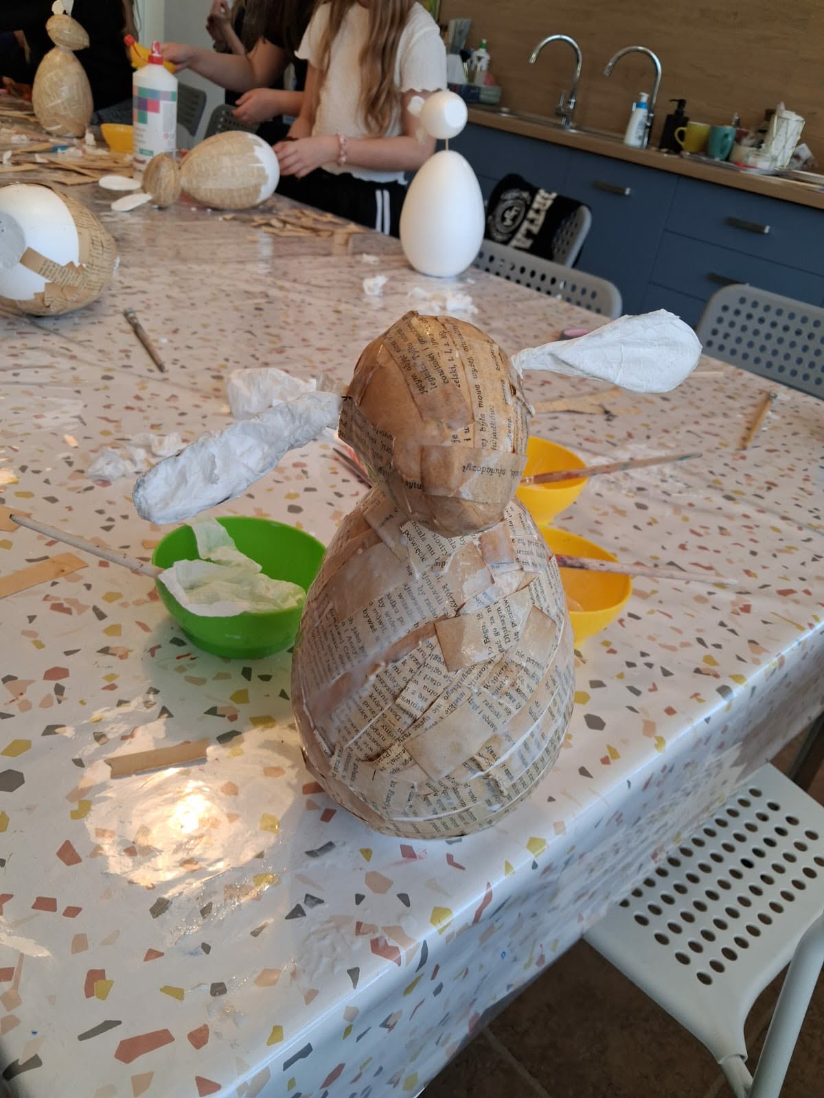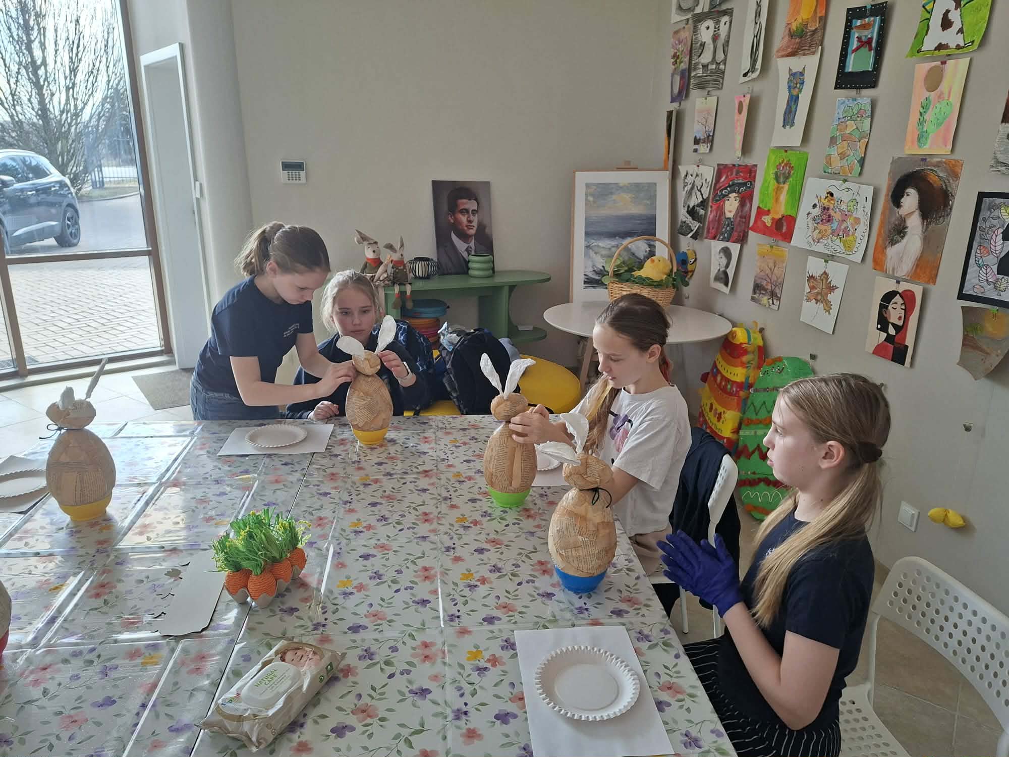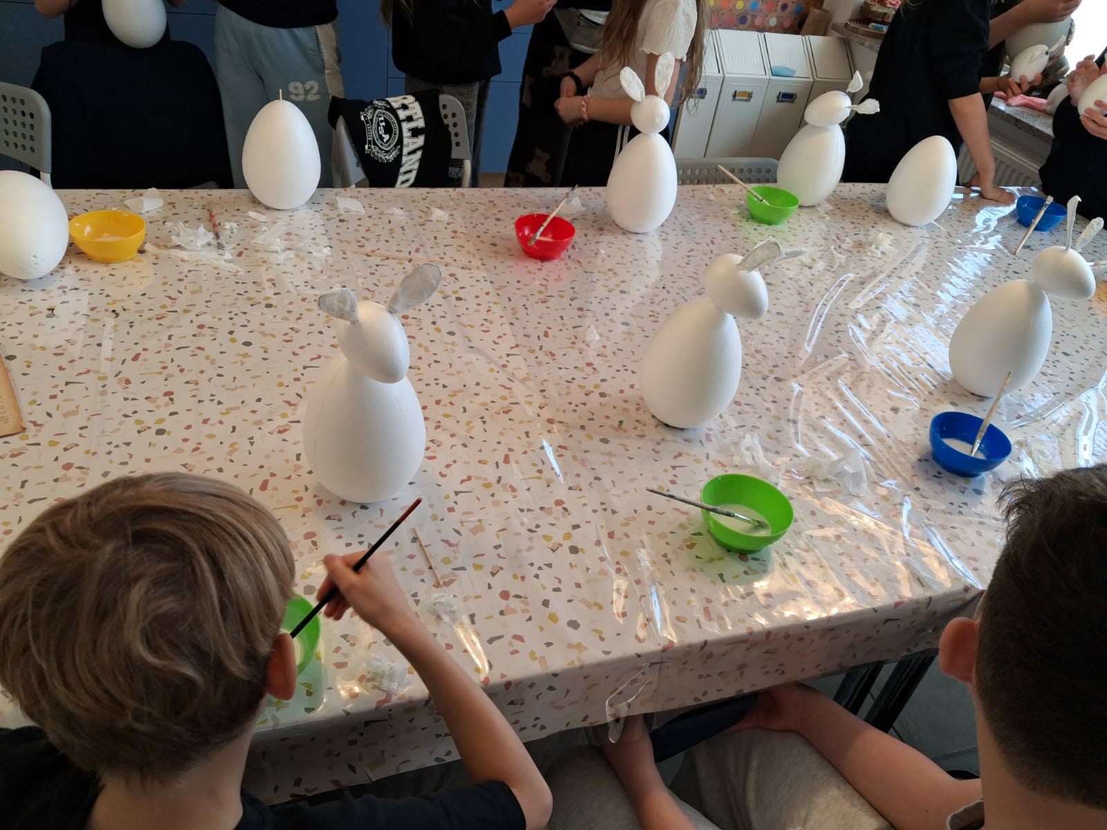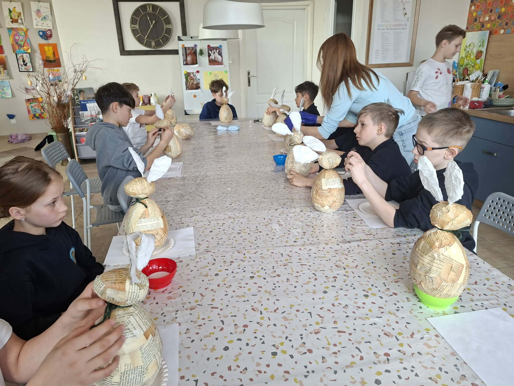 Po chwili relaksu przyszedł czas na część warsztatową. Dzieci z ogromnym zaangażowaniem przystąpiły do tworzenia wielkanocnych zajączków.