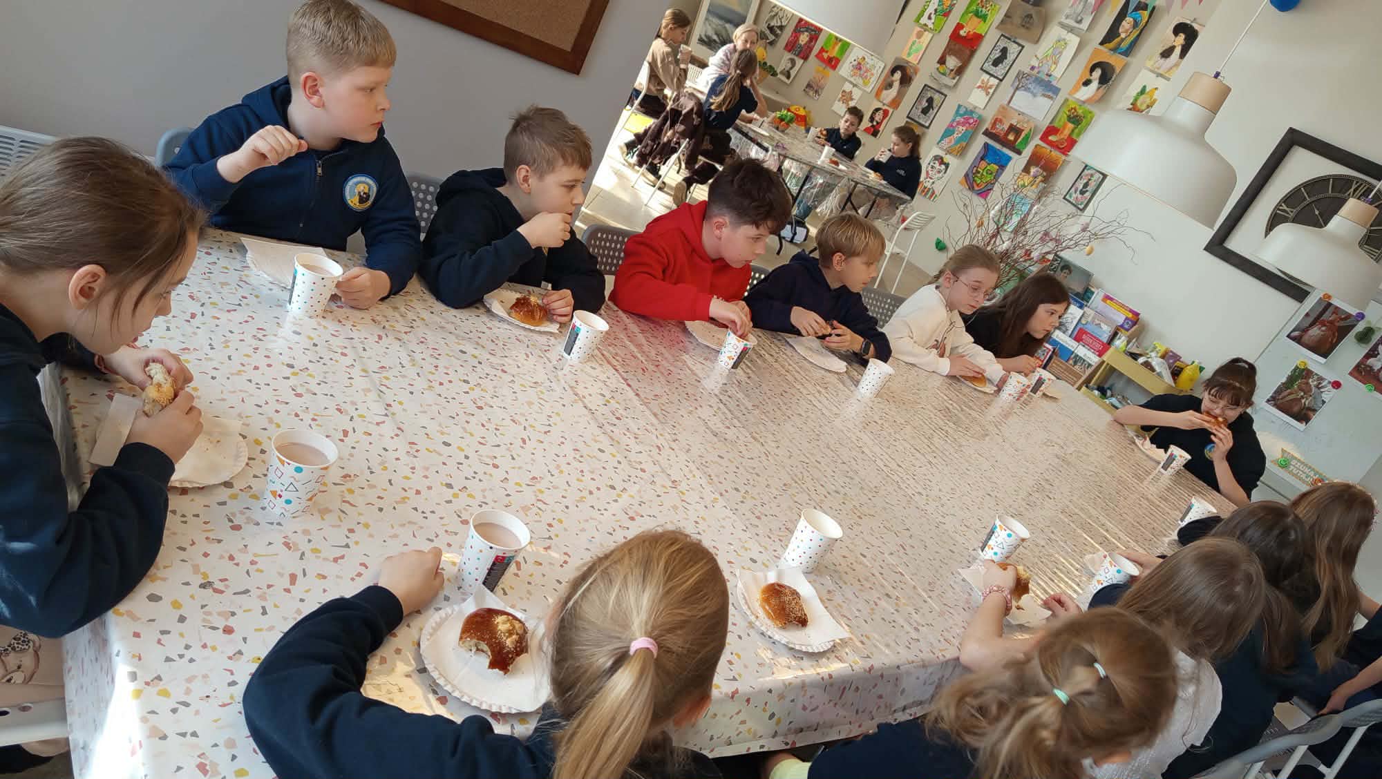 Na początku spotkania na uczniów czekało bardzo miłe przyjęcie. Zostali ugoszczeni pysznym, słodkim poczęstunkiem oraz ciepłym kakao, które wprowadziło wszystkich w przyjemny i rodzinny nastrój.