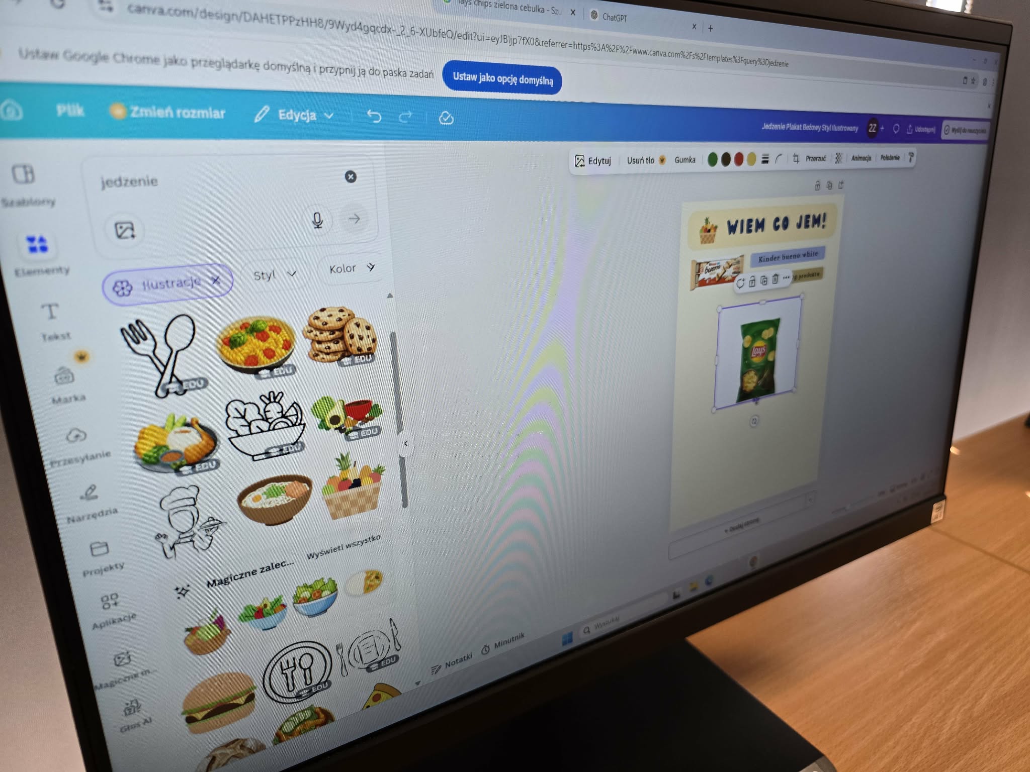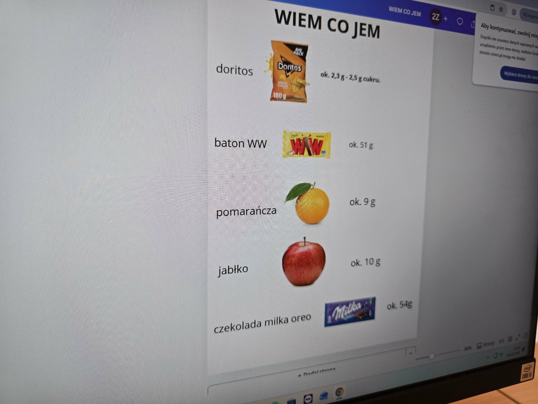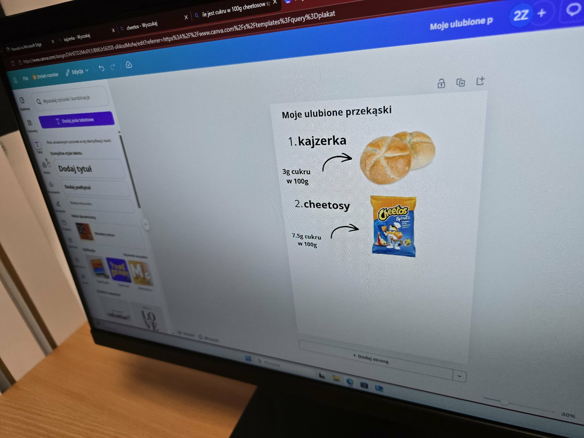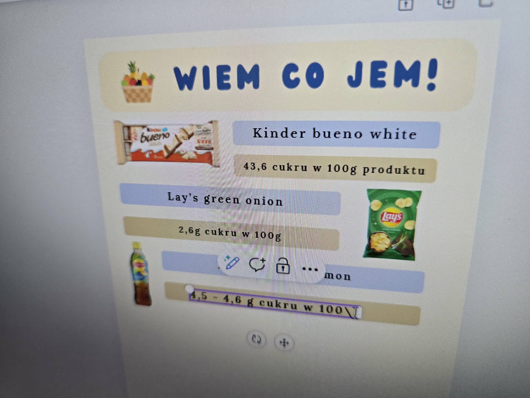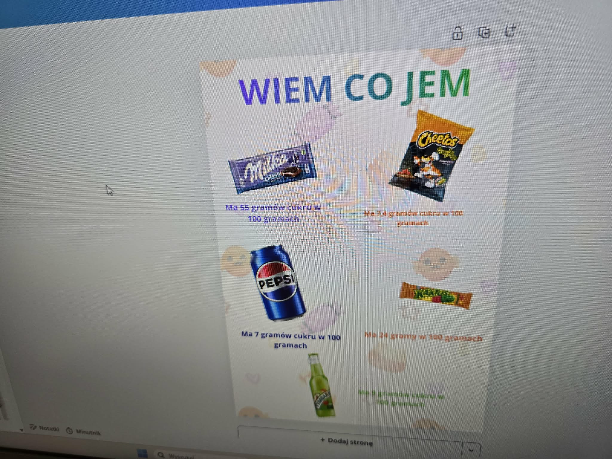 Zadanie polegało na sprawdzeniu i przedstawieniu, ile cukru znajduje się w popularnych przekąskach i napojach, po które często sięgają dzieci. Uczniowie analizowali etykiety produktów, wyszukiwali informacje i porównywali zawartość cukru w różnych artykułach spożywczych. Następnie w programach komputerowych tworzyli plakaty, na których w czytelny i ciekawy sposób prezentowali wyniki swoich obserwacji.