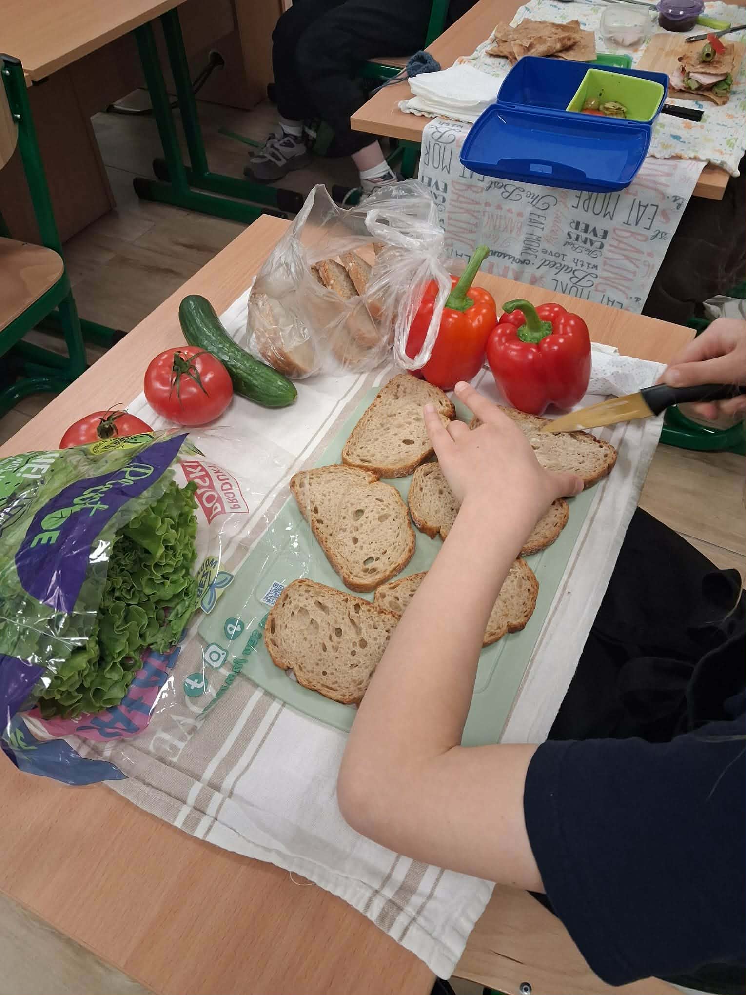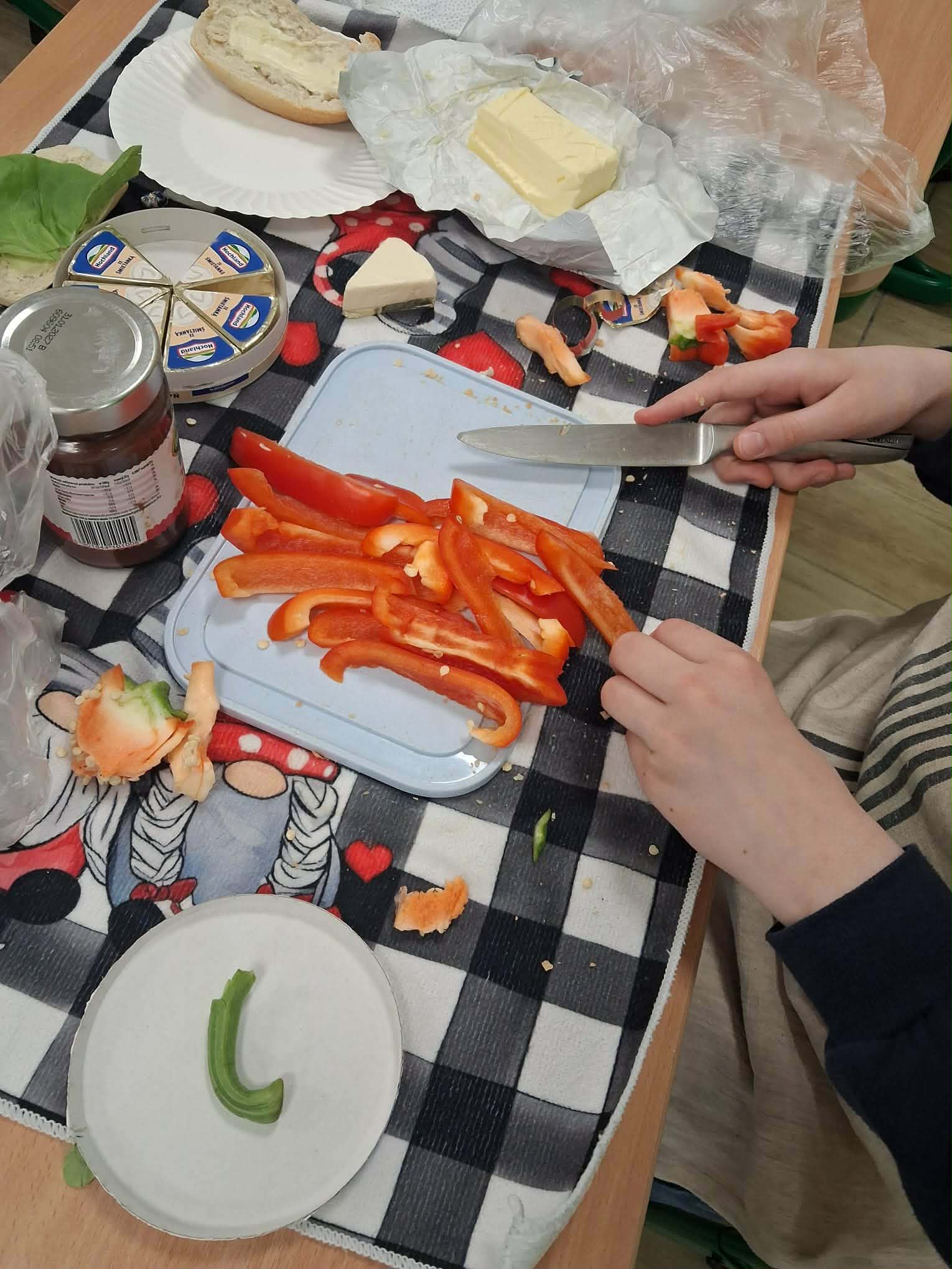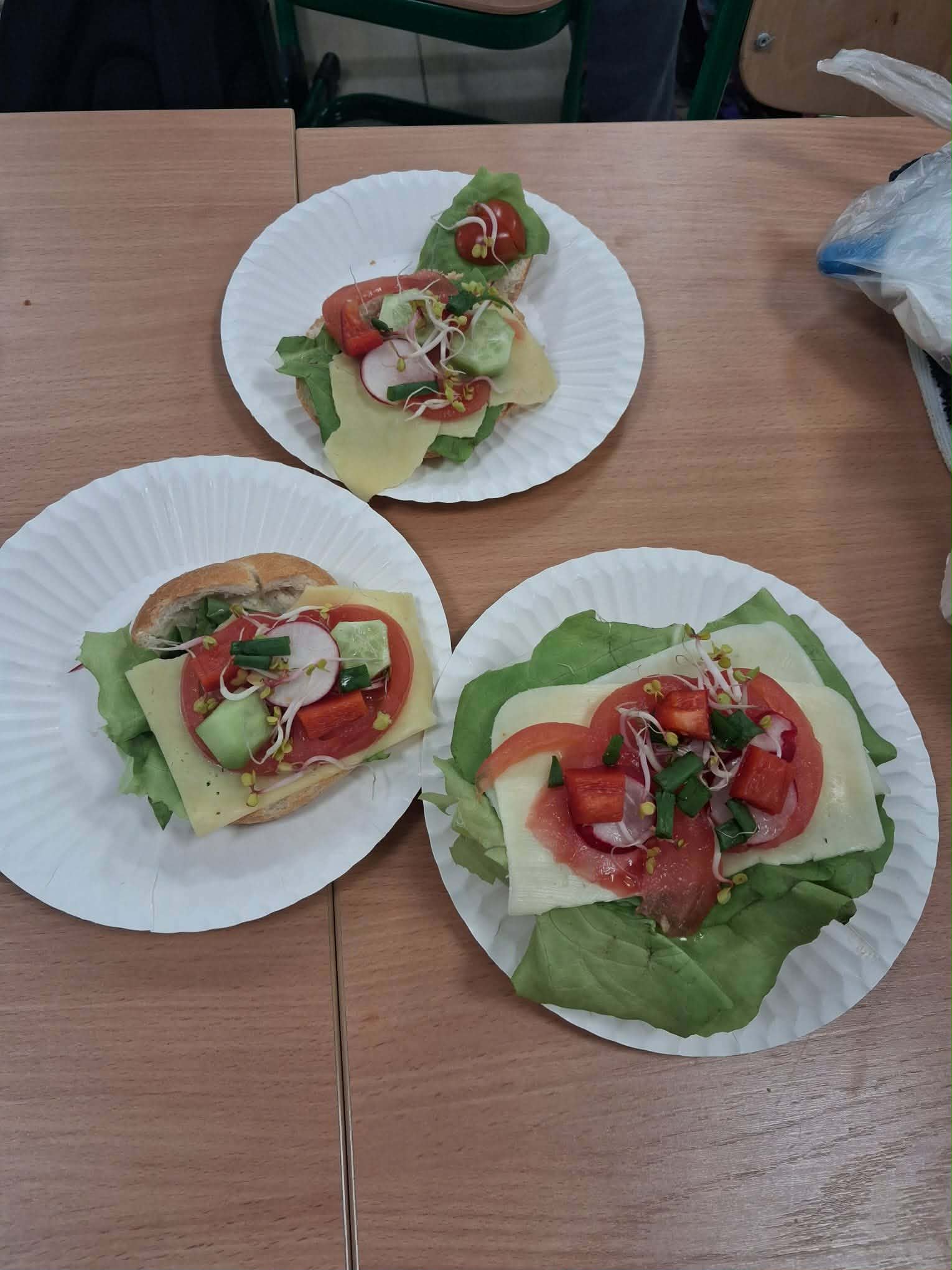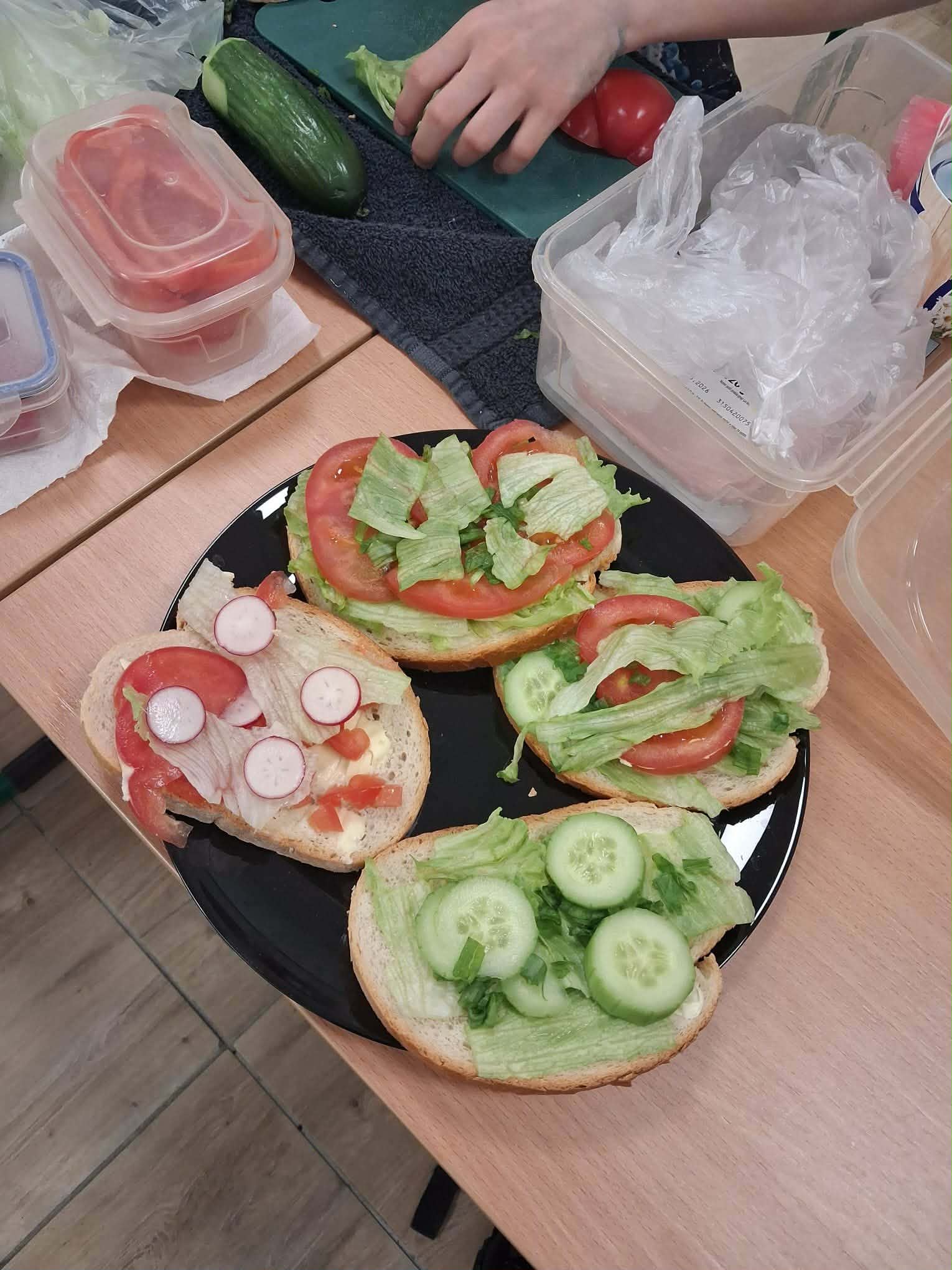 Najbardziej wyczekiwaną częścią zajęć było samodzielne przygotowanie wiosennych kanapek. Uczniowie wykorzystywali przyniesione produkty, dbając o ich estetyczne i zdrowe komponowanie. Praca przebiegała w miłej atmosferze, a efekty były nie tylko smaczne, ale i kolorowe.