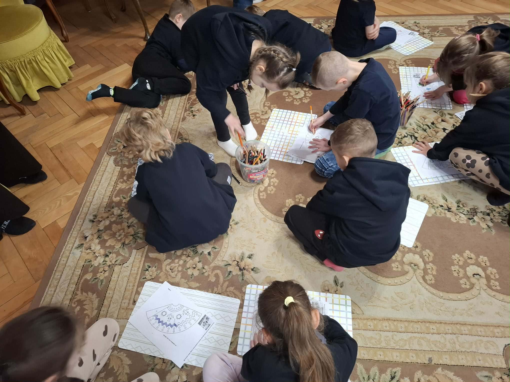 Po części teatralnej przyszedł czas na kreatywną zabawę. Dzieci, zainspirowane poznanymi historiami, przystąpiły do pracy plastycznej. Każdy uczestnik miał okazję stworzyć własne tepee. Praca ta sprawiła dzieciom wiele radości – z dużym zaangażowaniem kolorowały, wycinały i kleiły, wykazując się pomysłowością i wyobraźnią.