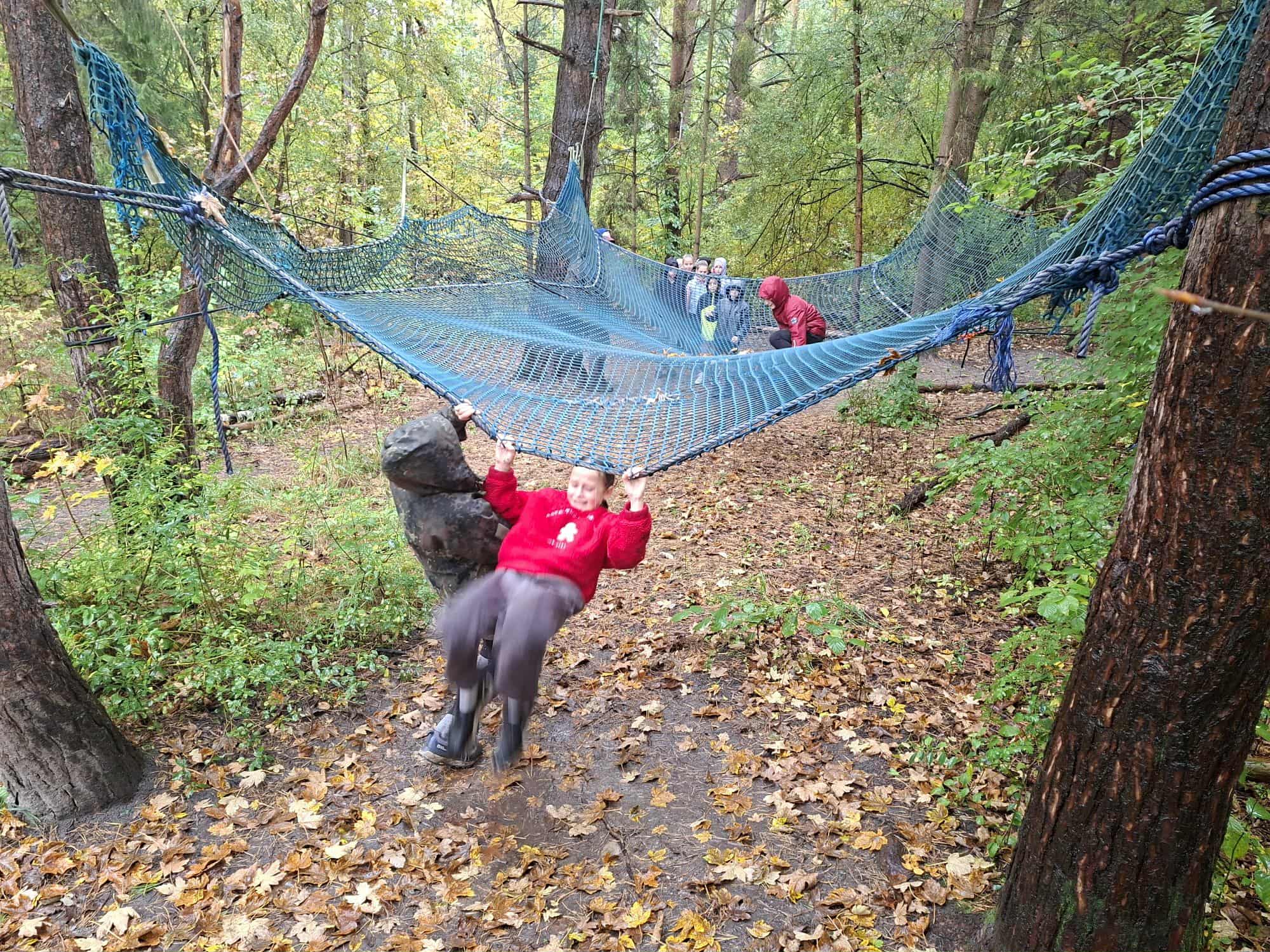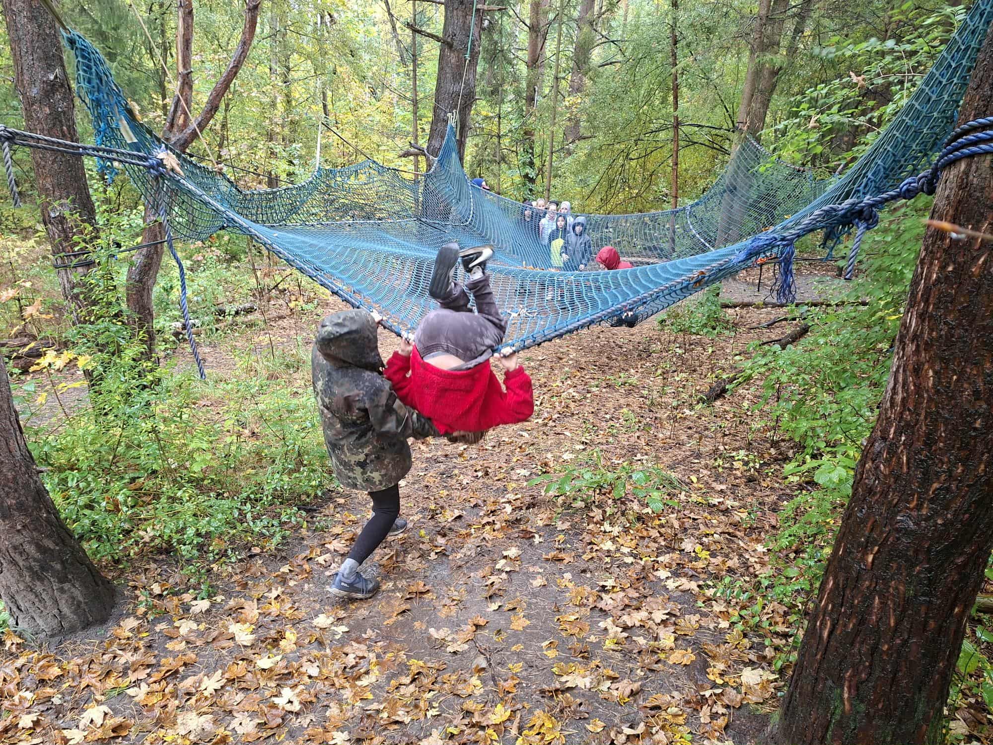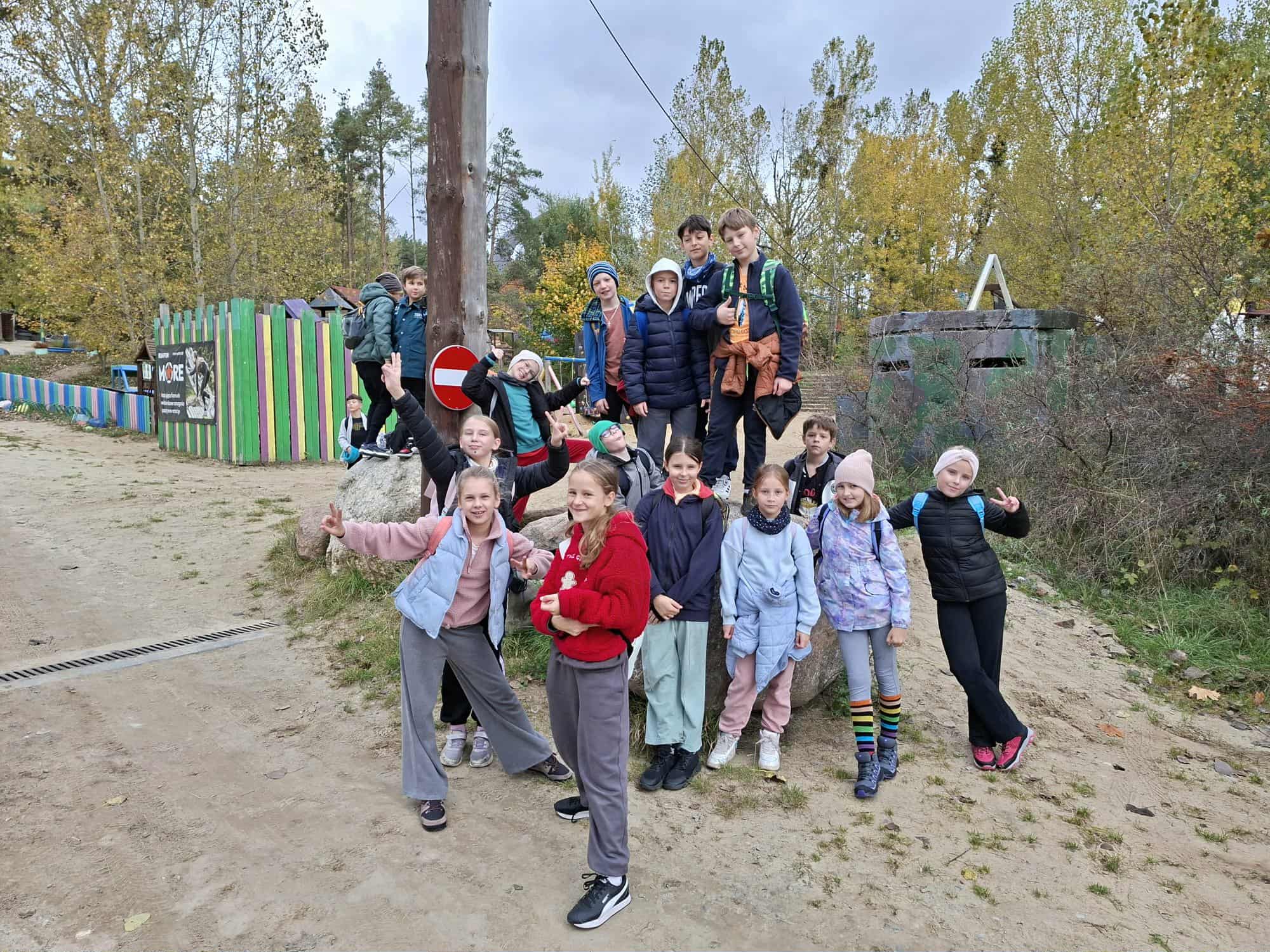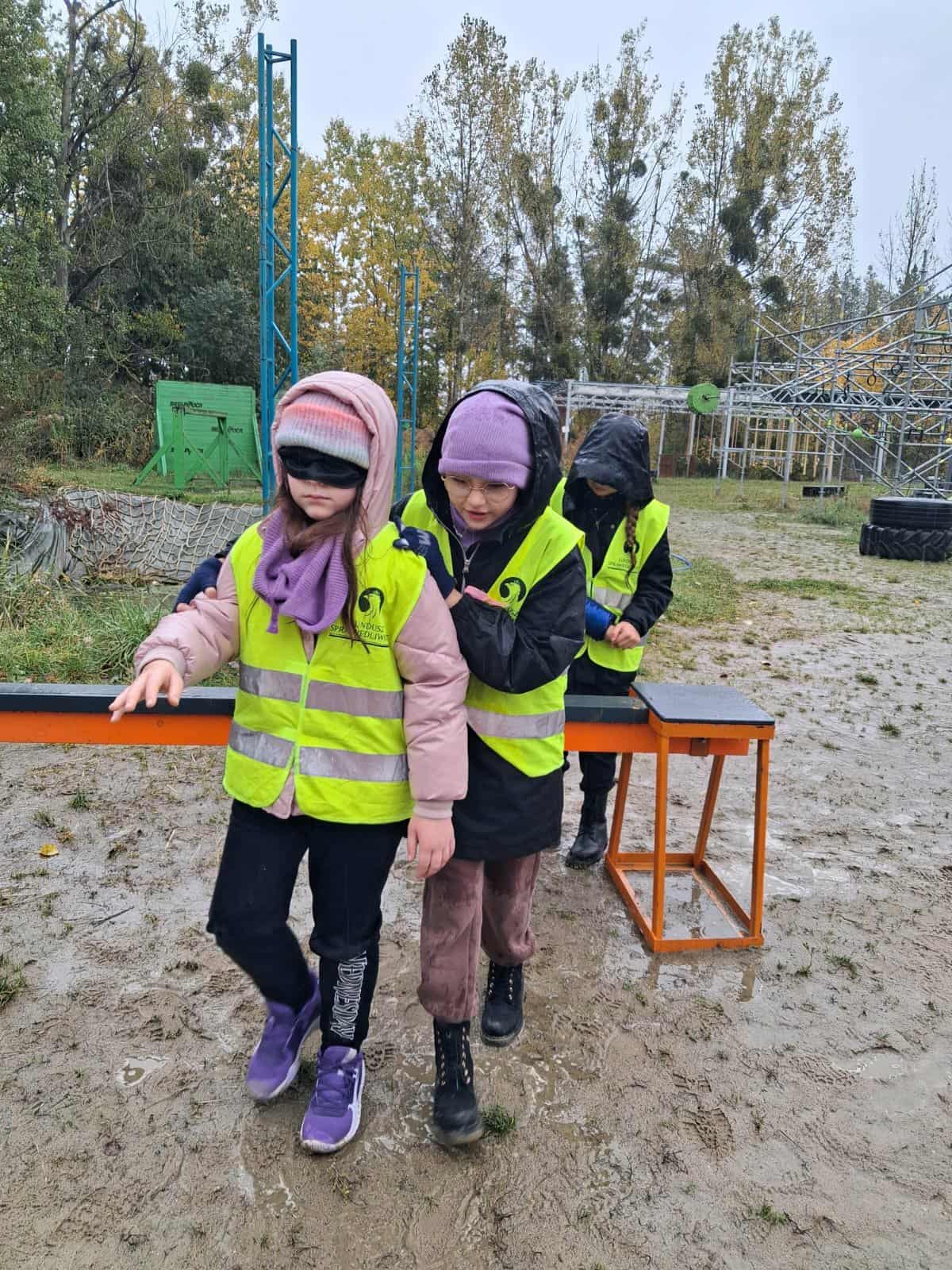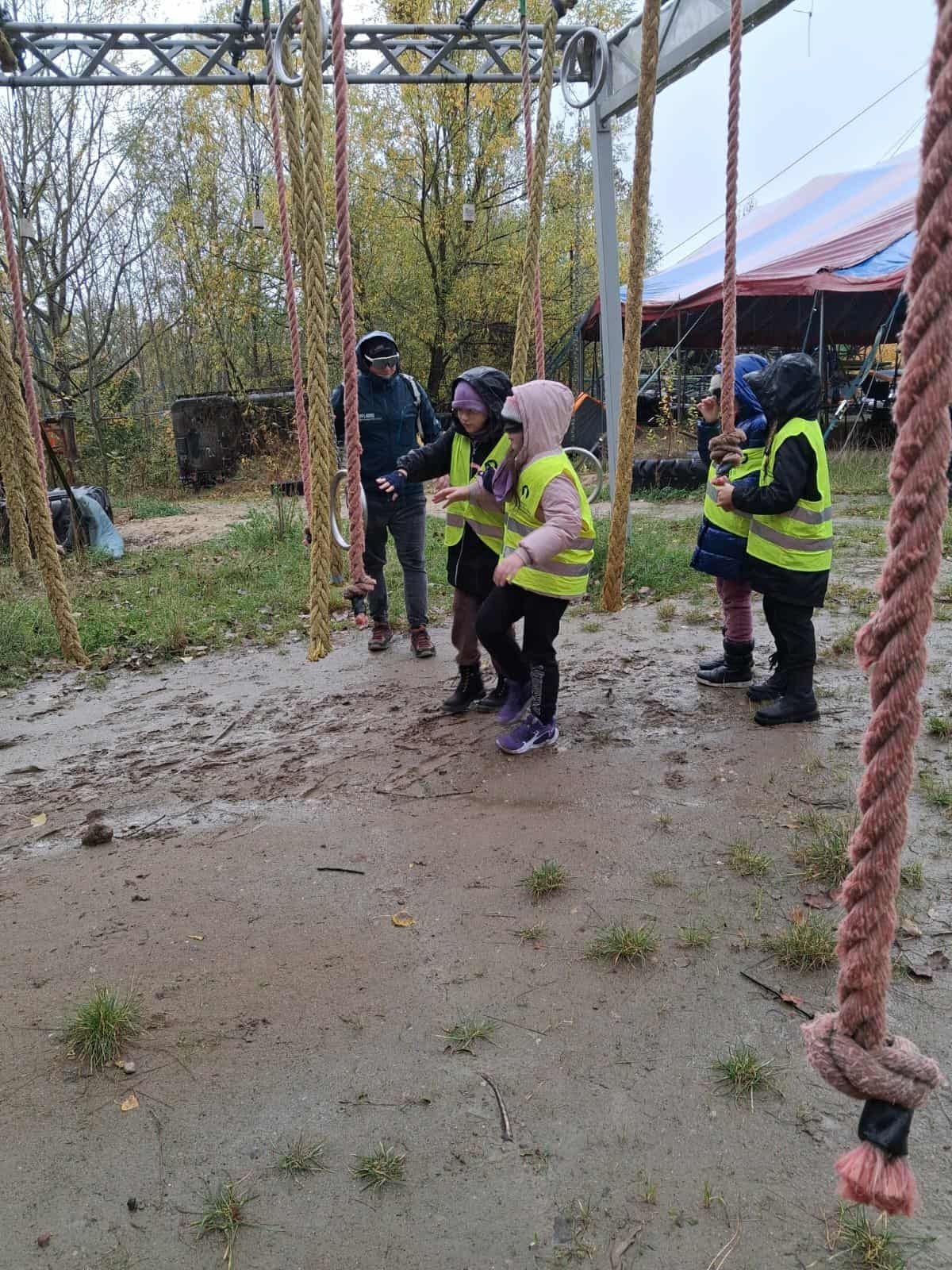 W piątek, klasy 3 i 4 wybrały się na wycieczkę do Parku Adventure w Gdyni Kolibkach. Już sama podróż była dla nas przygodą – wyruszyliśmy pociągiem, co dla wielu uczniów było miłą odmianą od codziennych dojazdów. W wagonach panowała radosna atmosfera: śmiech, rozmowy i wspólne podziwianie widoków za oknem sprawiły, że droga minęła nam bardzo szybko. Po dotarciu na miejsce powitał nas zespół instruktorów, którzy zaprosili nas do udziału w zabawie. Czekały na nas różnorodne zadania terenowe wymagające współpracy i zaangażowania, ucząc przy tym planowania, komunikacji i wzajemnego zaufania. Choć pogoda nie do końca nam sprzyjała – chwilami padał deszcz, a niebo było zasnute chmurami – nikt nie tracił dobrego humoru. Kurtki przeciwdeszczowe i szerokie uśmiechy wystarczyły, by nawet w kroplach deszczu znaleźć przyjemność ze wspólnej zabawy. Po intensywnych zajęciach przyszedł czas na krótki odpoczynek, ognisko, ciepłą herbatę i wspólne rozmowy pod wiatą. Pełni wrażeń i nowych doświadczeń wróciliśmy do szkoły, nieco zmęczeni, ale zadowoleni. Ta wycieczka pokazała nam, że nawet deszczowa pogoda nie jest w stanie popsuć dobrej zabawy, jeśli towarzyszy jej świetna ekipa i duch przygody!
