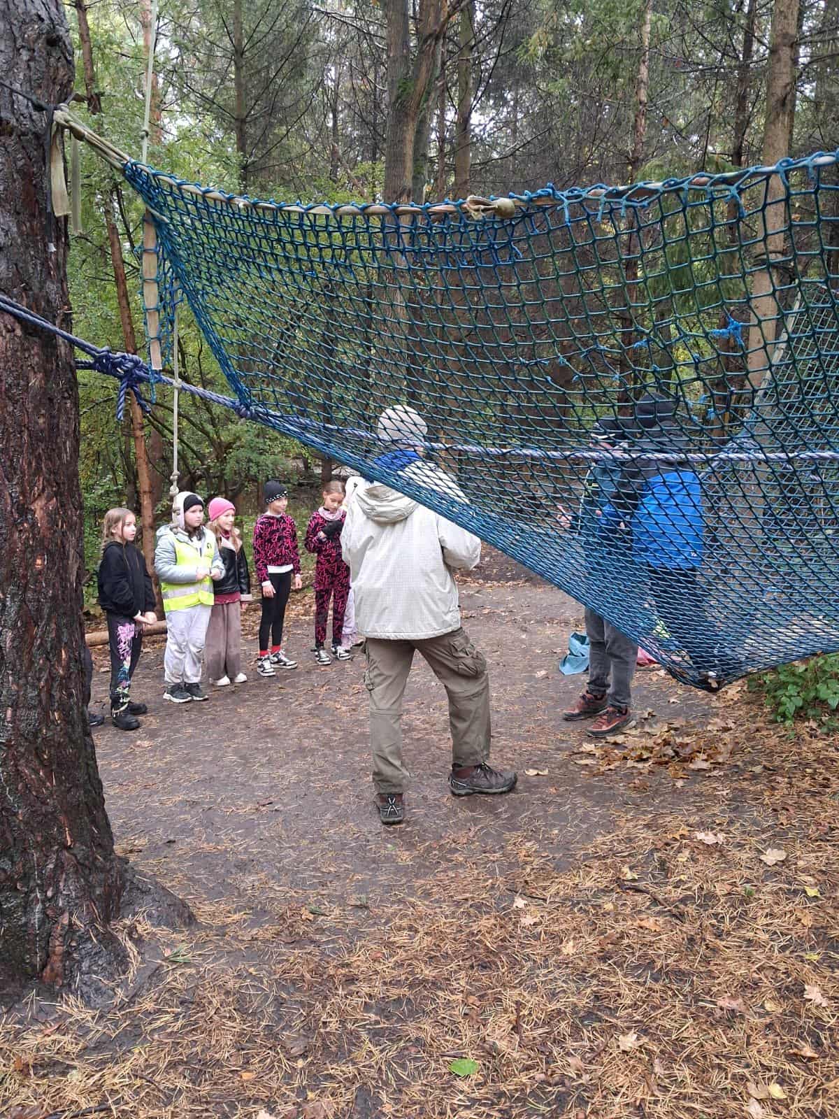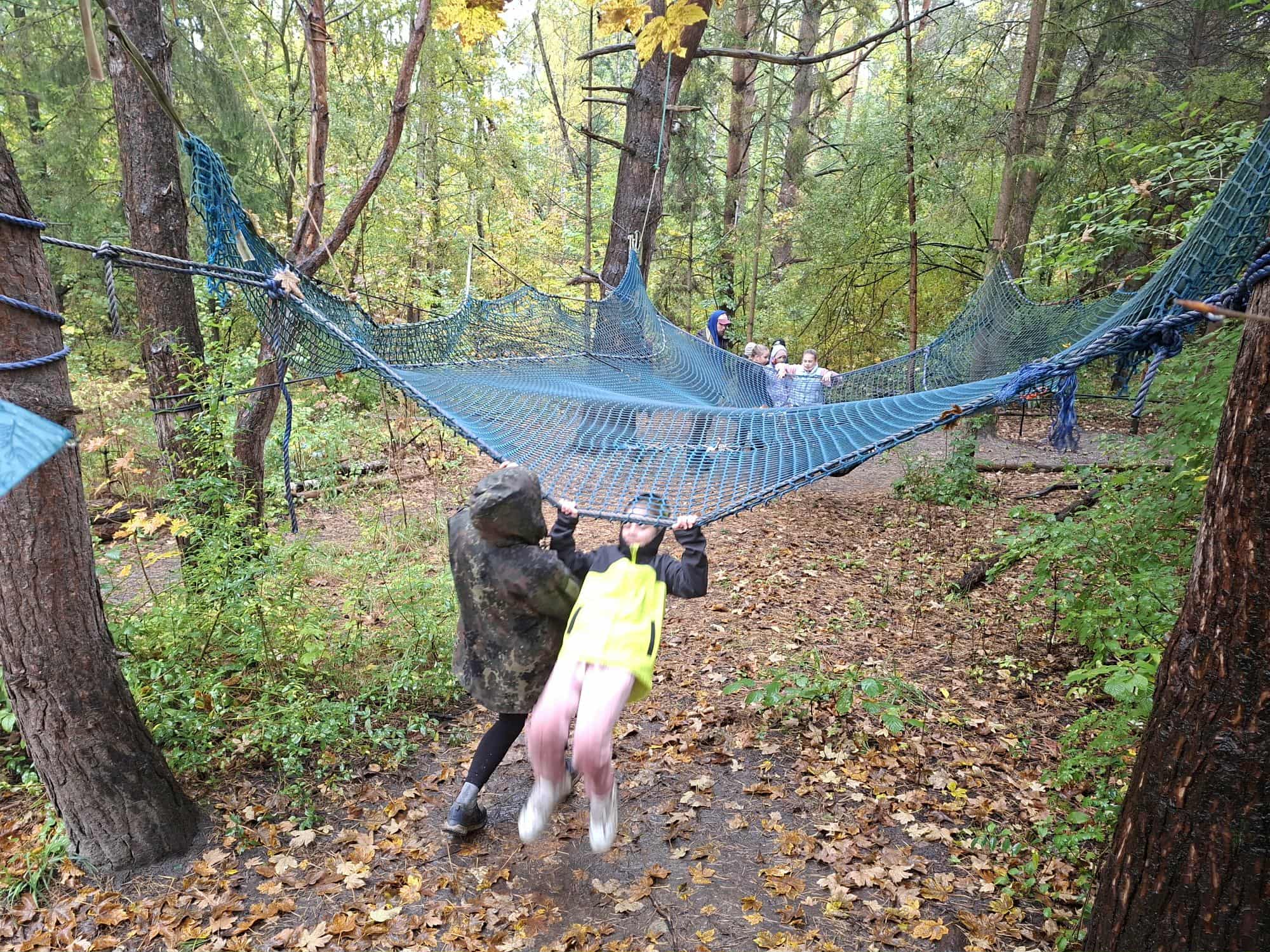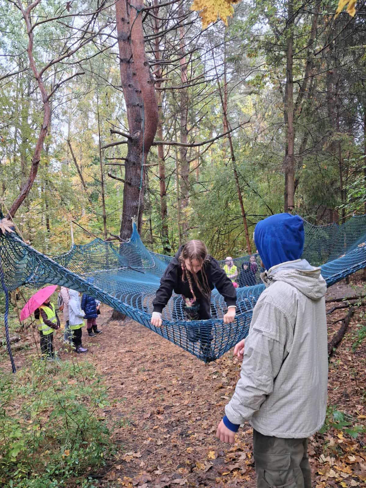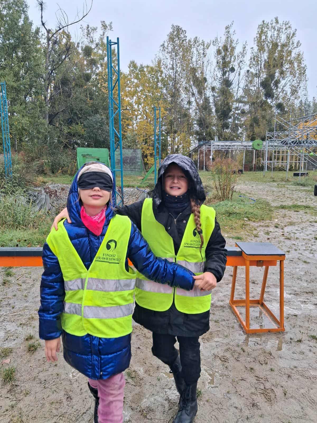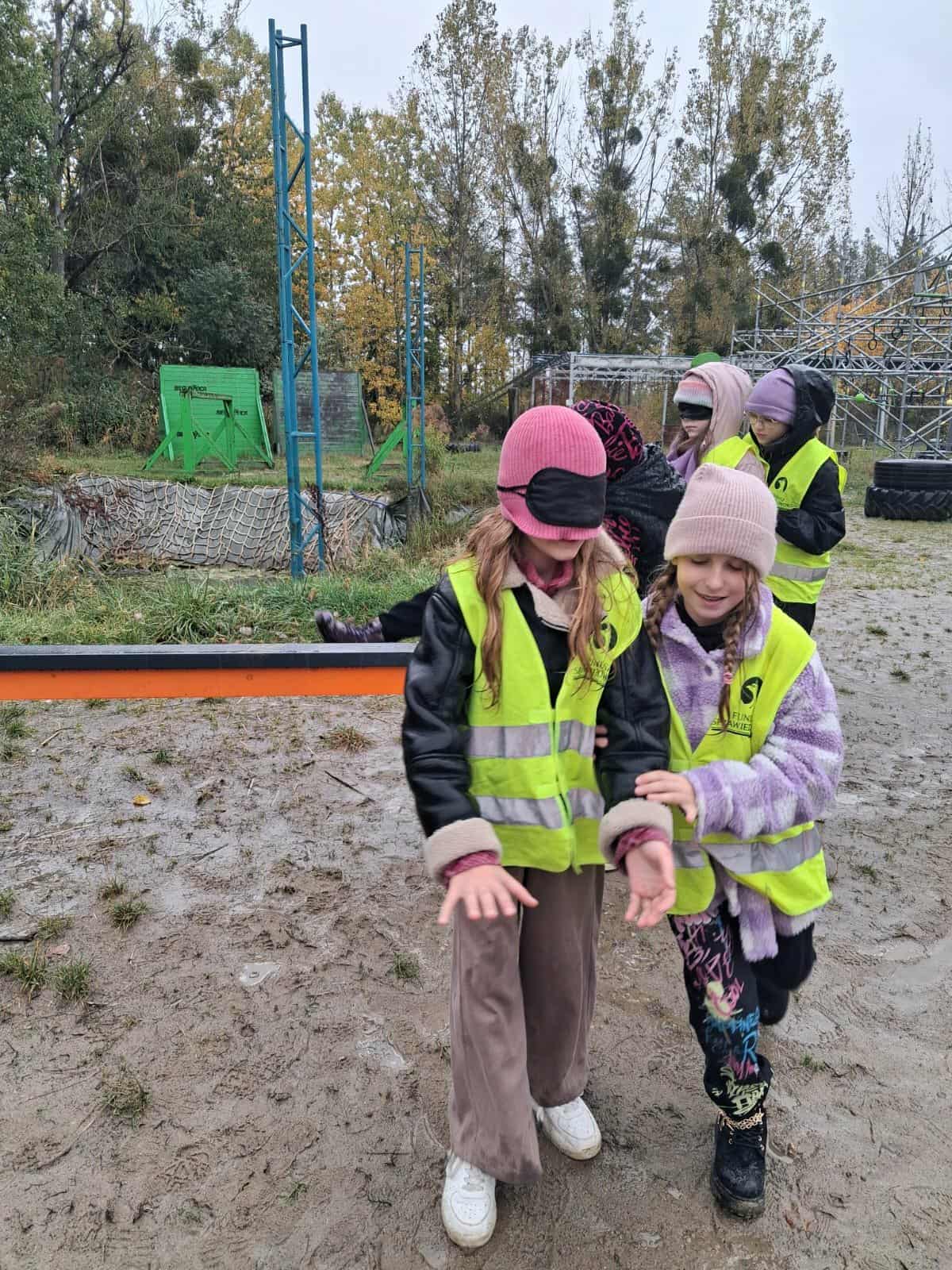 W piątek, klasy 3 i 4 wybrały się na wycieczkę do Parku Adventure w Gdyni Kolibkach. Już sama podróż była dla nas przygodą – wyruszyliśmy pociągiem, co dla wielu uczniów było miłą odmianą od codziennych dojazdów. W wagonach panowała radosna atmosfera: śmiech, rozmowy i wspólne podziwianie widoków za oknem sprawiły, że droga minęła nam bardzo szybko. Po dotarciu na miejsce powitał nas zespół instruktorów, którzy zaprosili nas do udziału w zabawie. Czekały na nas różnorodne zadania terenowe wymagające współpracy i zaangażowania, ucząc przy tym planowania, komunikacji i wzajemnego zaufania. Choć pogoda nie do końca nam sprzyjała – chwilami padał deszcz, a niebo było zasnute chmurami – nikt nie tracił dobrego humoru. Kurtki przeciwdeszczowe i szerokie uśmiechy wystarczyły, by nawet w kroplach deszczu znaleźć przyjemność ze wspólnej zabawy. Po intensywnych zajęciach przyszedł czas na krótki odpoczynek, ognisko, ciepłą herbatę i wspólne rozmowy pod wiatą. Pełni wrażeń i nowych doświadczeń wróciliśmy do szkoły, nieco zmęczeni, ale zadowoleni. Ta wycieczka pokazała nam, że nawet deszczowa pogoda nie jest w stanie popsuć dobrej zabawy, jeśli towarzyszy jej świetna ekipa i duch przygody!