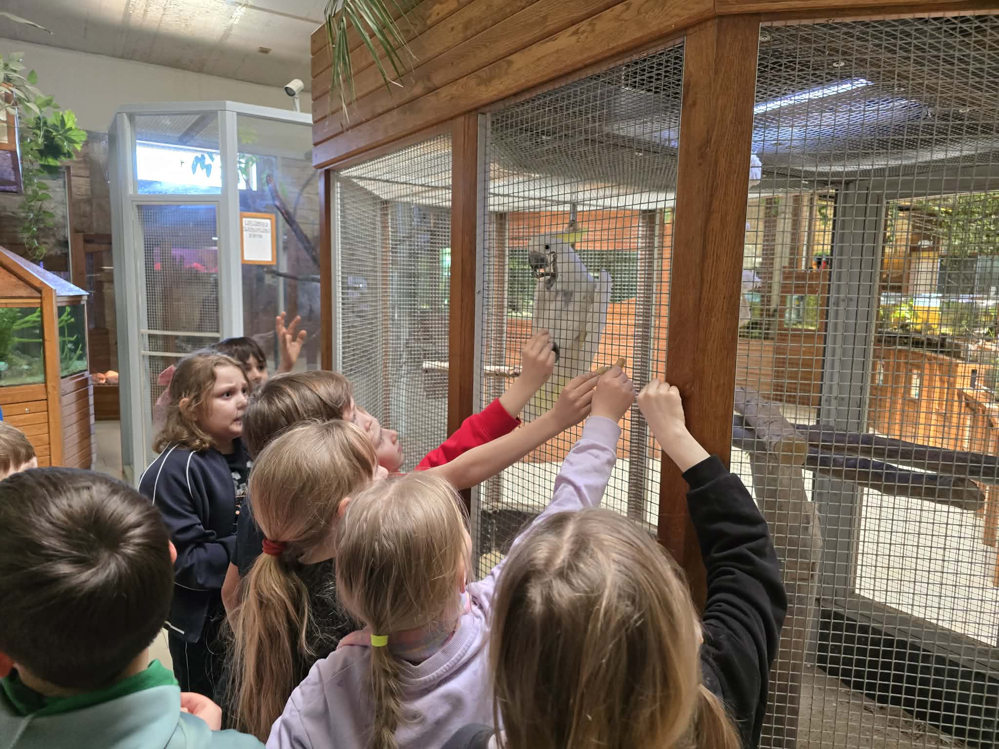Dzieci mogły karmić wiewiórki, papugi i lemury, co wzbudziło ogromne zainteresowanie i radość. Szczególnym przeżyciem była możliwość dotknięcia agawy oraz potrzymania w rękach węży i żółwi. Uczniowie z ciekawością przyglądali się także mniej oczywistym mieszkańcom zoo, takim jak pająki czy karaczany, a także podziwiali niezwykłe koty sawannowe. Każde z tych spotkań było nie tylko emocjonujące, ale również edukacyjne – pozwalało lepiej zrozumieć różnorodność świata przyrody.