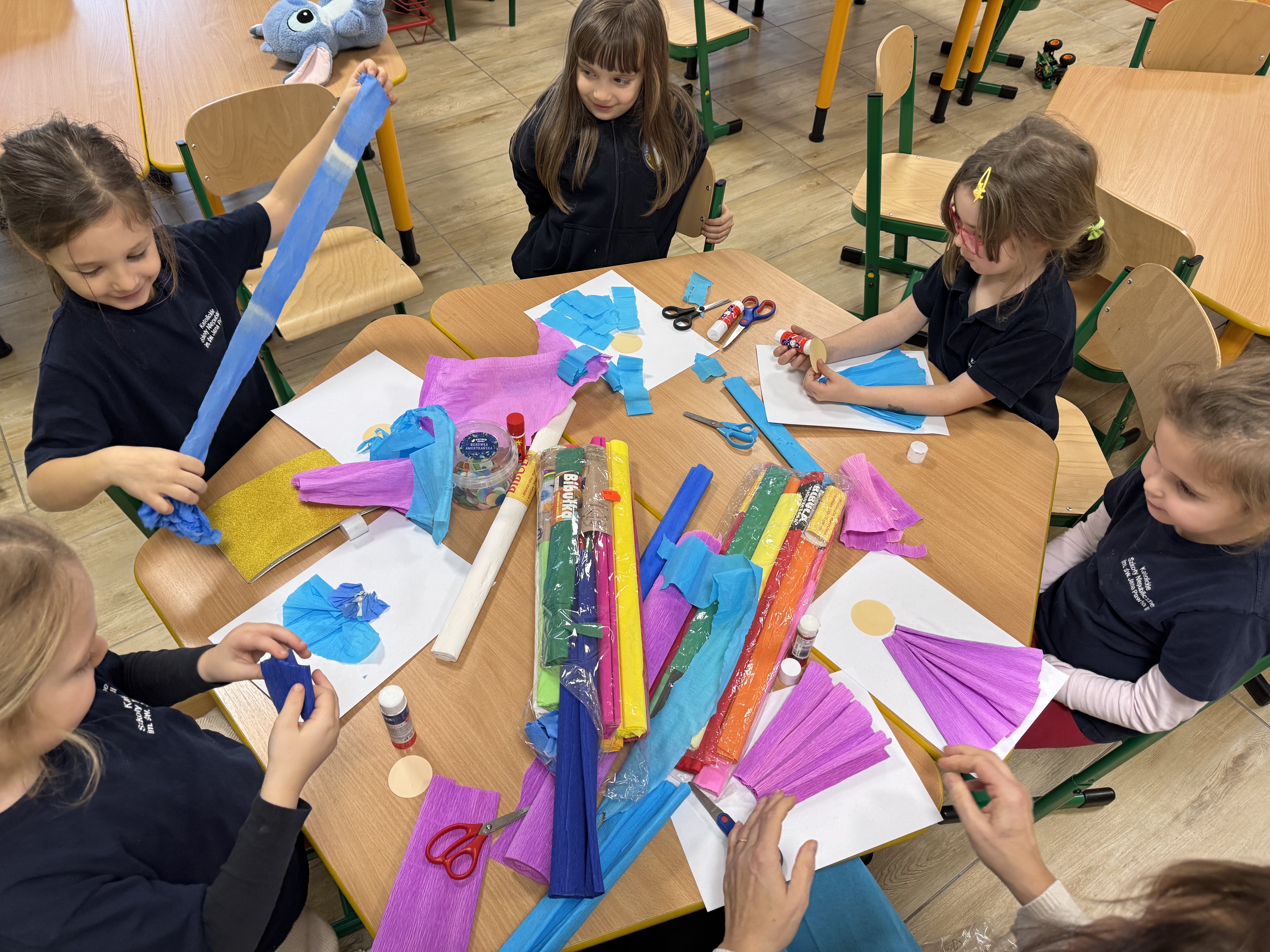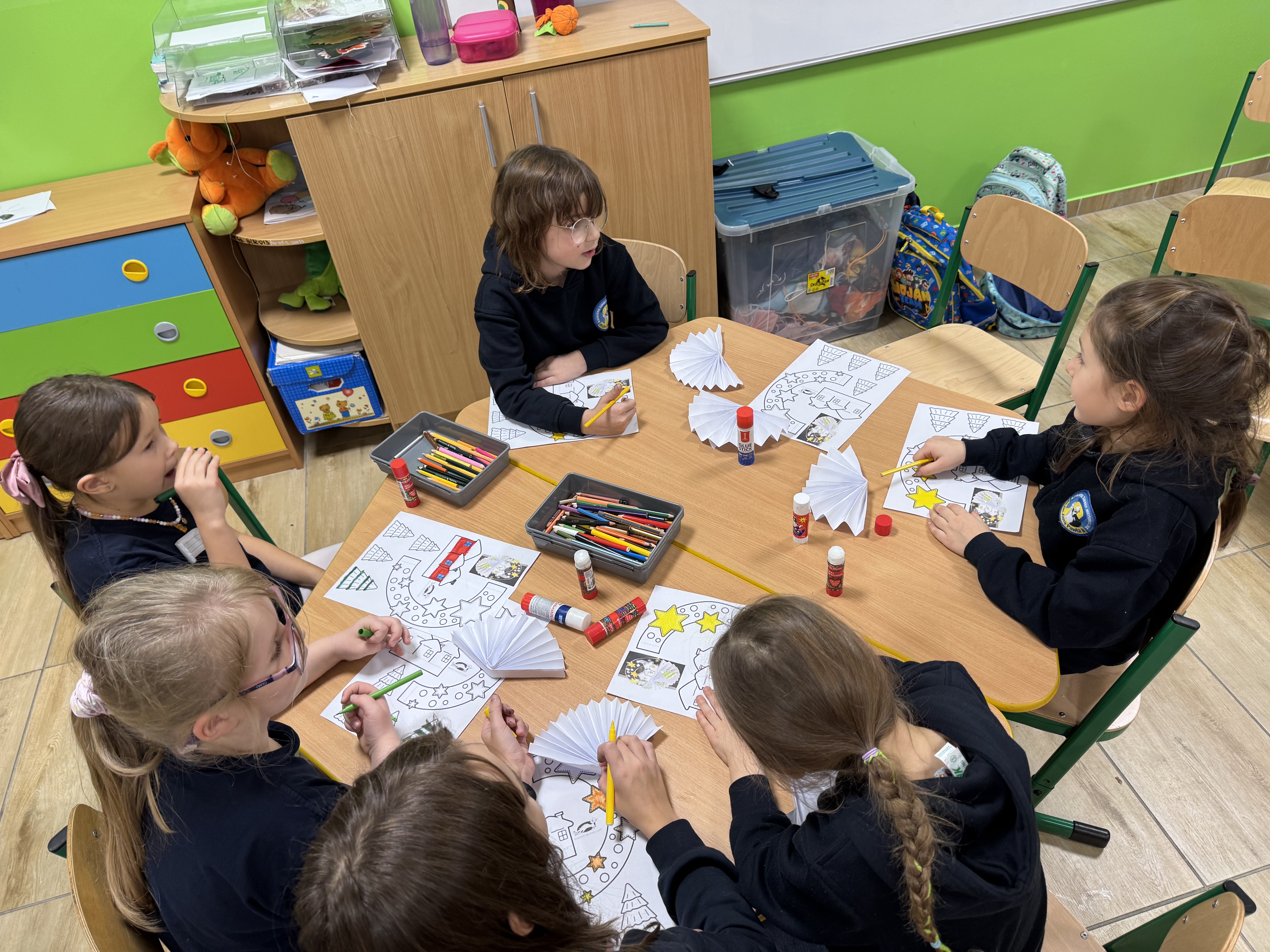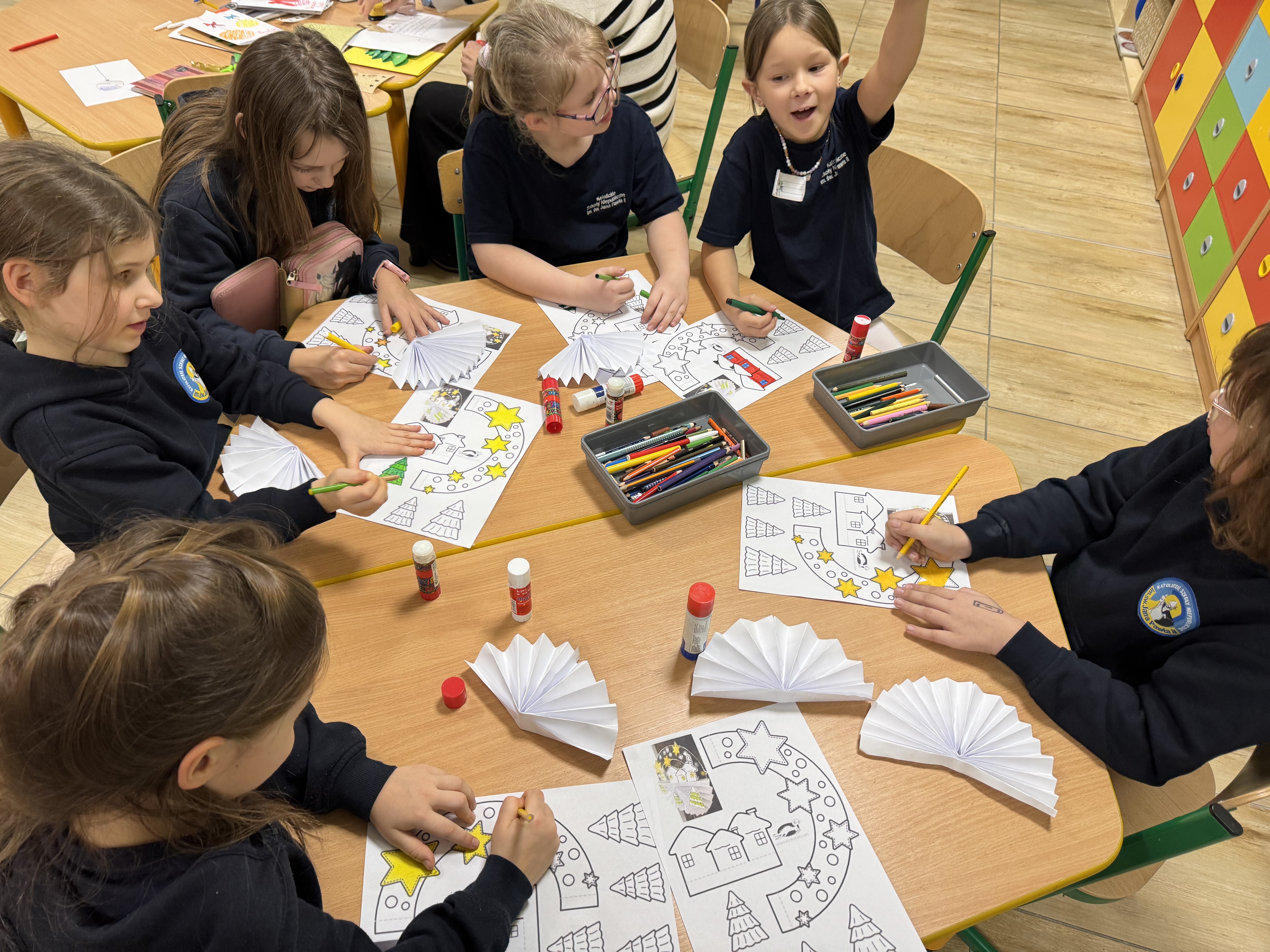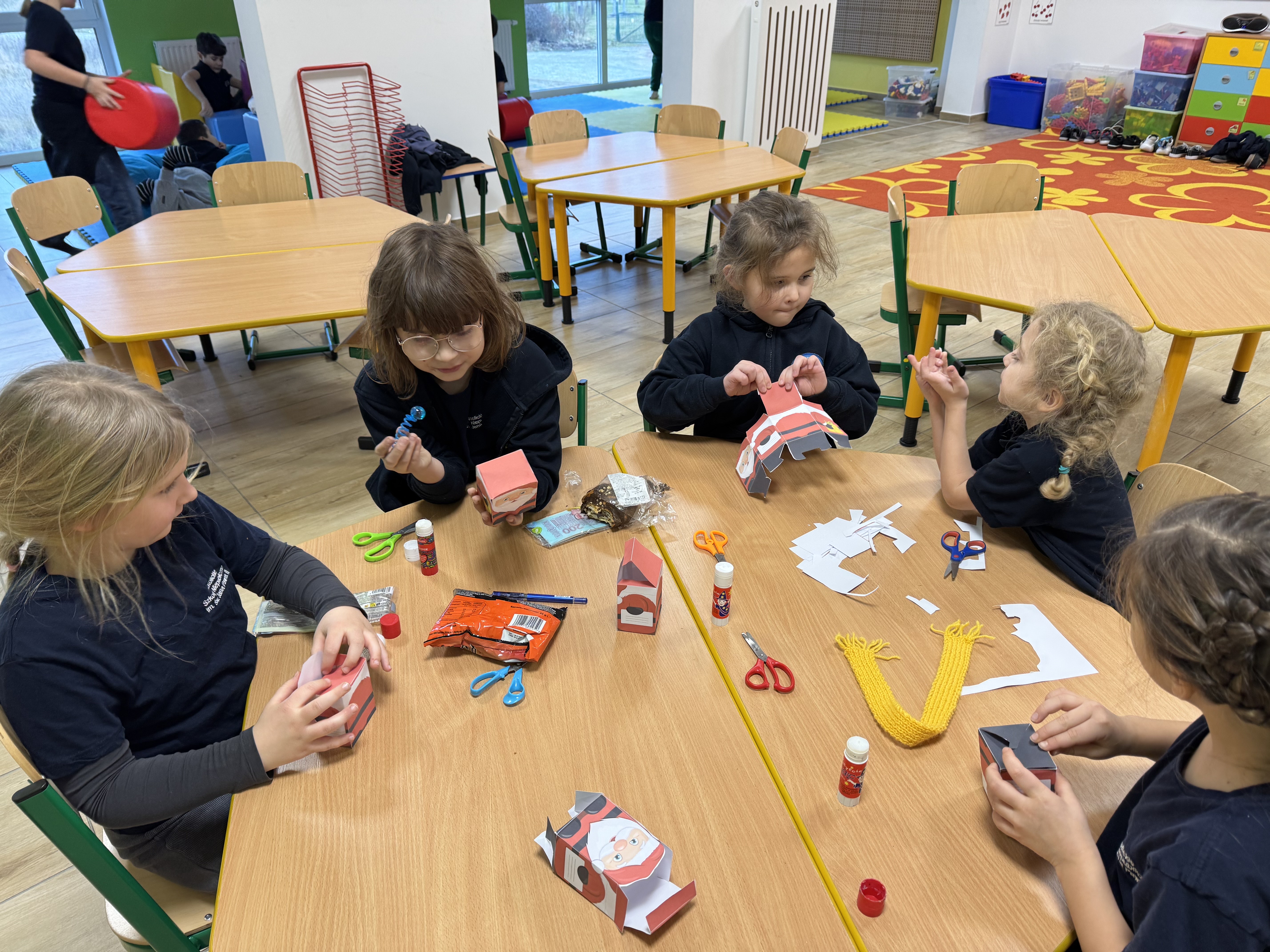 W grudniu w świetlicy szkolnej realizowano zajęcia plastyczno-techniczne związane z zimą oraz tradycjami bożonarodzeniowymi. Dzieci wykonywały m.in. kartki świąteczne, ozdoby choinkowe, aniołki, oraz prace przedstawiające zimowe pejzaże. W trakcie zajęć uczniowie posługiwali się różnymi technikami, takimi jak wycinanie, klejenie, malowanie, wyklejanie oraz praca z papierem kolorowym, bibułą i materiałami naturalnymi. Zajęcia sprzyjały rozwijaniu motoryki małej, cierpliwości, współpracy w grupie oraz kształtowały poczucie estetyki.