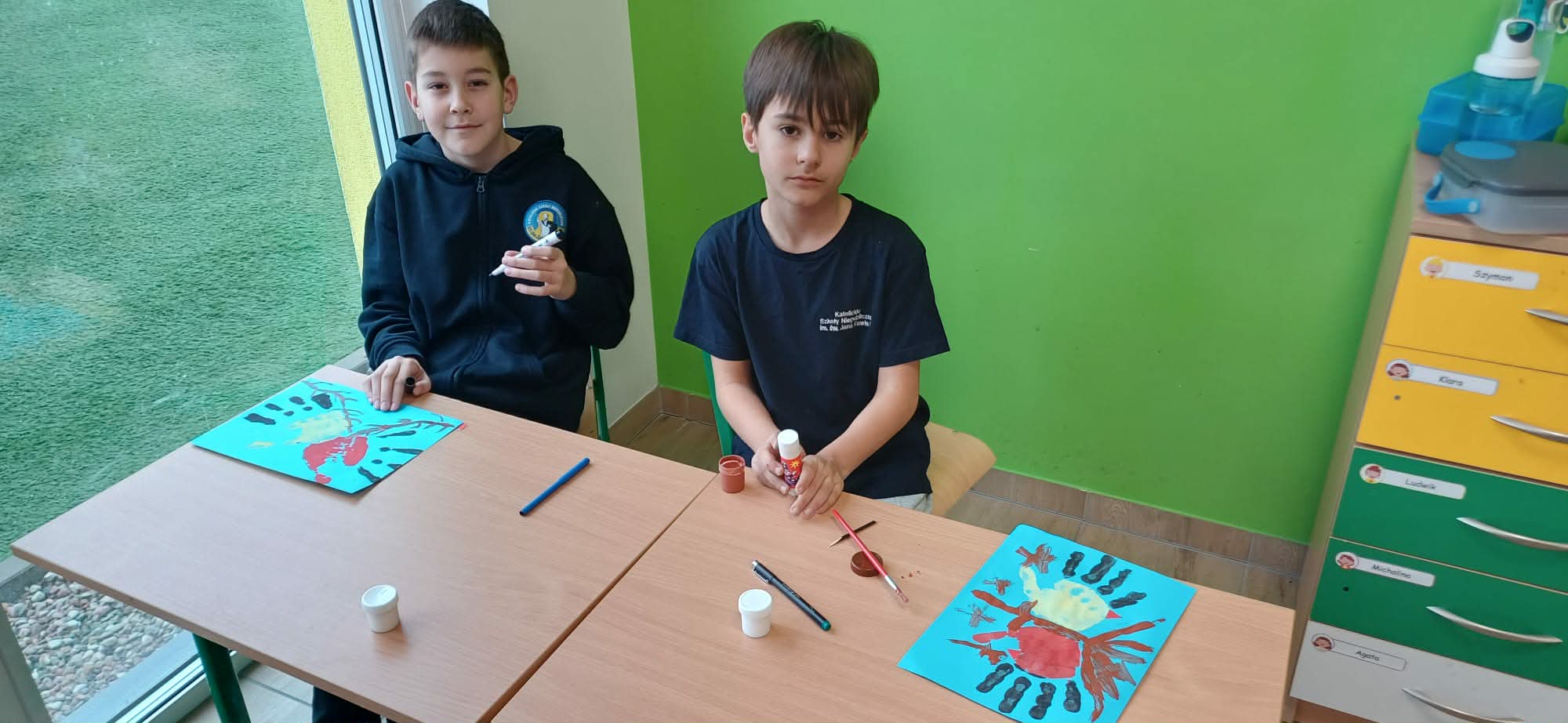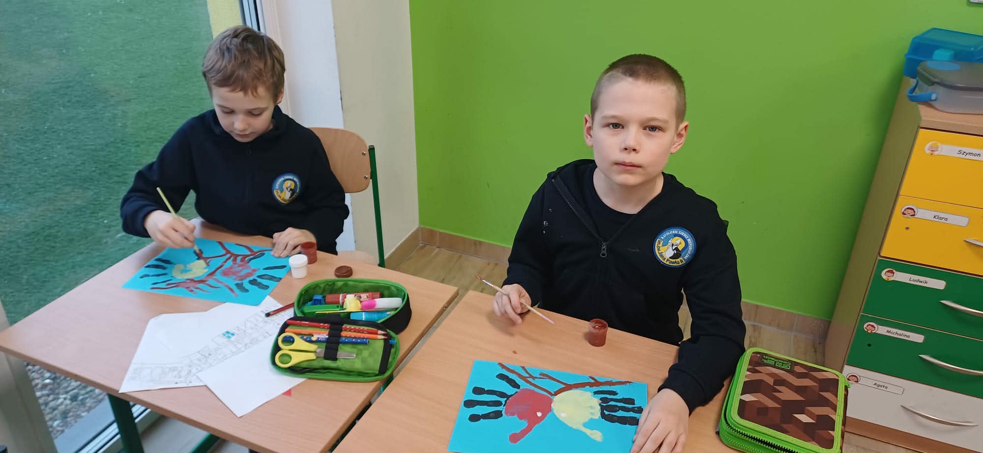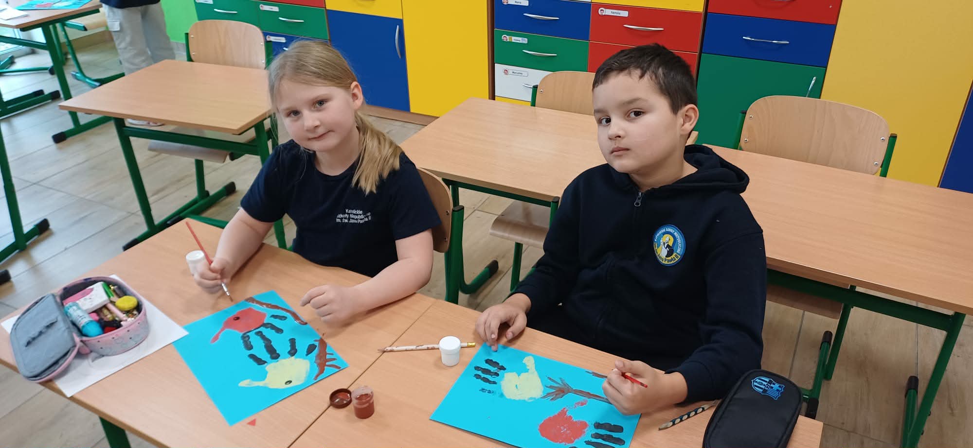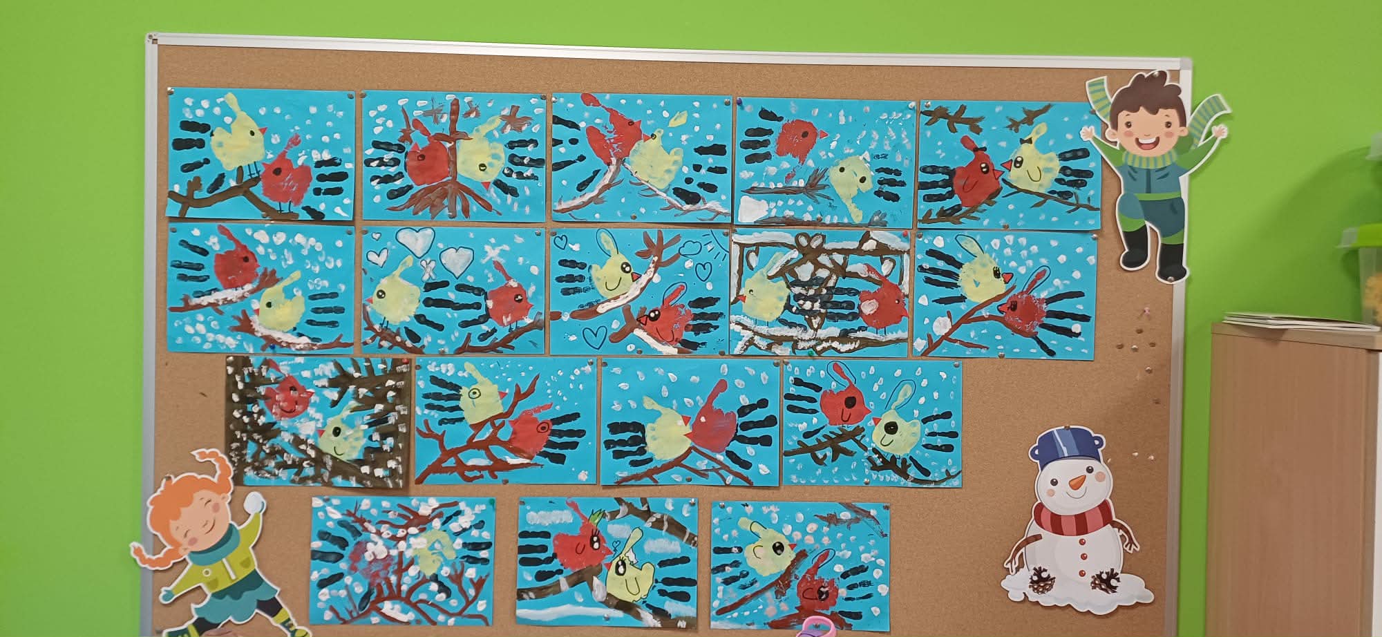 Zainspirowani zbliżającą się porą roku, drugoklasiści postanowili uwiecznić na papierze urok zimy i jej skrzydlatych mieszkańców. Rozpoczęli od pomalowania swoich dłoni kolorowymi farbami, a następnie odcisnęli je na kartkach. W ten sposób, w mgnieniu oka, powstały urocze sylwetki ptaków, gotowych na nadejście zimy.